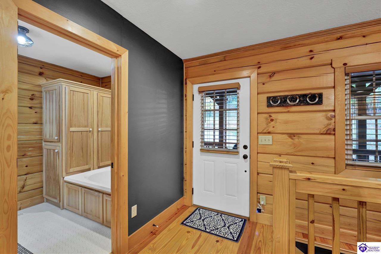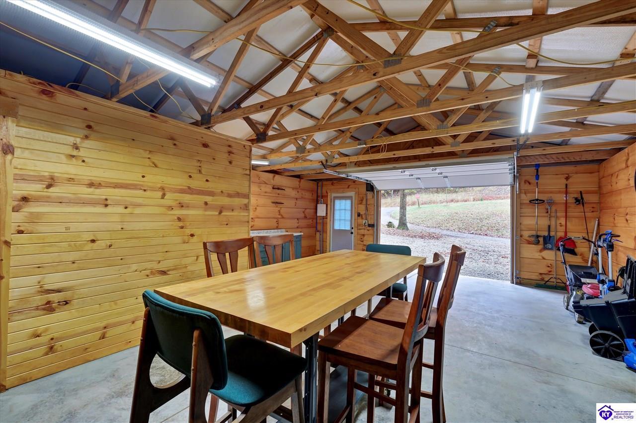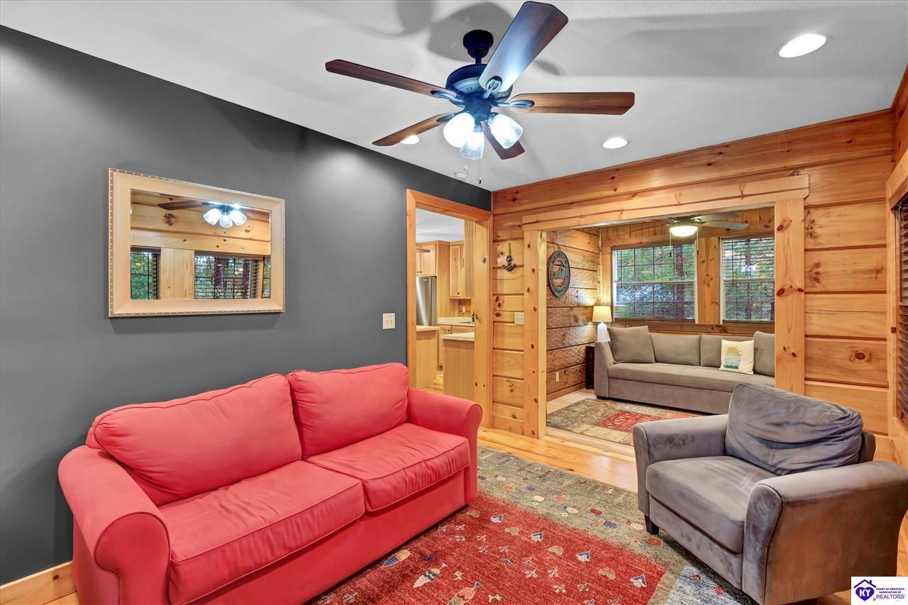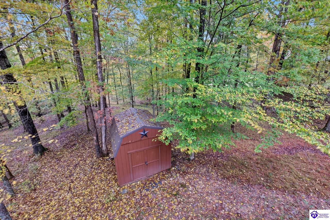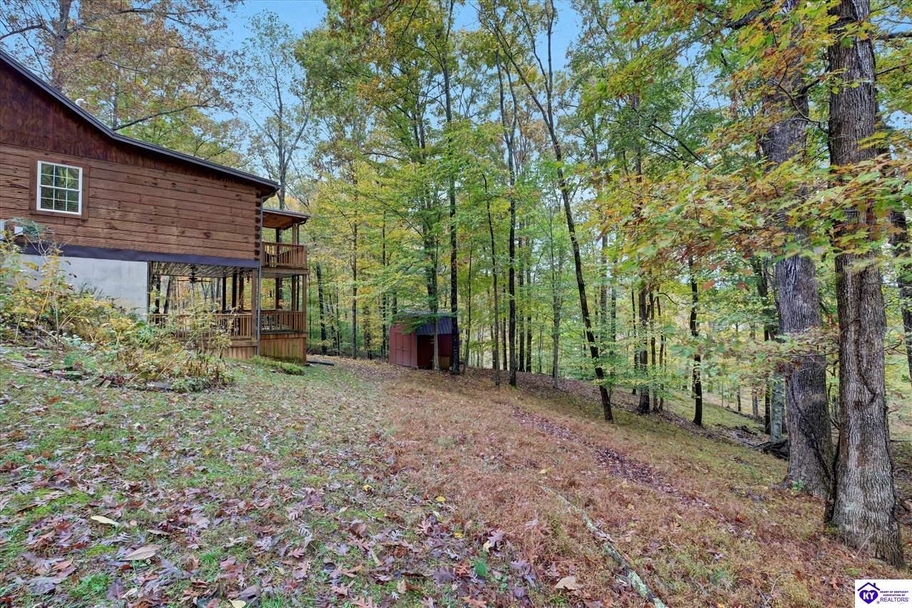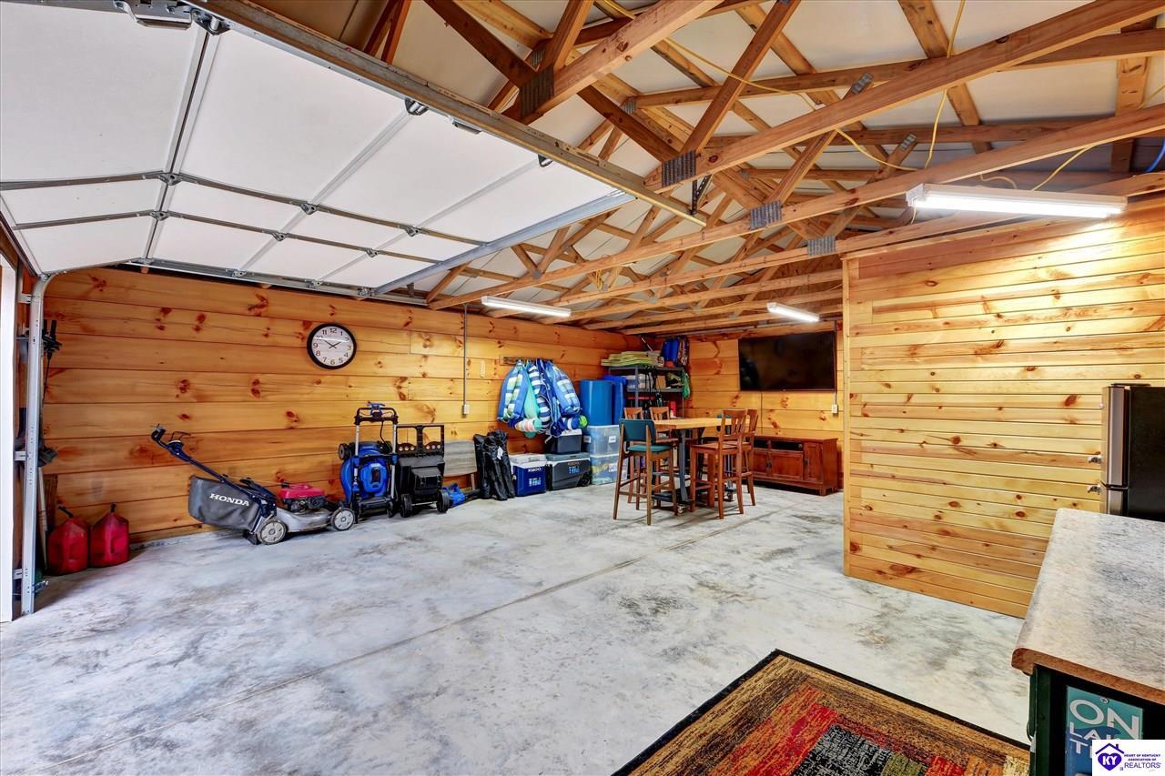 Realtor's notes: Welcome to your private log retreat at beautiful Nolin Lake! Nestled in the gated Michaels Cove Subdivision, this charming log home offers the perfect blend of rustic warmth and modern convenience. Relax on the inviting rocking chair front porch or enjoy peaceful lake evenings from the covered rear deck overlooking the wooded surroundings. Inside, the spacious kitchen with center island opens to the cozy family room and adjoining sleeping area, providing an open, cabin-style flow ideal for gatherings. The main level bedroom and full bath with a large garden tub make it easy to unwind after a fun filled day on the lake. The walkout lower level includes an additional bedroom, full bath, and laundry area—perfect for guests or extended stays. (Note: Bedrooms do not have closets and are More...non-conforming, though typical for the area.) Step outside to a covered lower deck, where you can still enjoy the great outdoors even when spring showers roll through. The detached garage with a full bath offers versatile space ideal for storing lake toys, taking a quick shower after time on the water, or transforming into a great party area for entertaining family and friends. The 10'x10' shed is perfect for extra storage. There is over 600 sq ft of decking and porch areas to enjoy the views. The home sits on two lots totaling 1.01 acres, offering privacy and space to relax. Your dock is just a short RTV ride away, and with the boat ramp and marina less than 1.5 miles away, lake days couldn't be more convenient. Dock will transfer with the Corp of Engineers approval. No rentals allowed, ensuring a peaceful neighborhood and protecting your investment. Start making lake memories to last a lifetime! Neighborhood info- https://webmasteroaklandhi.wixsite.com/mysite/bylaws-restrictions-1