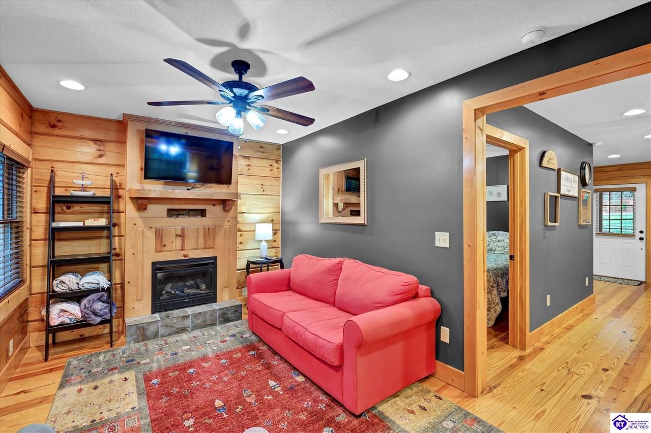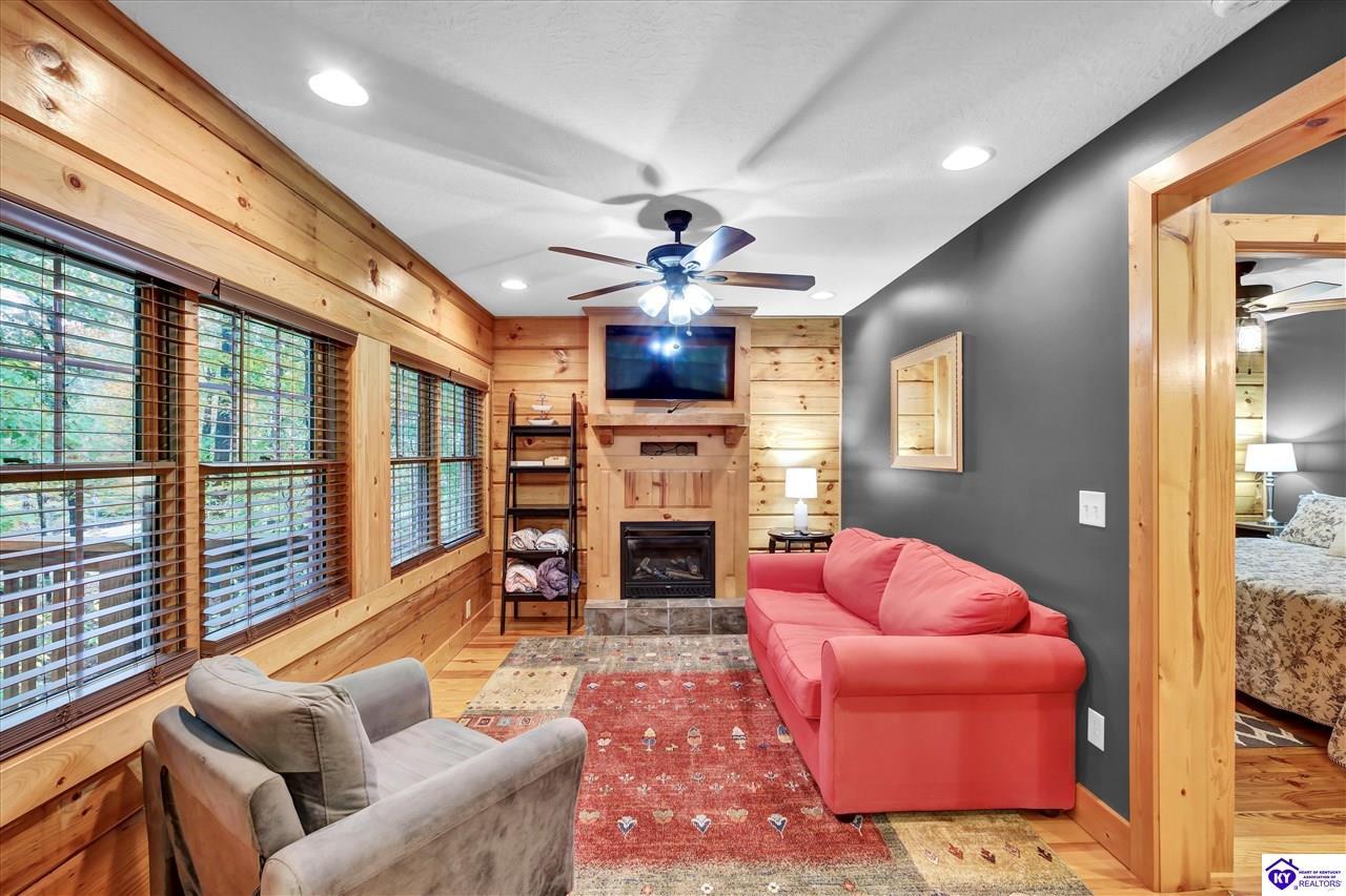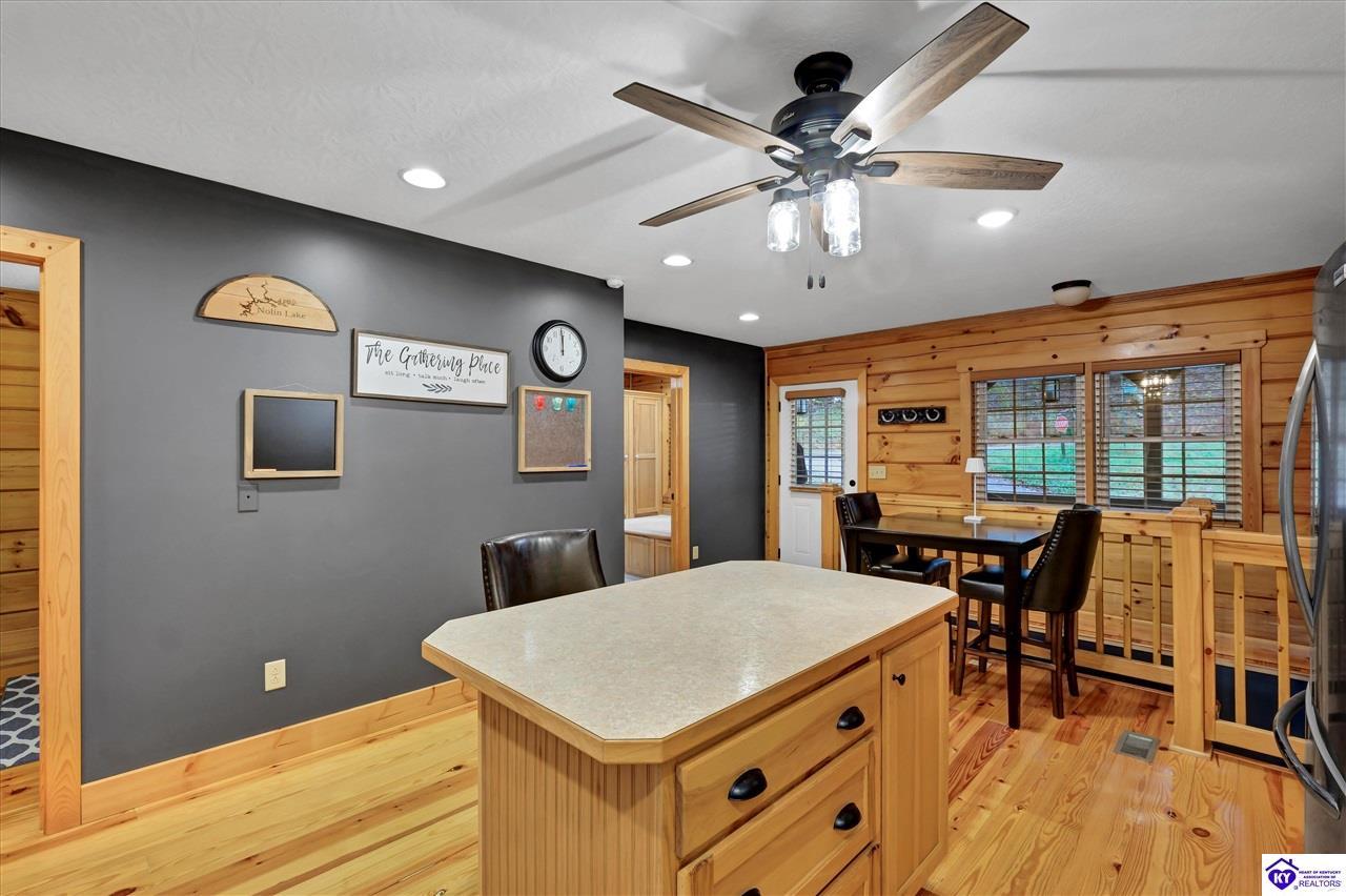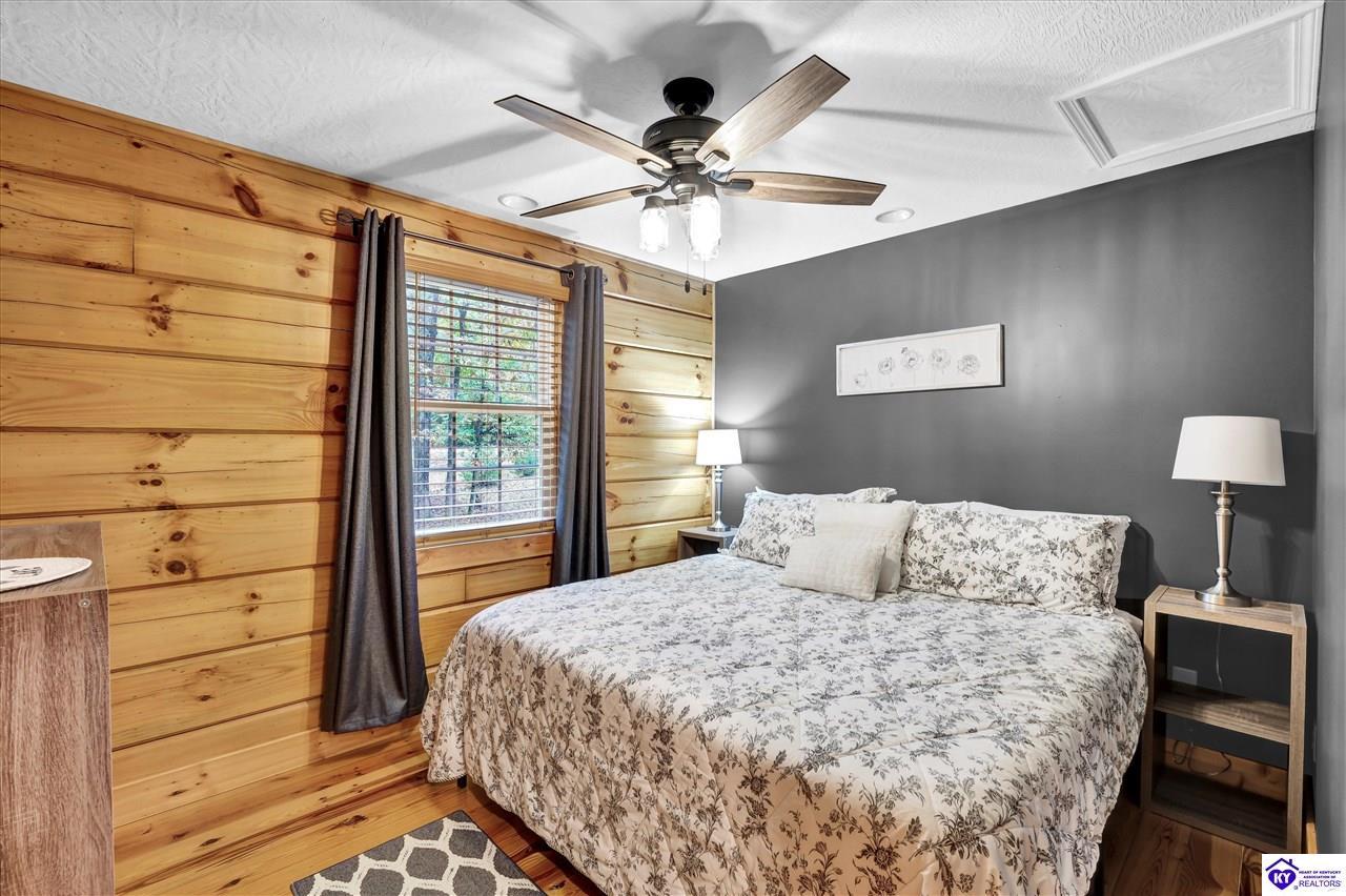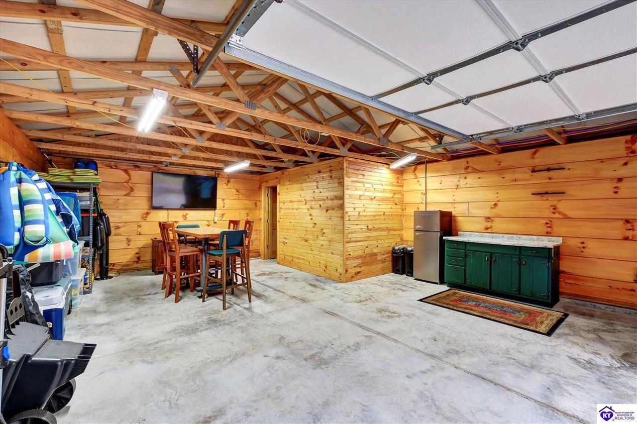 Realtor's notes: Welcome to your private log retreat at beautiful Nolin Lake! Nestled in the gated Michaels Cove Subdivision, this charming log home offers the perfect blend of rustic warmth and modern convenience. Relax on the inviting rocking chair front porch or enjoy peaceful lake evenings from the covered rear deck overlooking the wooded surroundings. Inside, the spacious kitchen with center island opens to the cozy family room and adjoining sleeping area, providing an open, cabin-style flow ideal for gatherings. The main level bedroom and full bath with a large garden tub make it easy to unwind after a fun filled day on the lake. The walkout lower level includes an additional bedroom, full bath, and laundry area—perfect for guests or extended stays. (Note: Bedrooms do not have closets and are More...non-conforming, though typical for the area.) Step outside to a covered lower deck, where you can still enjoy the great outdoors even when spring showers roll through. The detached garage with a full bath offers versatile space ideal for storing lake toys, taking a quick shower after time on the water, or transforming into a great party area for entertaining family and friends. The 10'x10' shed is perfect for extra storage. There is over 600 sq ft of decking and porch areas to enjoy the views. The home sits on two lots totaling 1.01 acres, offering privacy and space to relax. Your dock is just a short RTV ride away, and with the boat ramp and marina less than 1.5 miles away, lake days couldn't be more convenient. Dock will transfer with the Corp of Engineers approval. No rentals allowed, ensuring a peaceful neighborhood and protecting your investment. Start making lake memories to last a lifetime! Neighborhood info- https://webmasteroaklandhi.wixsite.com/mysite/bylaws-restrictions-1
