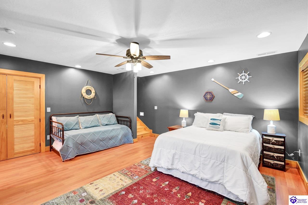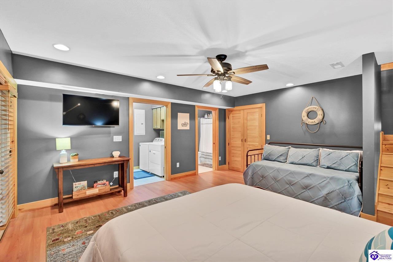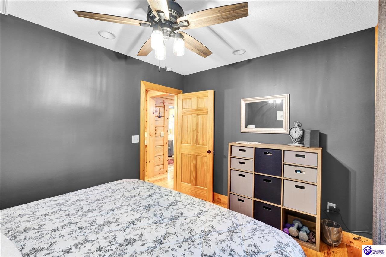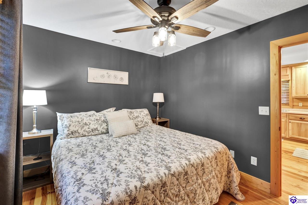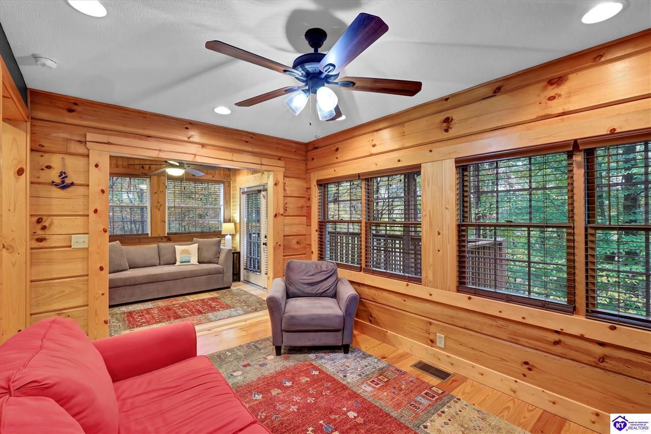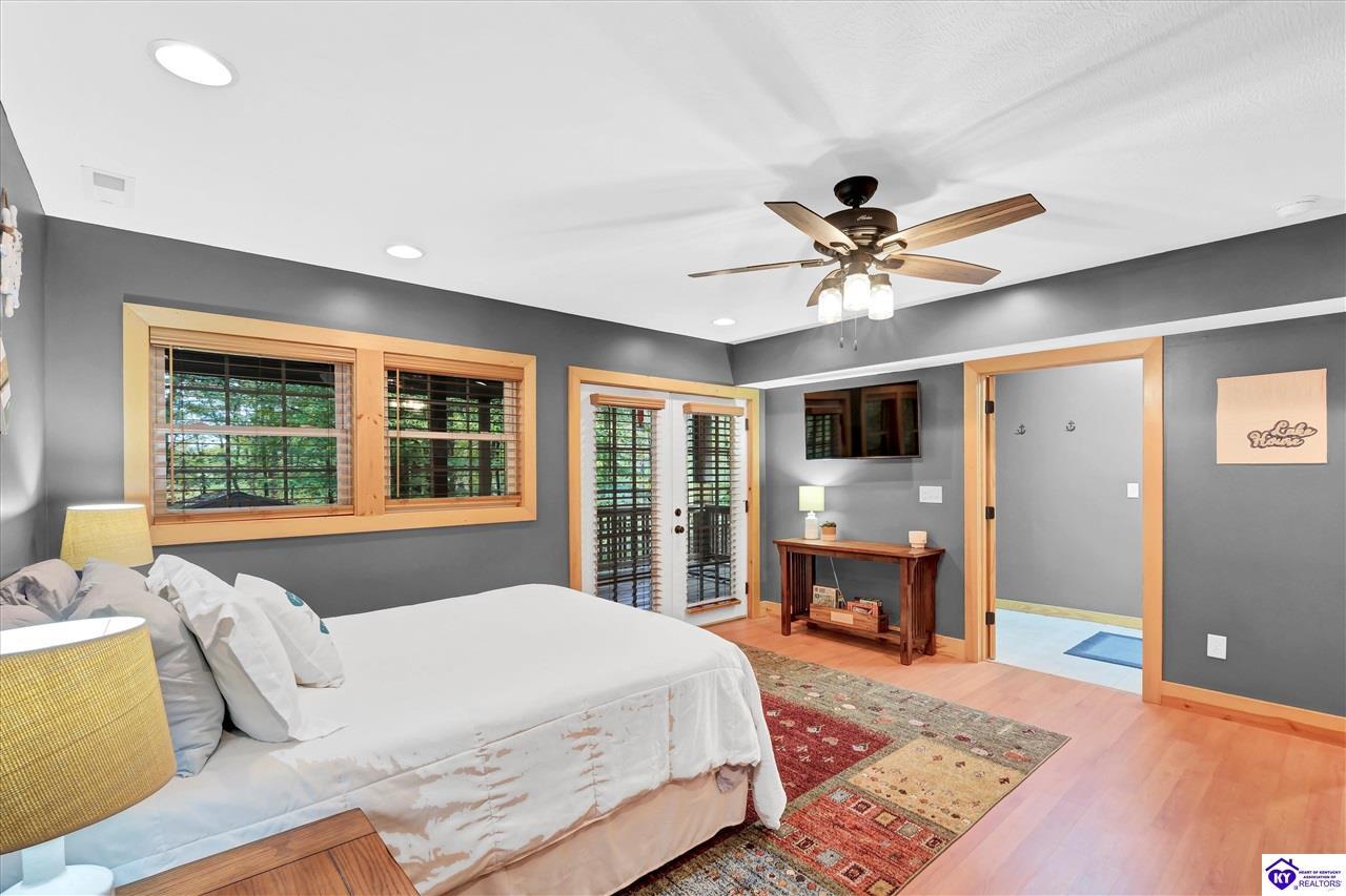 Realtor's notes: Welcome to your private log retreat at beautiful Nolin Lake! Nestled in the gated Michaels Cove Subdivision, this charming log home offers the perfect blend of rustic warmth and modern convenience. Relax on the inviting rocking chair front porch or enjoy peaceful lake evenings from the covered rear deck overlooking the wooded surroundings. Inside, the spacious kitchen with center island opens to the cozy family room and adjoining sleeping area, providing an open, cabin-style flow ideal for gatherings. The main level bedroom and full bath with a large garden tub make it easy to unwind after a fun filled day on the lake. The walkout lower level includes an additional bedroom, full bath, and laundry area—perfect for guests or extended stays. (Note: Bedrooms do not have closets and are More...non-conforming, though typical for the area.) Step outside to a covered lower deck, where you can still enjoy the great outdoors even when spring showers roll through. The detached garage with a full bath offers versatile space ideal for storing lake toys, taking a quick shower after time on the water, or transforming into a great party area for entertaining family and friends. The 10'x10' shed is perfect for extra storage. There is over 600 sq ft of decking and porch areas to enjoy the views. The home sits on two lots totaling 1.01 acres, offering privacy and space to relax. Your dock is just a short RTV ride away, and with the boat ramp and marina less than 1.5 miles away, lake days couldn't be more convenient. Dock will transfer with the Corp of Engineers approval. No rentals allowed, ensuring a peaceful neighborhood and protecting your investment. Start making lake memories to last a lifetime! Neighborhood info- https://webmasteroaklandhi.wixsite.com/mysite/bylaws-restrictions-1