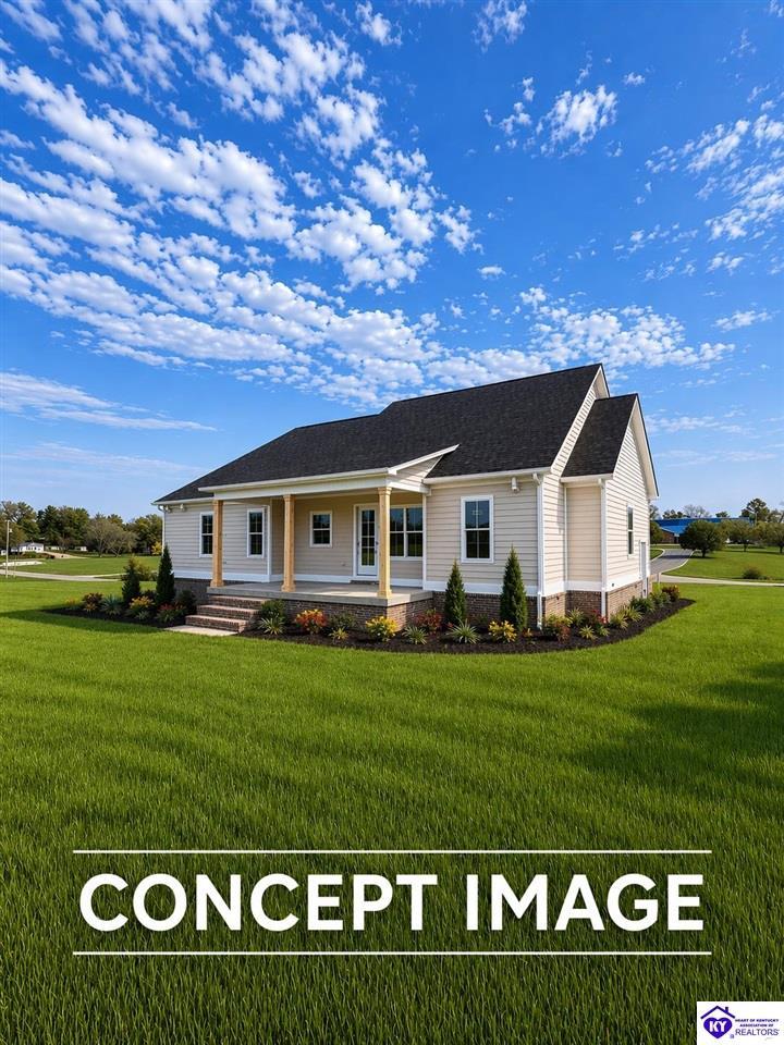 Realtor's notes: Looking for your new home? This stunning new construction brick ranch is perfectly positioned near the Vine Grove Golf Course, offering beautiful views and peaceful surroundings right in your backyard. Designed with both style and function in mind, this 4-bedroom, 2-bath home features a desirable split floor plan and open-concept layout—ideal for everyday living and entertaining. The spacious living area is anchored by a sleek electric fireplace with custom floating shelves, creating a warm and inviting focal point. The kitchen is a showstopper with granite countertops, custom cabinetry, a walk-in pantry, and plenty of prep space. Luxury vinyl plank flooring flows throughout the home, adding durability and modern appeal. The private primary suite includes a beautifully tiled walk-in shower and thoughtfully designed finishes that elevate the space. Enjoy morning coffee on the covered front porch and unwind in the evenings on the covered back porch overlooking the golf course—perfect for relaxing or hosting guests. If you’ve been dreaming of golf course living in a brand-new home with upscale details, this one is ready to welcome you home.