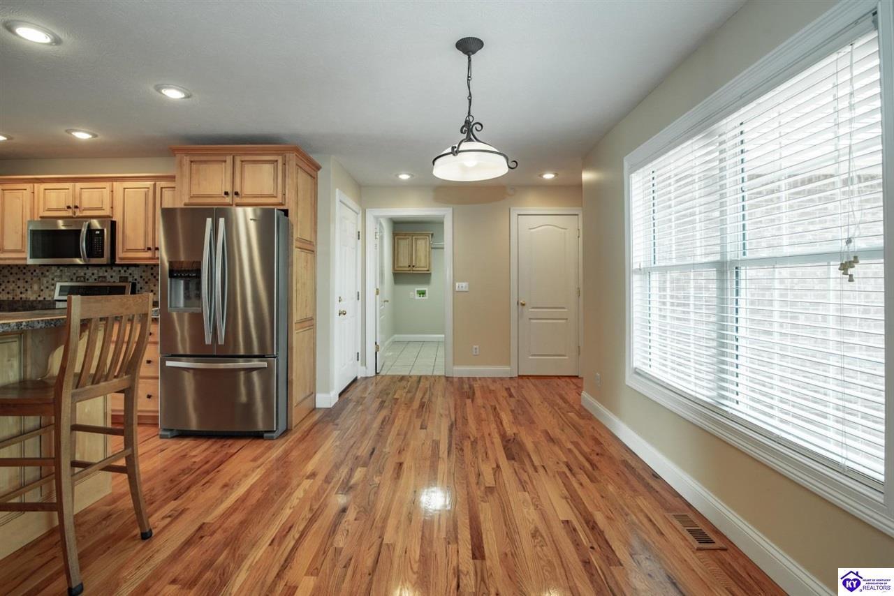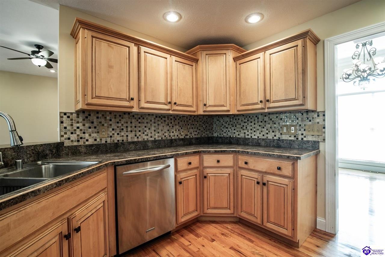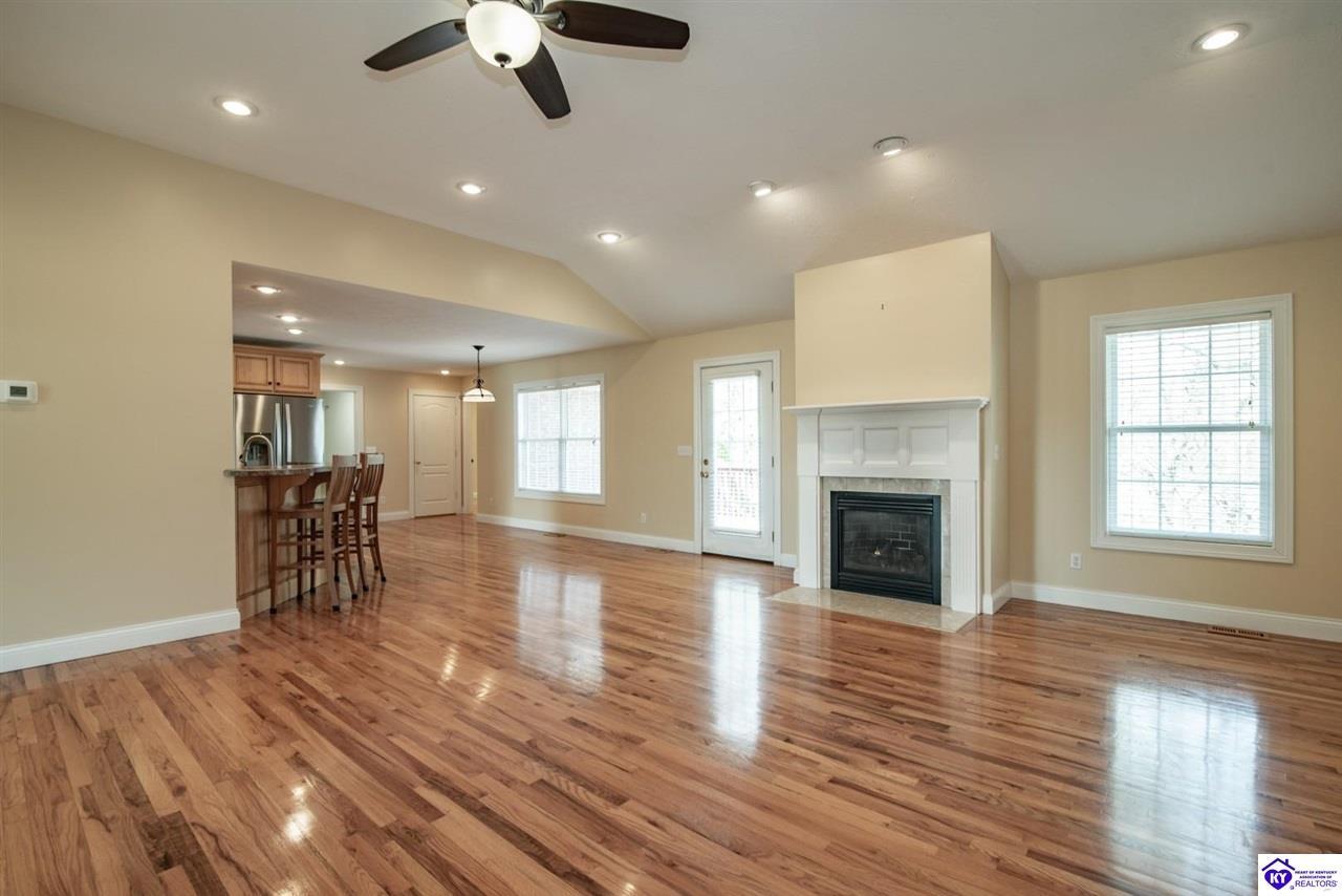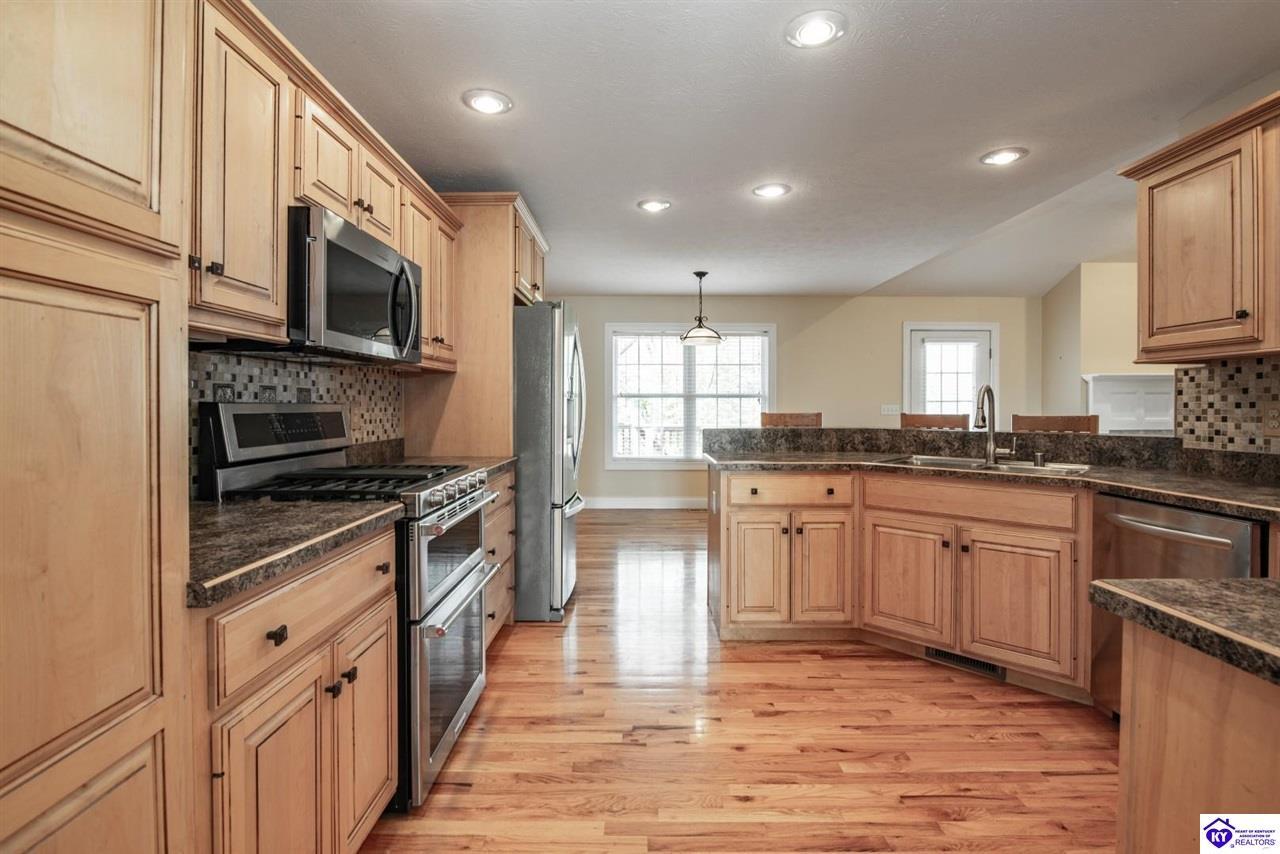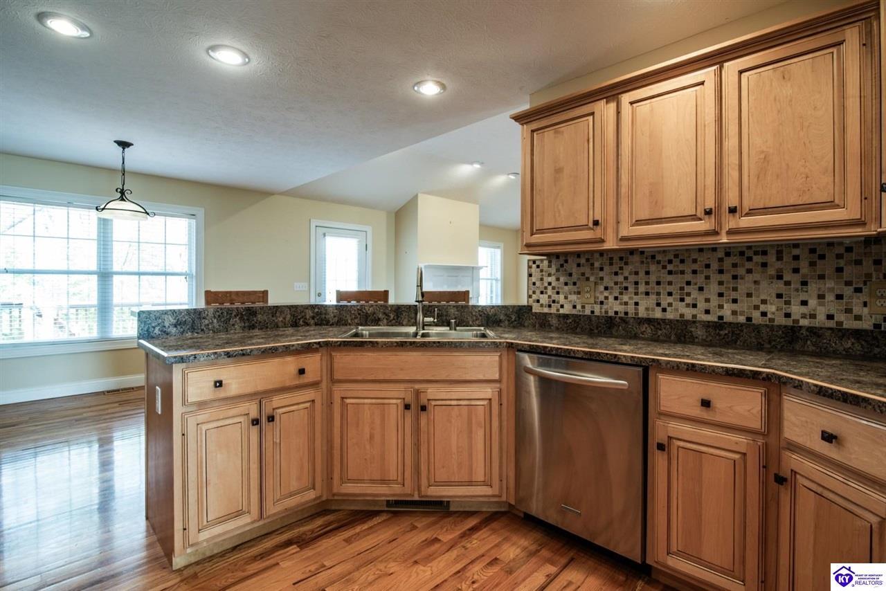 Realtor's notes: Welcome to your next chapter in the sought-after Woodsbend subdivision, where pride of ownership shines from every corner of this stunning 4-bedroom, 3-bathroom home. Step inside and prepare to be impressed. The foyer opens up into a spacious living room that greets you with vaulted ceilings, large windows that flood the space with natural light, and a cozy natural gas fireplace perfect for Kentucky evenings. Beautiful hardwood flooring flows throughout most of the main level, creating a seamless warmth that ties all of the rooms together. The fully equipped kitchen is a culinary dream, featuring a breakfast bar, a gas KitchenAid double oven, refrigerator, and dishwasher — everything a home chef could want. The popular split bedroom floor plan ensures privacy where it matters most. The primary suite is beautifully appointed with a spacious bedroom, jetted tub, double sink vanity, and a generous walk-in closet with custom shelving. Every bedroom closet features custom shelving, creating organization with a luxurious touch. A large laundry room sits conveniently near the primary bedroom, saving you countless trips across the house. Head downstairs to the walkout finished basement, where two expansive family areas await — one even comes with a pool table for friendly competitions. A fourth bedroom, full bathroom, and spacious storage room round out this versatile lower level. From your walkout basement, walk outside to the patio and you will find mature trees that frame private views while a large deck invites you to relax and soak in the peaceful surroundings. Homes like this one rarely stay available for long. Schedule your private showing today!