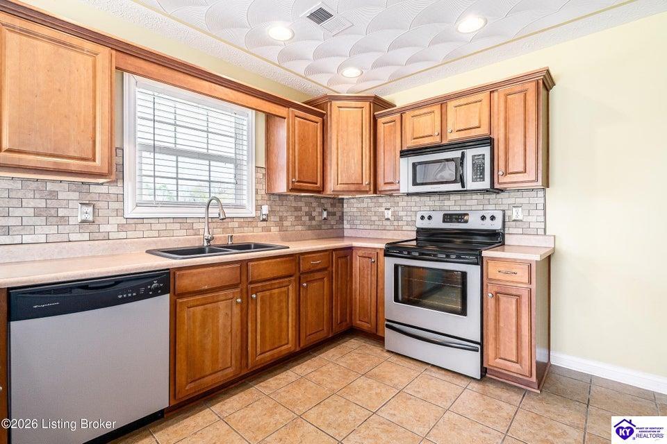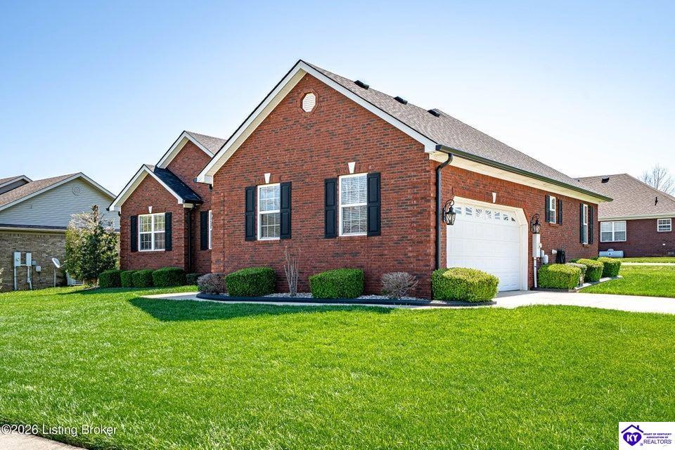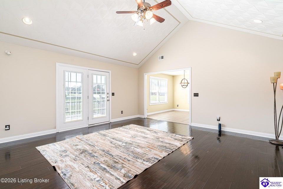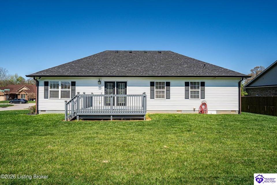 Realtor's notes: Stunning Corner-Lot Home with Architectural Flair This meticulously maintained 3-bedroom, 2-bathroom residence combines spaciousness with refined detail. The heart of the home is a grand great room featuring soaring 18-foot ceilings and elegant French doors that open onto a newly installed deck—perfect for indoor-outdoor entertaining. The gourmet kitchen and formal dining area are accented by custom ceiling designs and come fully equipped with a premium Frigidaire appliance package. Retreat to the primary suite, a private sanctuary boasting 15-foot ceilings and intricate architectural details. Major updates provide total peace of mind, including a new 30-year roof and gutters (2025) and a high-efficiency Trane HVAC system. This move-in-ready gem also includes a security system, a two-car garage, and the washer and dryer.
