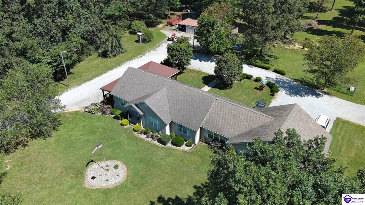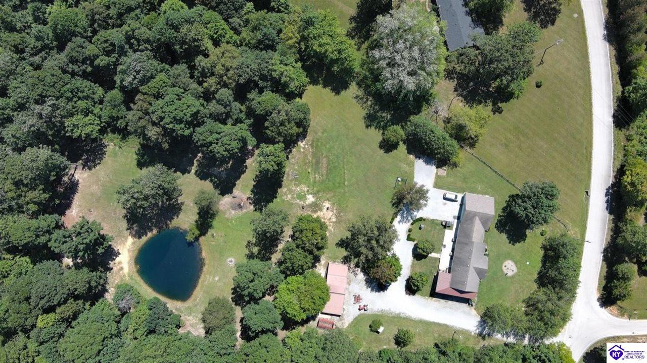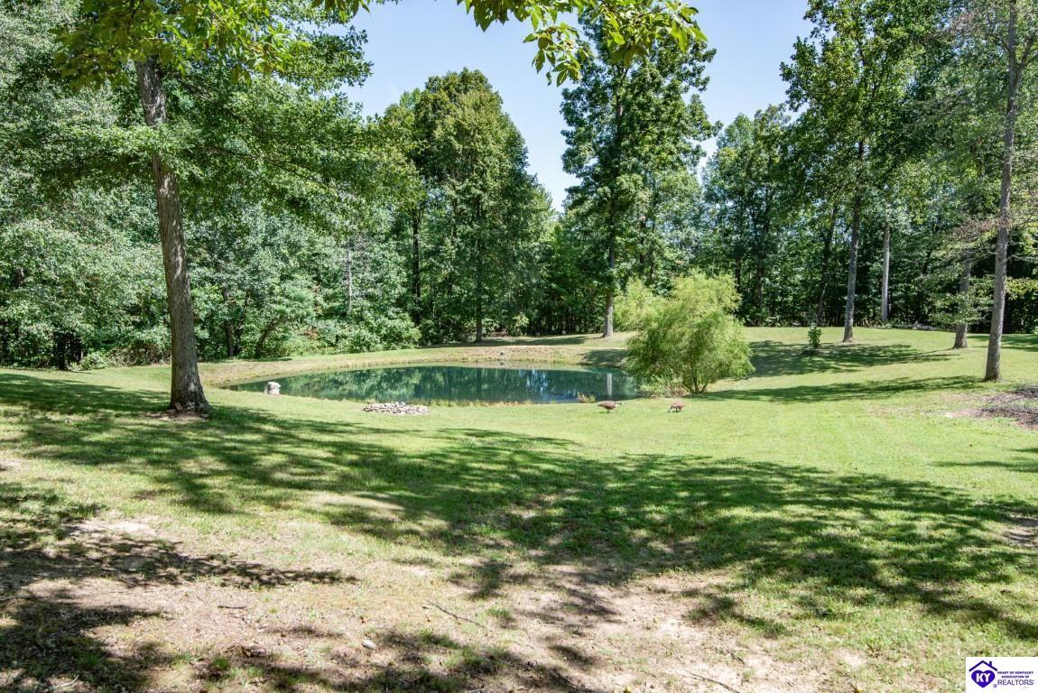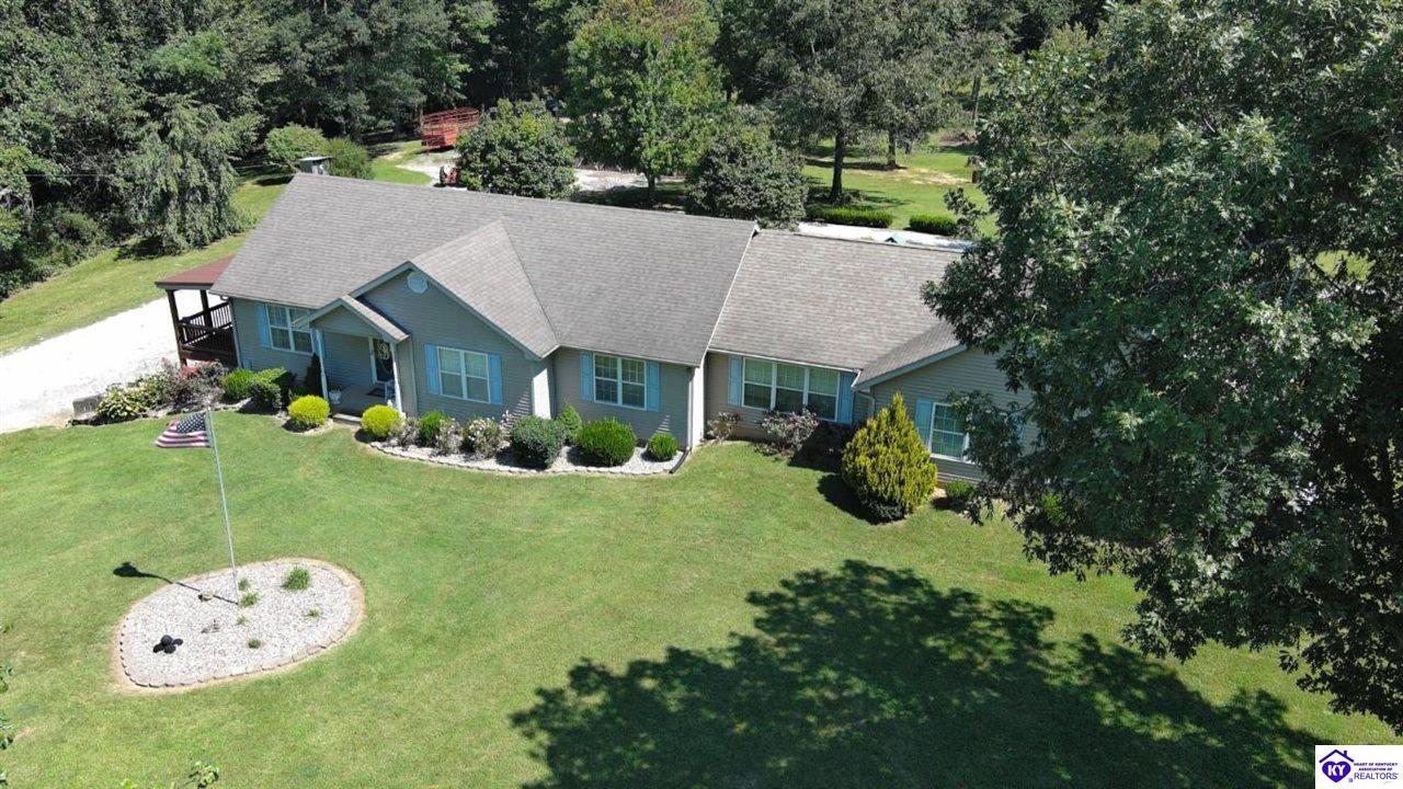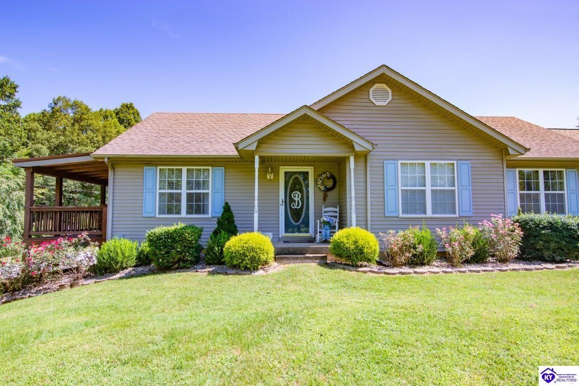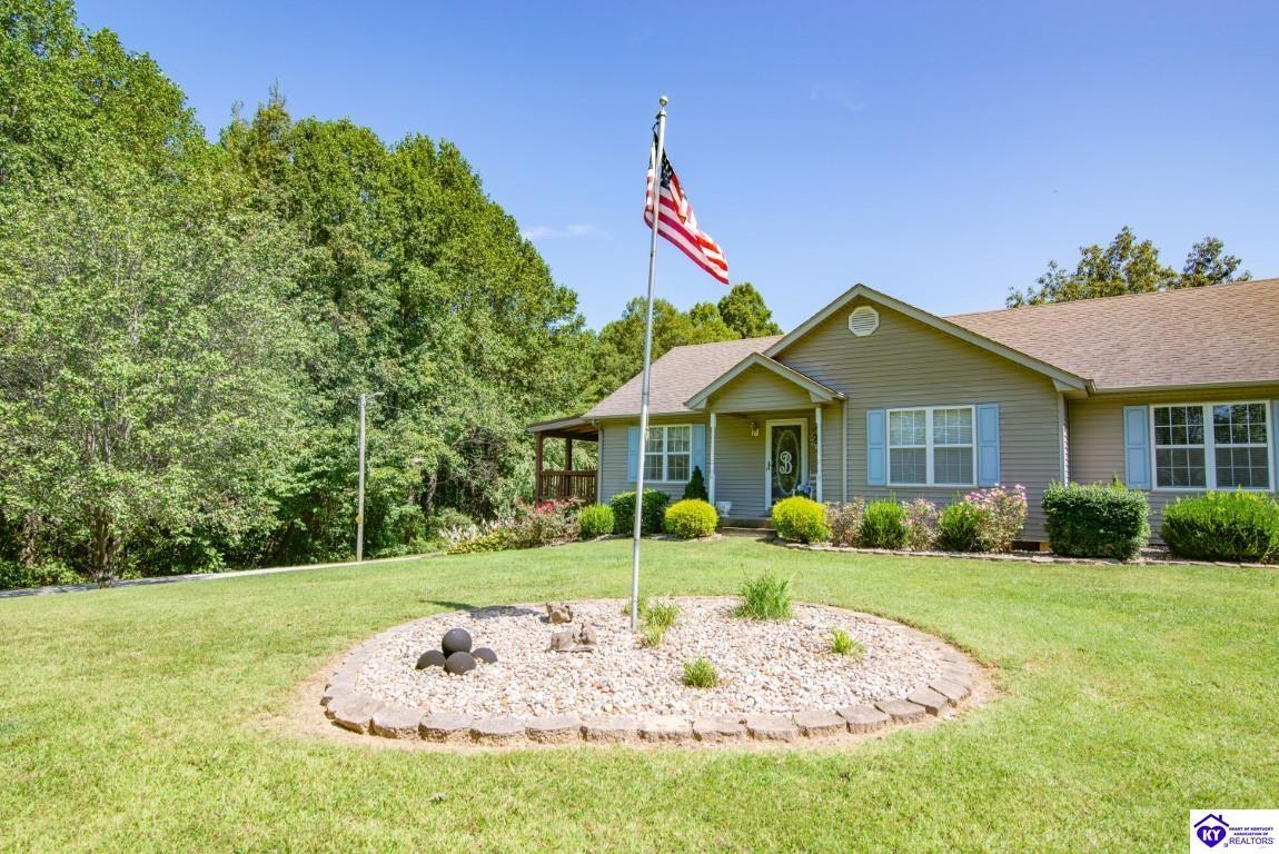 Realtor's notes: Welcome to your dream retreat located approximately 25 minutes to Elizabethtown and approximately 20 minutes to Campbellsville. Nestled on a breathtaking 5 acre park like setting, this sprawling ranch home offers a NEWER ROOF, 3 CAR GARAGE and is already wired for a genertaor for added convenience and peace of mind during power outages. Featuring an expansive layout, this home offers generous living spaces with plenty of windows providing natural light and beautiful views. As you step inside, you'll be greeted by the spacious living room, open to the kitchen and dining area providing plenty of space for entertaining friends and family. The primary suite offers an en-suite bath and it's own sitting room/office area with easy access to the laundry. This home provides a total of 3 bedrooms, 3 full baths with additional finished space in the basement to be used to suit your needs including a large family room, 2 additional rooms with closets, and another washer/dryer hookup. Step outside to discover your own personal paradise. This BEAUTIFUL property is perfect for hosting gatherings or just simply enjoying fishing in the pond or relaxing on the expansive deck surrounded by nature. Don't miss your chance to own this extraordinary property where comfort meets nature offering the perfect blend of tranquility and spacious living. You must see it to appreciate all it has to offer! Schedule your private tour today!