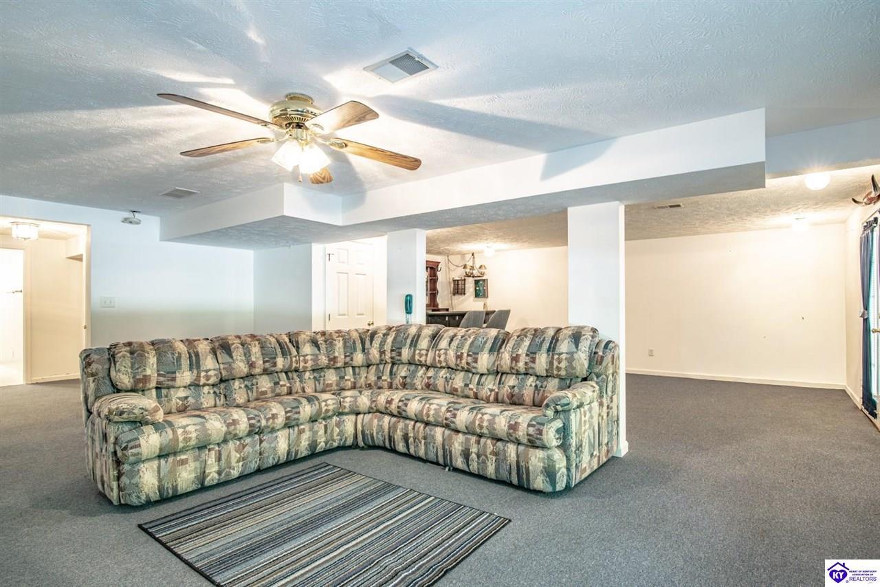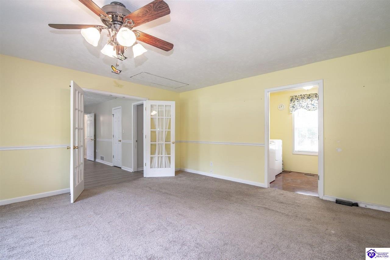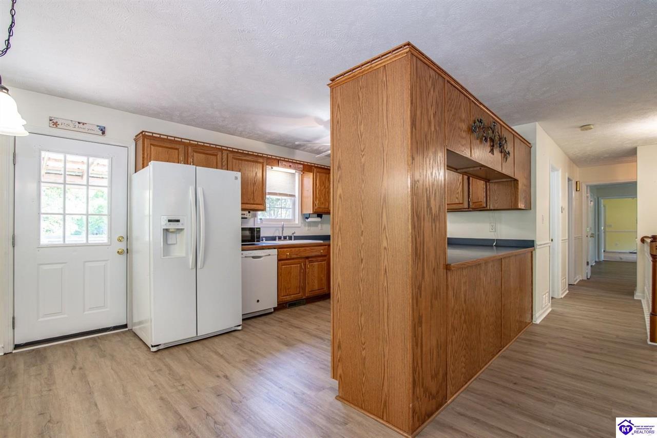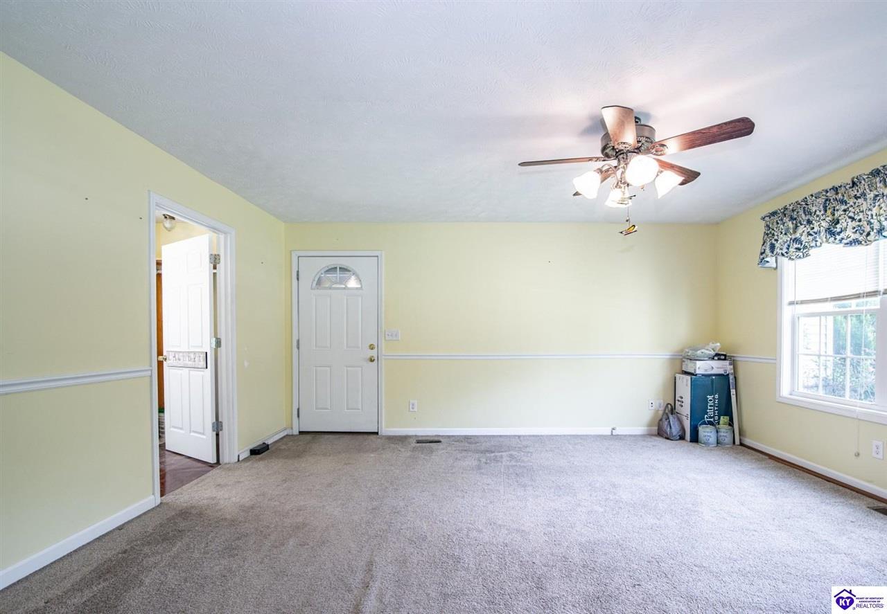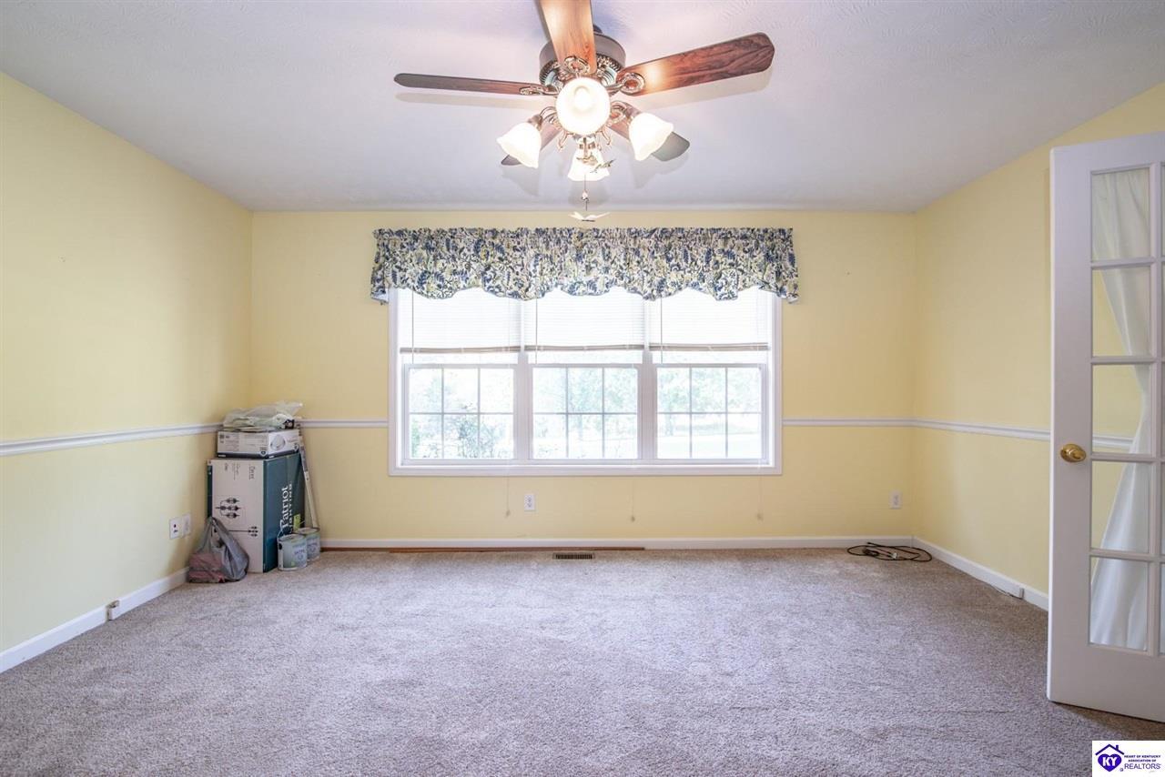 Realtor's notes: Welcome to your dream retreat located approximately 25 minutes to Elizabethtown and approximately 20 minutes to Campbellsville. Nestled on a breathtaking 5 acre park like setting, this sprawling ranch home offers a NEWER ROOF, 3 CAR GARAGE and is already wired for a genertaor for added convenience and peace of mind during power outages. Featuring an expansive layout, this home offers generous living spaces with plenty of windows providing natural light and beautiful views. As you step inside, you'll be greeted by the spacious living room, open to the kitchen and dining area providing plenty of space for entertaining friends and family. The primary suite offers an en-suite bath and it's own sitting room/office area with easy access to the laundry. This home provides a total of 3 bedrooms, 3 full baths with additional finished space in the basement to be used to suit your needs including a large family room, 2 additional rooms with closets, and another washer/dryer hookup. Step outside to discover your own personal paradise. This BEAUTIFUL property is perfect for hosting gatherings or just simply enjoying fishing in the pond or relaxing on the expansive deck surrounded by nature. Don't miss your chance to own this extraordinary property where comfort meets nature offering the perfect blend of tranquility and spacious living. You must see it to appreciate all it has to offer! Schedule your private tour today!