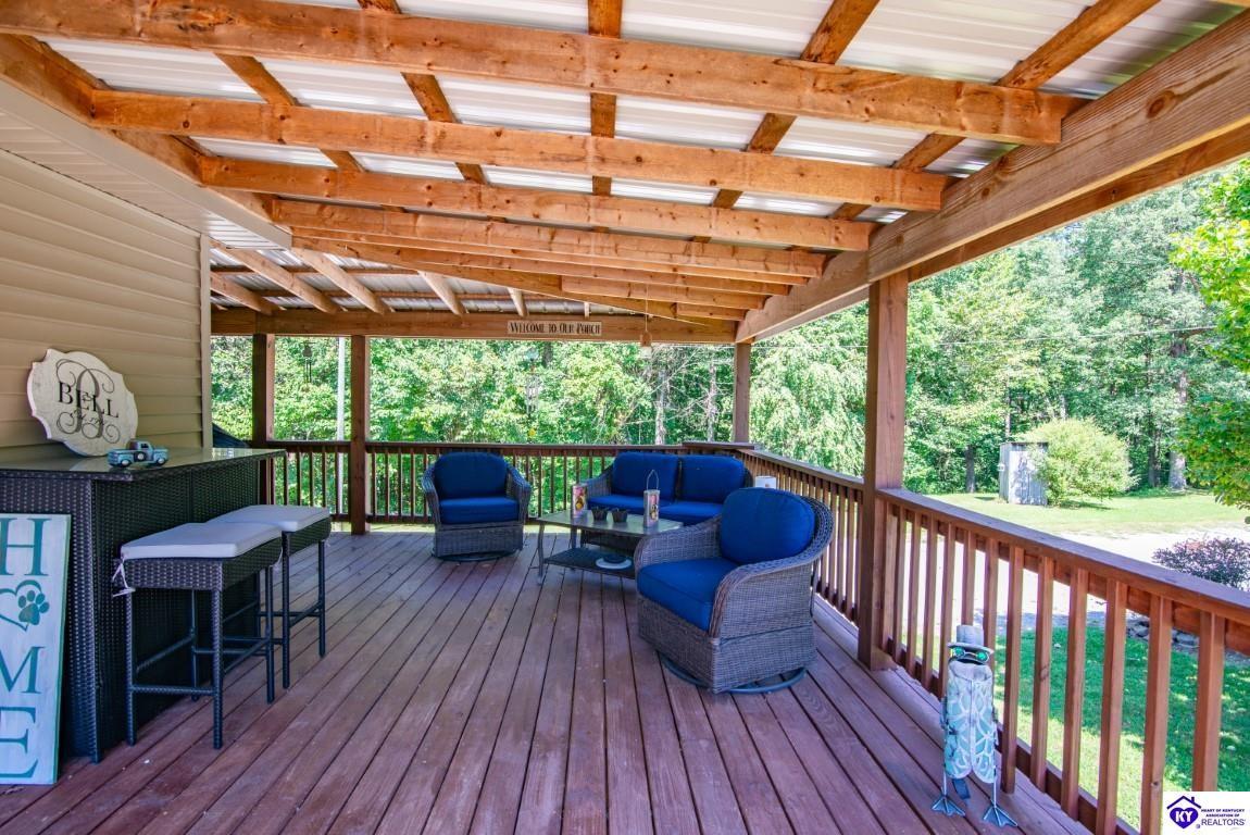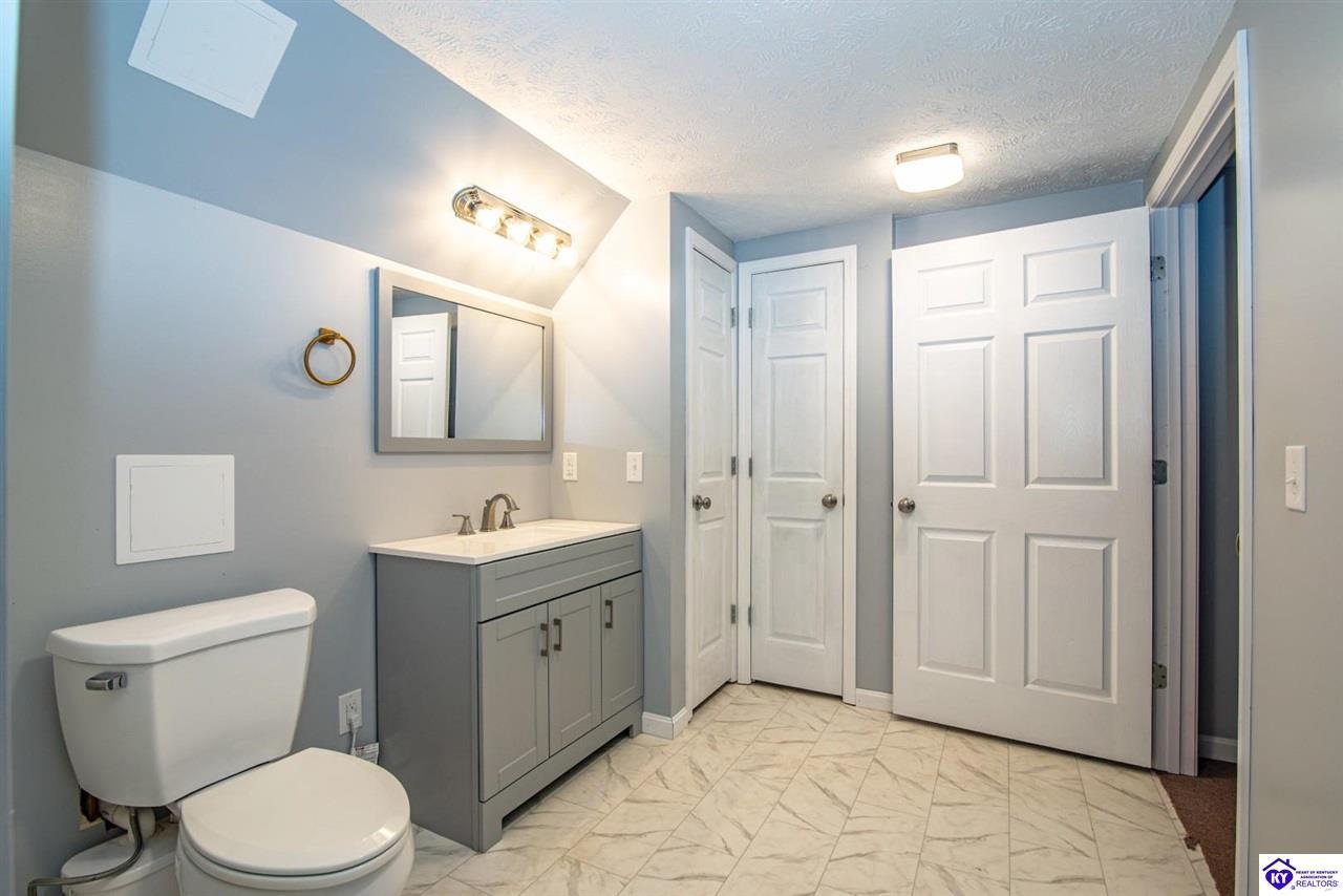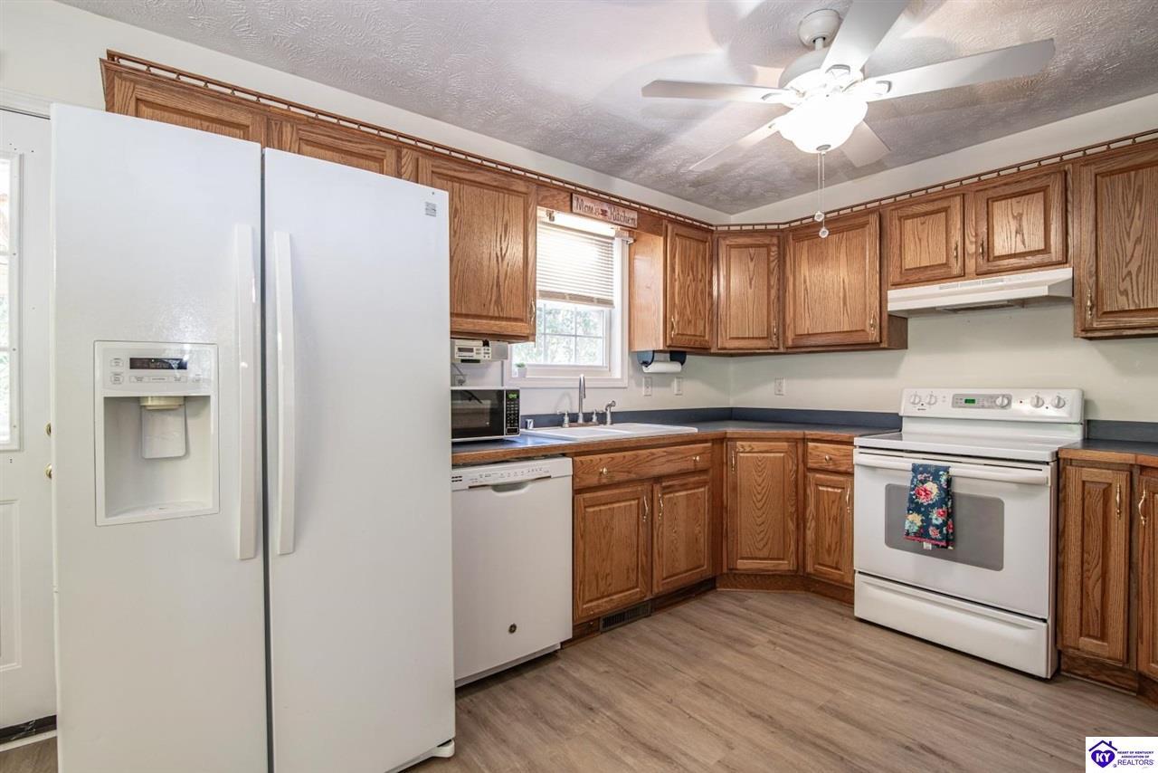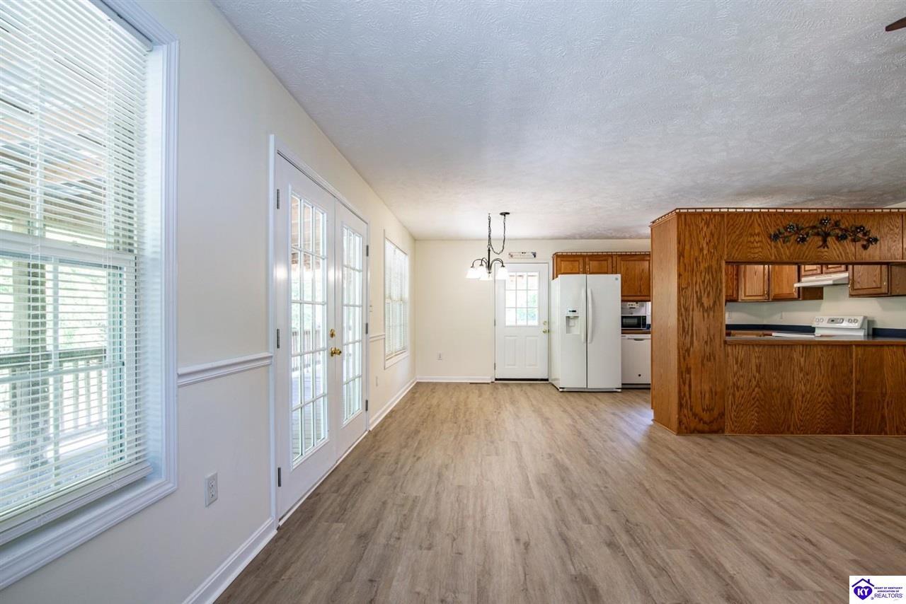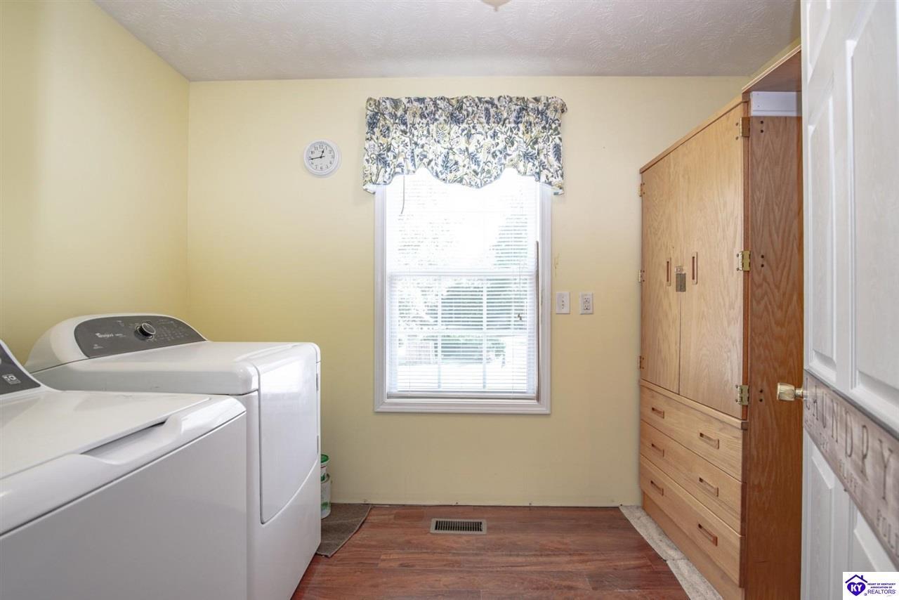 Realtor's notes: Welcome to your dream retreat located approximately 25 minutes to Elizabethtown and approximately 20 minutes to Campbellsville. Nestled on a breathtaking 5 acre park like setting, this sprawling ranch home offers a NEWER ROOF, 3 CAR GARAGE and is already wired for a genertaor for added convenience and peace of mind during power outages. Featuring an expansive layout, this home offers generous living spaces with plenty of windows providing natural light and beautiful views. As you step inside, you'll be greeted by the spacious living room, open to the kitchen and dining area providing plenty of space for entertaining friends and family. The primary suite offers an en-suite bath and it's own sitting room/office area with easy access to the laundry. This home provides a total of 3 bedrooms, 3 full baths with additional finished space in the basement to be used to suit your needs including a large family room, 2 additional rooms with closets, and another washer/dryer hookup. Step outside to discover your own personal paradise. This BEAUTIFUL property is perfect for hosting gatherings or just simply enjoying fishing in the pond or relaxing on the expansive deck surrounded by nature. Don't miss your chance to own this extraordinary property where comfort meets nature offering the perfect blend of tranquility and spacious living. You must see it to appreciate all it has to offer! Schedule your private tour today!