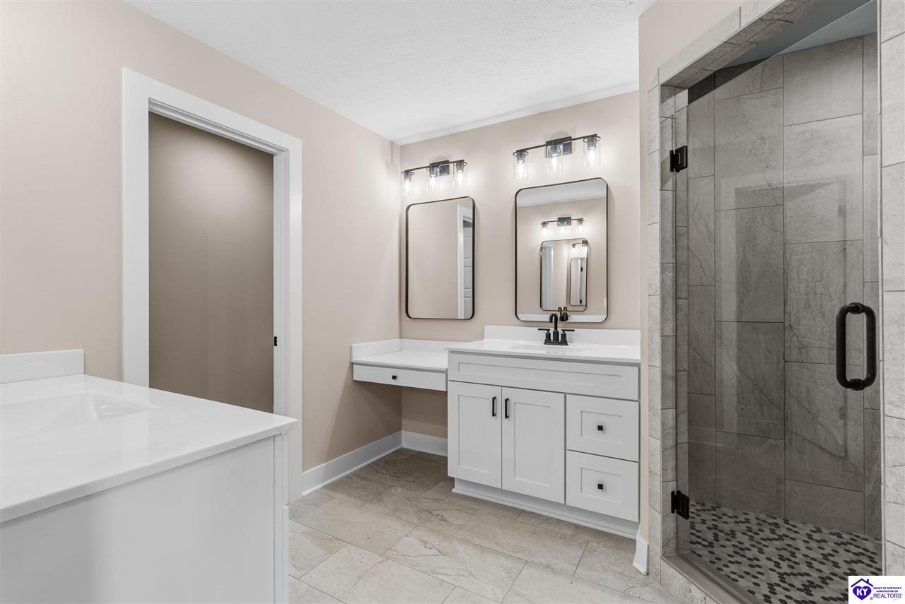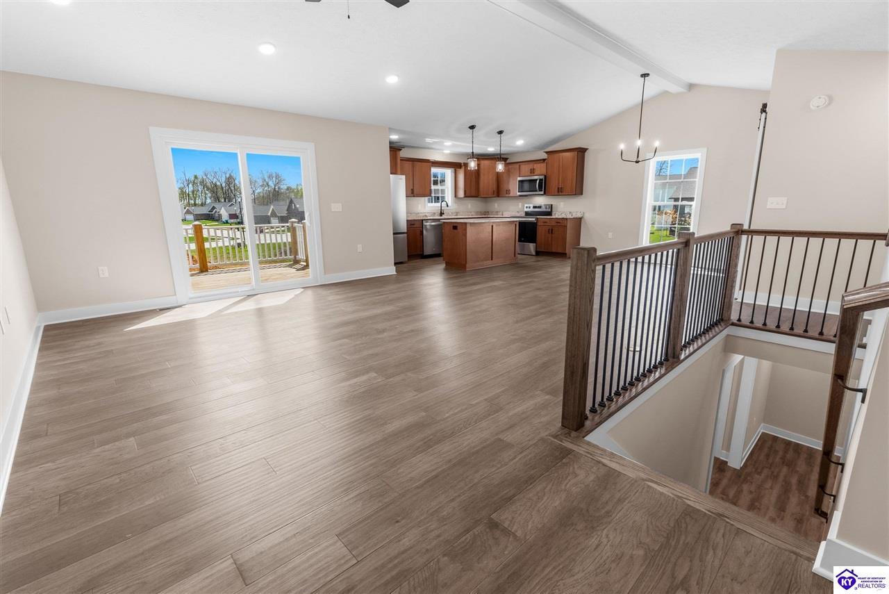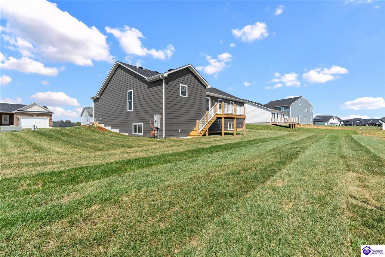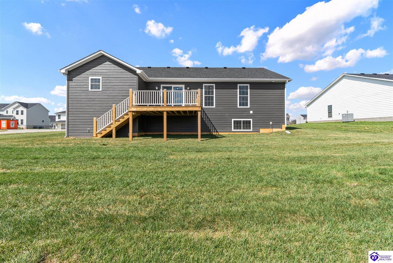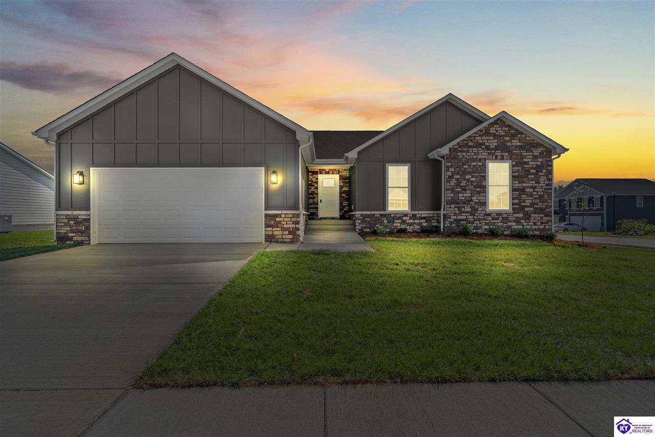 Realtor's notes: Stunning 4 Bedroom Ranch Home with Finished Basement in Elizabethtown, KY - 2,770 Sq Ft of Upgraded Living Space Welcome to this beautifully designed 4 bedroom, 3 full bath ranch home located in one of Elizabethtown's most sought-after neighborhoods. Offering 2,770 square feet of finished living space, this move-in ready home combines modern upgrades, functional design, and timeless curb appeal with stone and board-and-batten exterior accents. Ideal for growing families, multi-generational living, or buyers seeking a ranch with a finished basement in Elizabethtown, KY. Step inside to an open-concept floor plan featuring hand-scraped hardwood floors throughout the main level and soaring vaulted ceilings in the great room, creating a bright and spacious atmosphere. The seamless flow between the living room, dining area, and kitchen makes this home perfect for entertaining and everyday living. The kitchen is fully equipped with granite countertops, stainless steel appliances, ample cabinetry, and generous prep space—offering both style and functionality for modern living. The spacious primary suite features a tray ceiling and comfortably fits a king-size bedroom set. The en-suite bathroom includes a walk-in tile shower, dual vanities with knee space, and excellent storage, along with a large walk-in closet. Additional bedrooms are well-sized, and all bathrooms feature durable tile flooring for easy maintenance and long-term value. The finished basement expands your living space with premium LVP flooring, a large family room ideal for a media room or recreation area, plus a fourth bedroom and full bathroom—perfect for guests, a home office, gym, or in-law suite. Ample storage space adds even more functionality. Exterior features include a covered front porch and a back deck, perfect for outdoor entertaining or relaxing. The 2-car garage with epoxy flooring provides a clean, durable, and low-maintenance finish. Key Features: ranch home Elizabethtown KY, finished basement, 4 bedrooms, 3 bathrooms, 2,770 sq ft, granite countertops, stainless steel appliances, hardwood floors, LVP flooring, vaulted ceilings, tray ceiling, walk-in closets, tile shower, epoxy garage floor, open-concept layout. Located just minutes from shopping, dining, schools, and major commuting routes, this home offers convenience, space, and high-end finishes in one of Elizabethtown’s most desirable areas. Schedule your private showing today and experience this exceptional home firsthand.