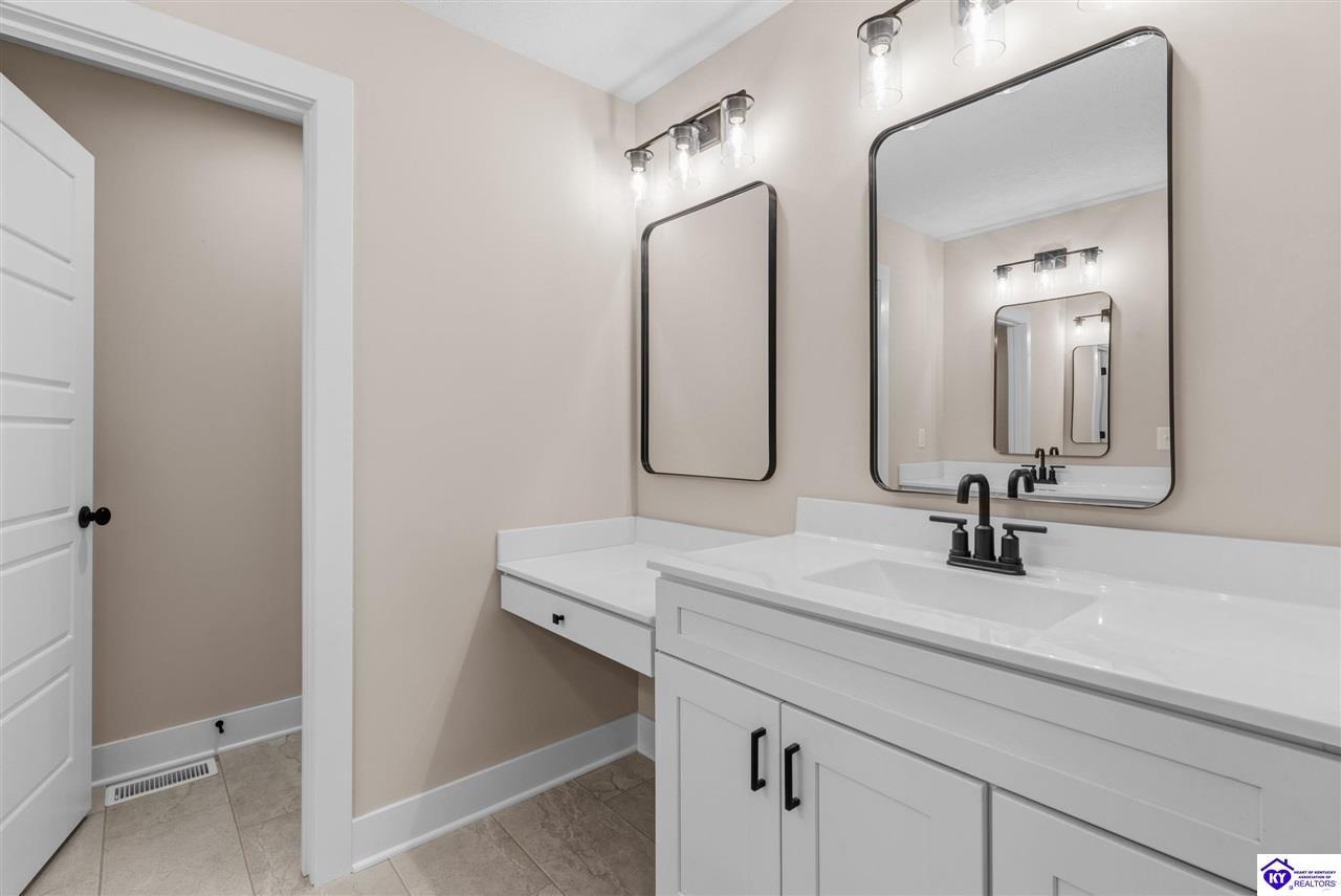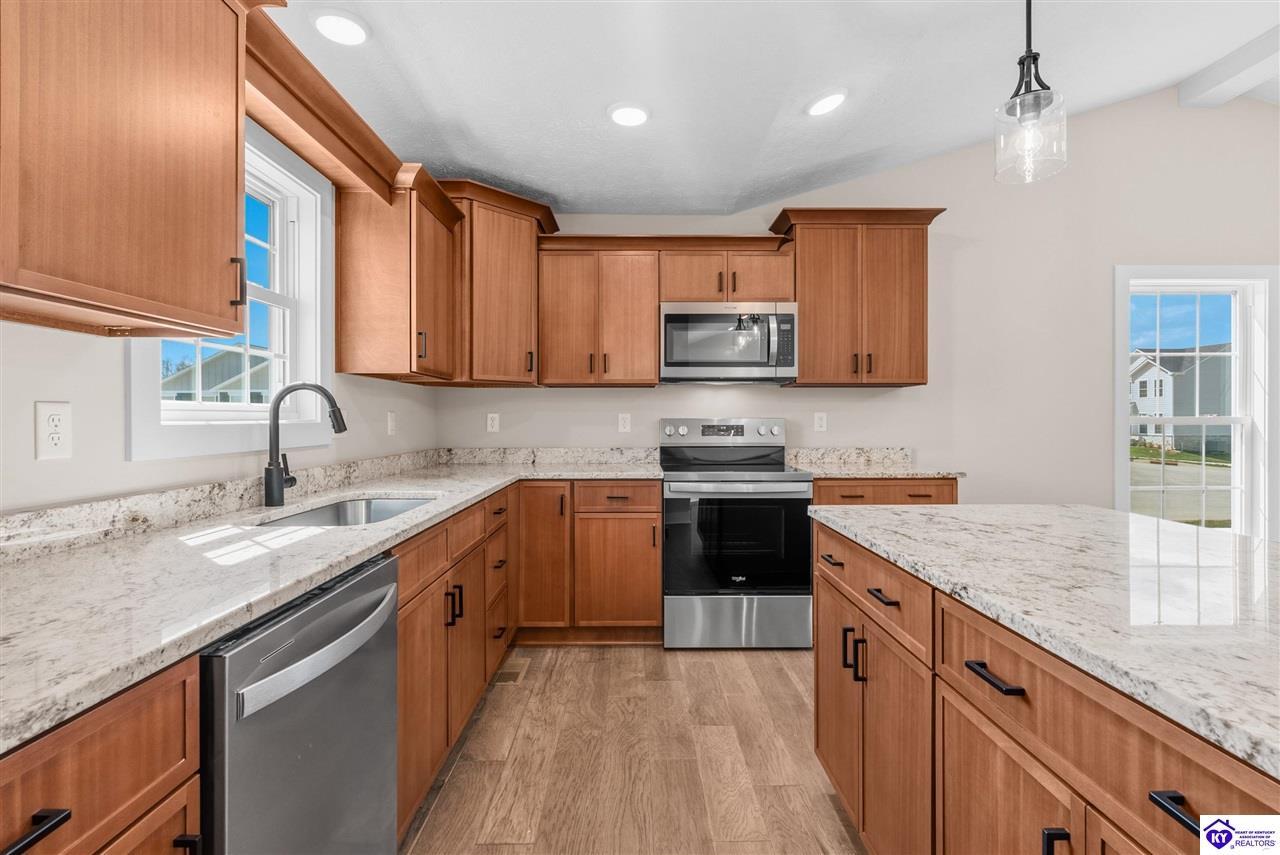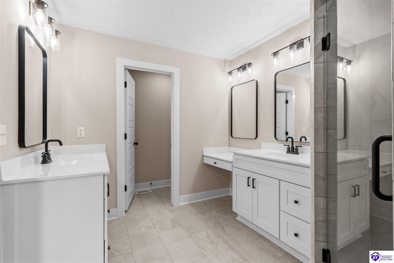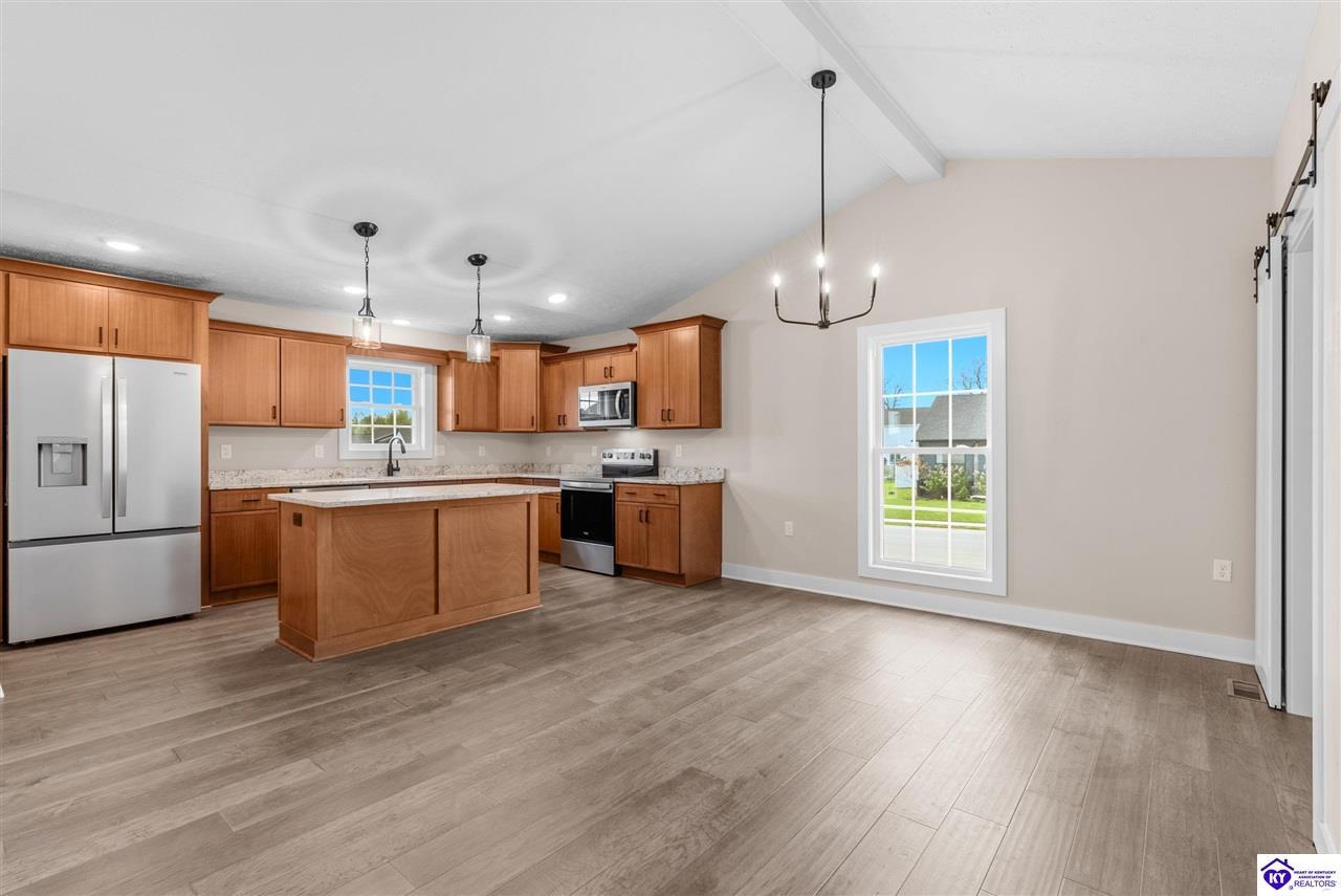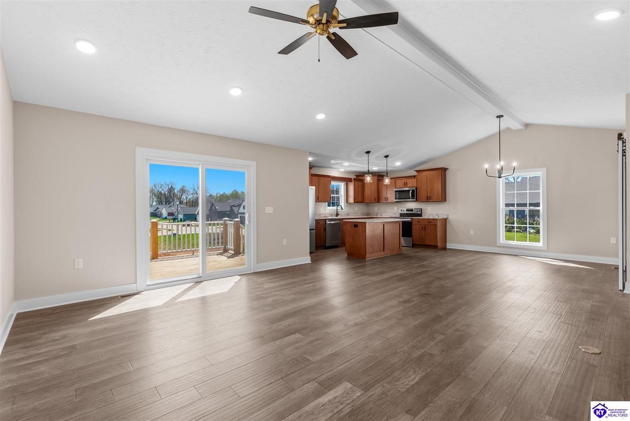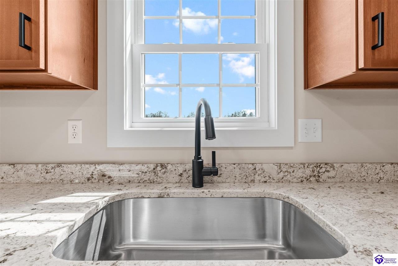 Realtor's notes: Stunning 4 Bedroom Ranch Home with Finished Basement in Elizabethtown, KY - 2,770 Sq Ft of Upgraded Living Space Welcome to this beautifully designed 4 bedroom, 3 full bath ranch home located in one of Elizabethtown's most sought-after neighborhoods. Offering 2,770 square feet of finished living space, this move-in ready home combines modern upgrades, functional design, and timeless curb appeal with stone and board-and-batten exterior accents. Ideal for growing families, multi-generational living, or buyers seeking a ranch with a finished basement in Elizabethtown, KY. Step inside to an open-concept floor plan featuring hand-scraped hardwood floors throughout the main level and soaring vaulted ceilings in the great room, creating a bright and spacious atmosphere. The seamless flow between the living room, dining area, and kitchen makes this home perfect for entertaining and everyday living. The kitchen is fully equipped with granite countertops, stainless steel appliances, ample cabinetry, and generous prep space—offering both style and functionality for modern living. The spacious primary suite features a tray ceiling and comfortably fits a king-size bedroom set. The en-suite bathroom includes a walk-in tile shower, dual vanities with knee space, and excellent storage, along with a large walk-in closet. Additional bedrooms are well-sized, and all bathrooms feature durable tile flooring for easy maintenance and long-term value. The finished basement expands your living space with premium LVP flooring, a large family room ideal for a media room or recreation area, plus a fourth bedroom and full bathroom—perfect for guests, a home office, gym, or in-law suite. Ample storage space adds even more functionality. Exterior features include a covered front porch and a back deck, perfect for outdoor entertaining or relaxing. The 2-car garage with epoxy flooring provides a clean, durable, and low-maintenance finish. Key Features: ranch home Elizabethtown KY, finished basement, 4 bedrooms, 3 bathrooms, 2,770 sq ft, granite countertops, stainless steel appliances, hardwood floors, LVP flooring, vaulted ceilings, tray ceiling, walk-in closets, tile shower, epoxy garage floor, open-concept layout. Located just minutes from shopping, dining, schools, and major commuting routes, this home offers convenience, space, and high-end finishes in one of Elizabethtown’s most desirable areas. Schedule your private showing today and experience this exceptional home firsthand.