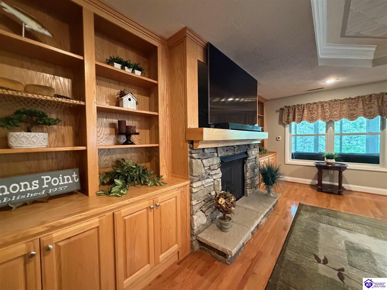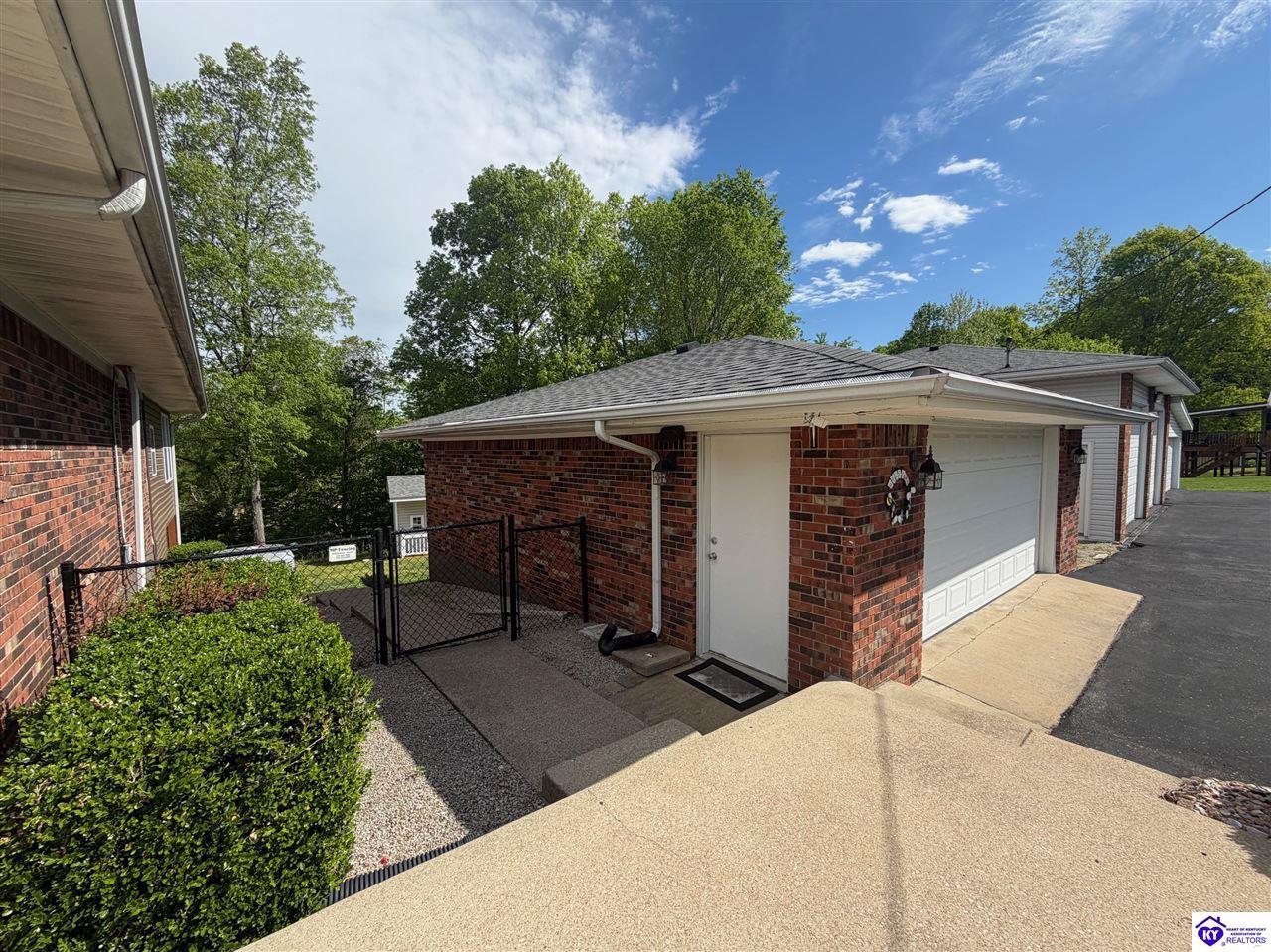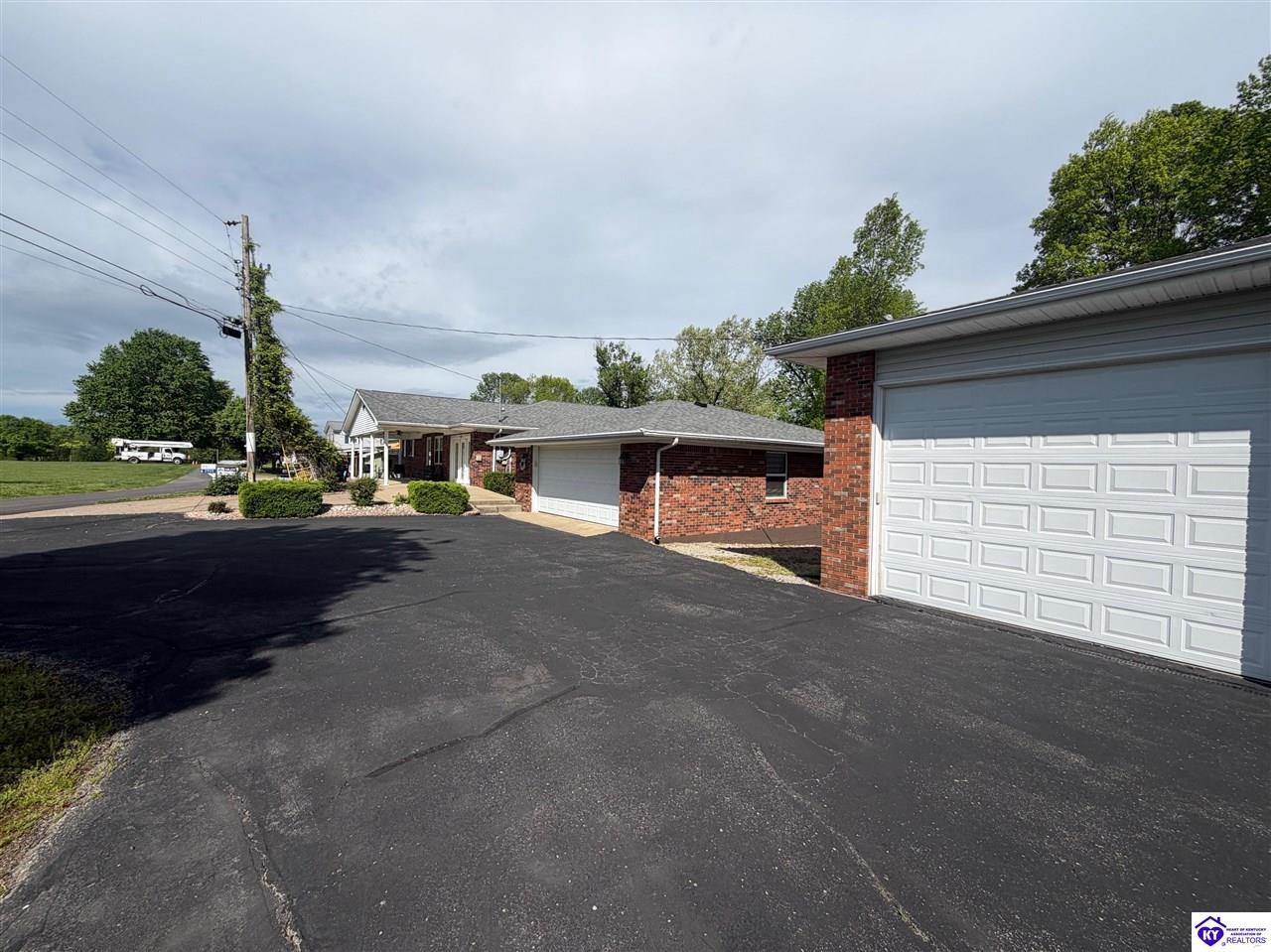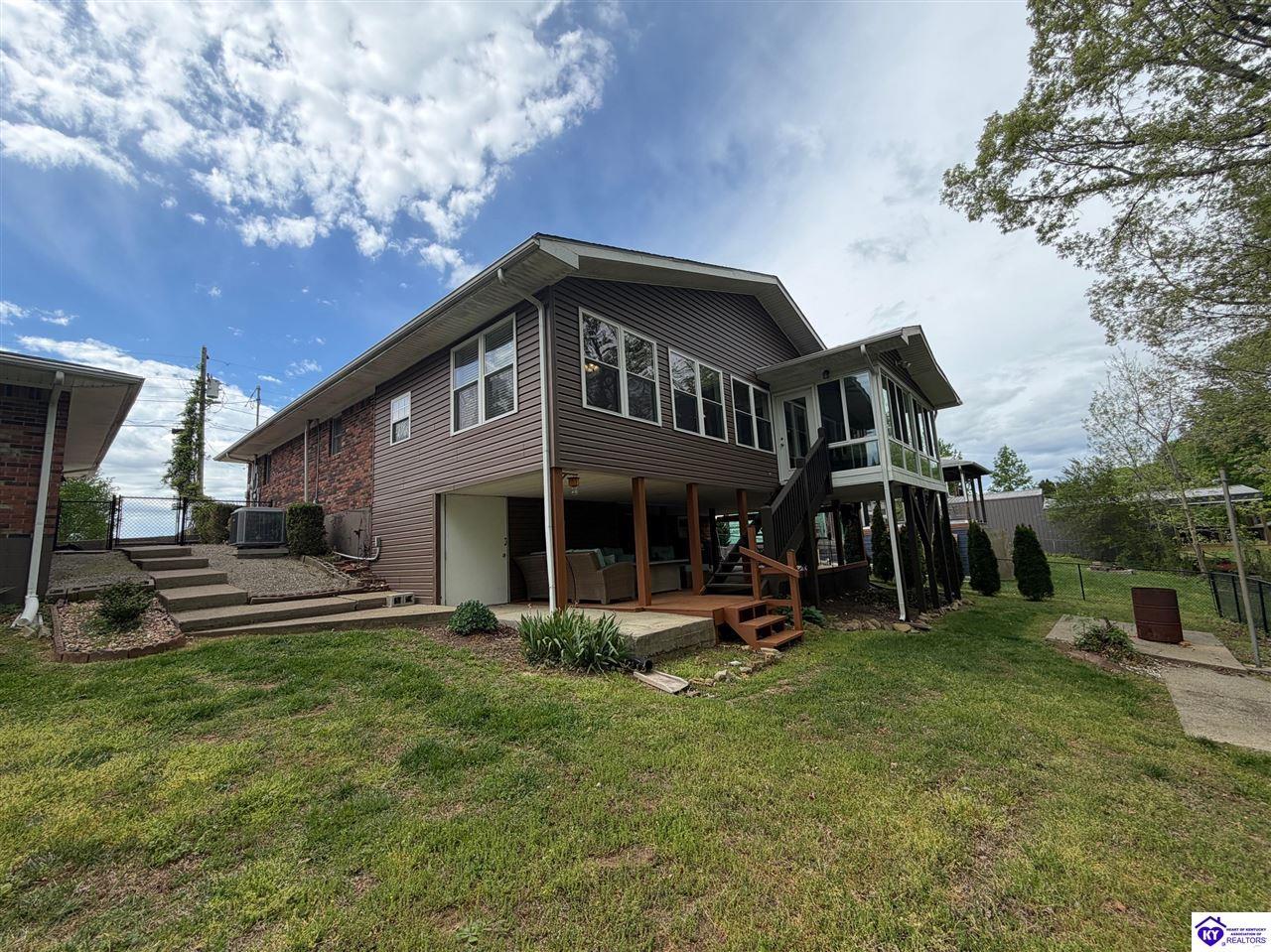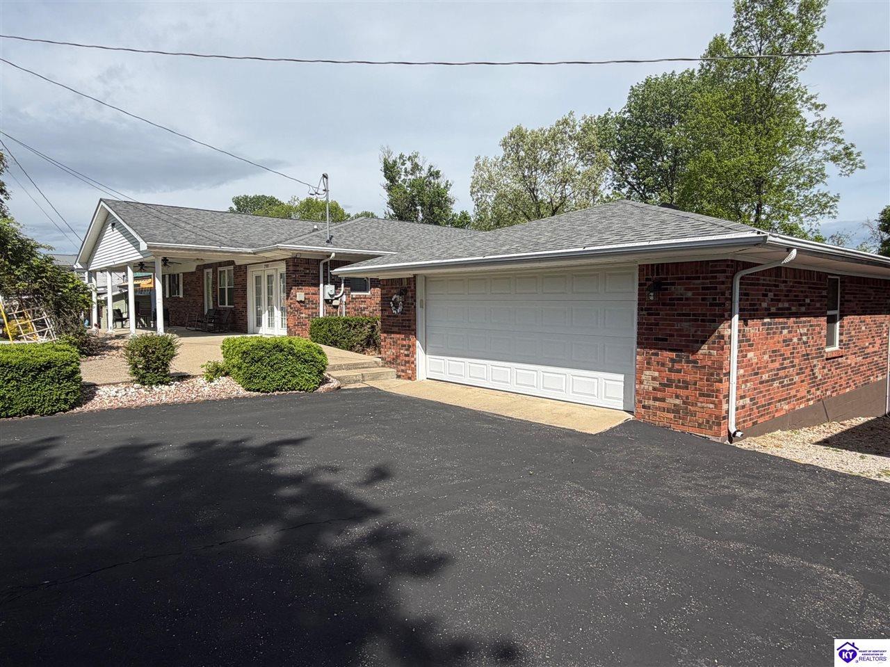 Realtor's notes: Lakefront home in Cannons Point Subdivision on Rough River Lake! This 3 bedroom, 3 bathroom home sits on a half-acre lot with direct backyard lake access and a private shared boat dock with COE approval. Enjoy easy lake living with a neighborhood boat ramp and courtesy dock just a short walk or golf cart ride away. The home features an open floor plan with hardwood floors, abundant natural light, and a spacious kitchen with granite countertops, custom cabinetry, and eat-in dining. The main level includes a private primary suite with walk-in shower, soaking tub, and attached laundry, plus two additional bedrooms and a full bath. The living area offers custom built-ins, tray ceilings, a gas fireplace, and access to a year-round sunroom with beautiful lake views. The finished walkout basement provides additional living space, a full bathroom, and access to a covered patio—perfect for entertaining. A standout feature is the incredible 6.5 car garage capacity, including multiple detached garages and a large 31x35 garage with heat, air, electric, and RV hookup—ideal for boats, campers, and lake toys. Don’t miss this rare opportunity to own a well-maintained lakefront home with direct access to Rough River Lake!