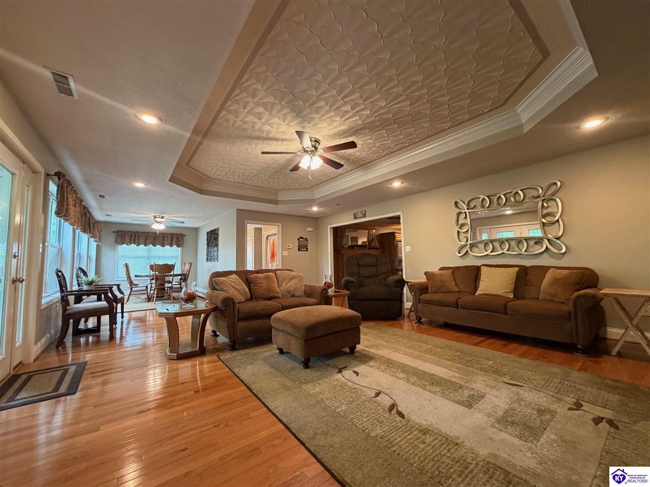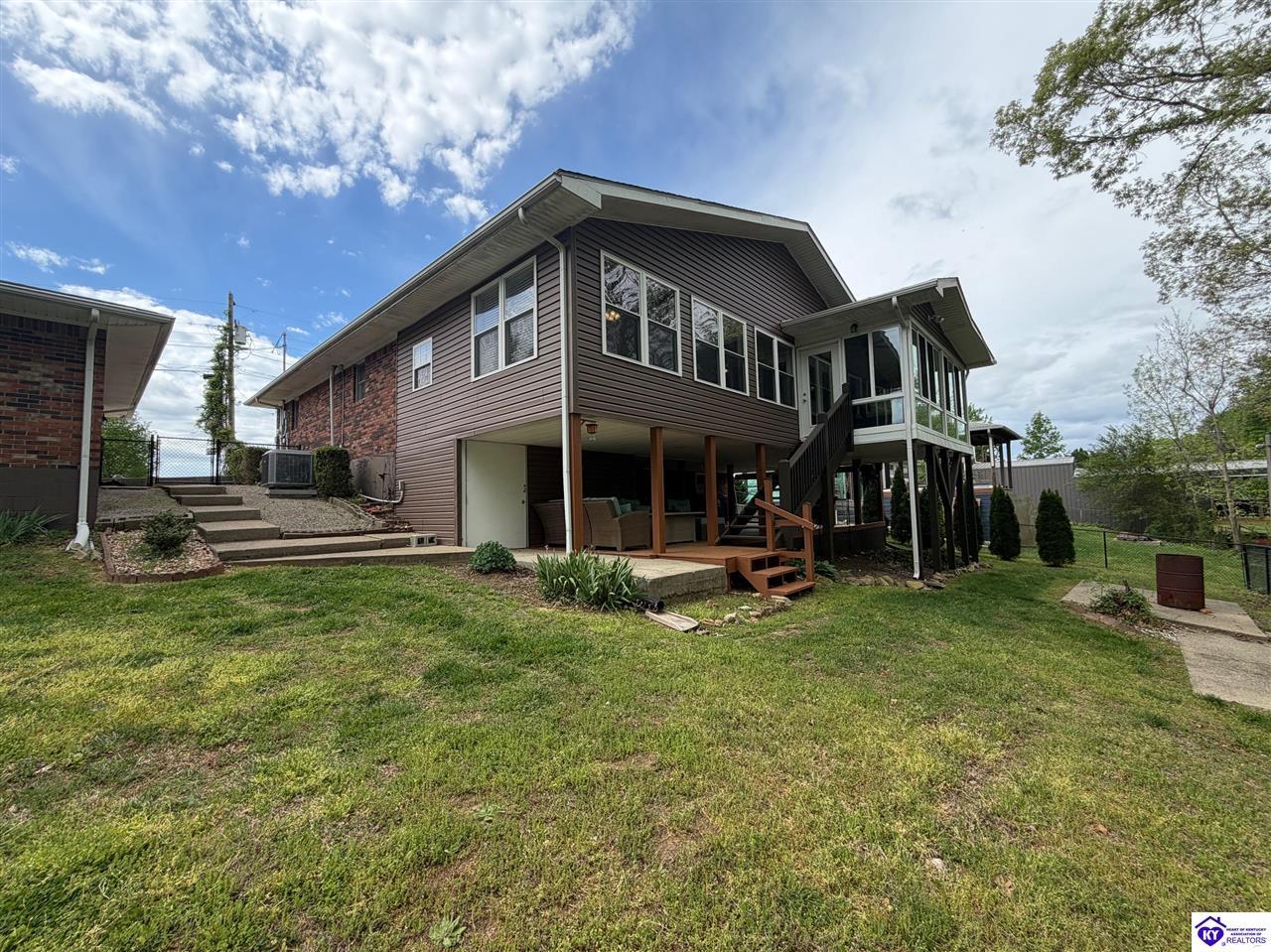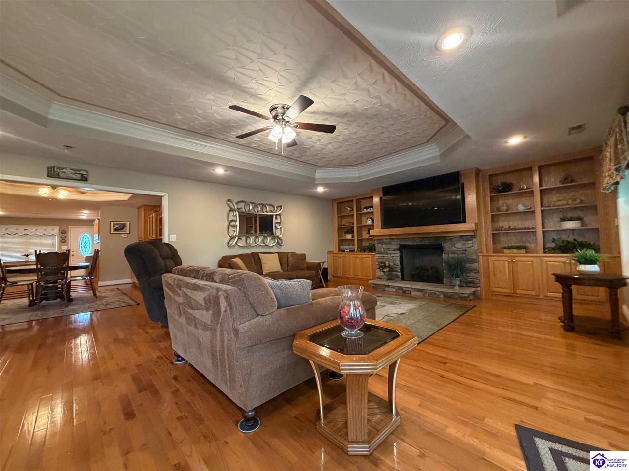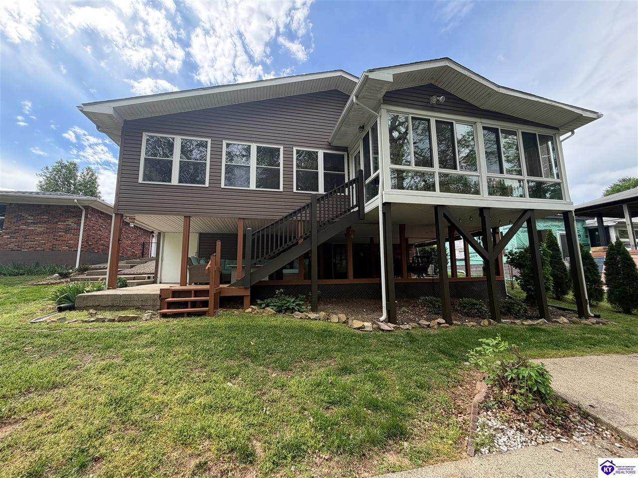 Realtor's notes: Lakefront home in Cannons Point Subdivision on Rough River Lake! This 3 bedroom, 3 bathroom home sits on a half-acre lot with direct backyard lake access and a private shared boat dock with COE approval. Enjoy easy lake living with a neighborhood boat ramp and courtesy dock just a short walk or golf cart ride away. The home features an open floor plan with hardwood floors, abundant natural light, and a spacious kitchen with granite countertops, custom cabinetry, and eat-in dining. The main level includes a private primary suite with walk-in shower, soaking tub, and attached laundry, plus two additional bedrooms and a full bath. The living area offers custom built-ins, tray ceilings, a gas fireplace, and access to a year-round sunroom with beautiful lake views. The finished walkout basement provides additional living space, a full bathroom, and access to a covered patio—perfect for entertaining. A standout feature is the incredible 6.5 car garage capacity, including multiple detached garages and a large 31x35 garage with heat, air, electric, and RV hookup—ideal for boats, campers, and lake toys. Don’t miss this rare opportunity to own a well-maintained lakefront home with direct access to Rough River Lake!
