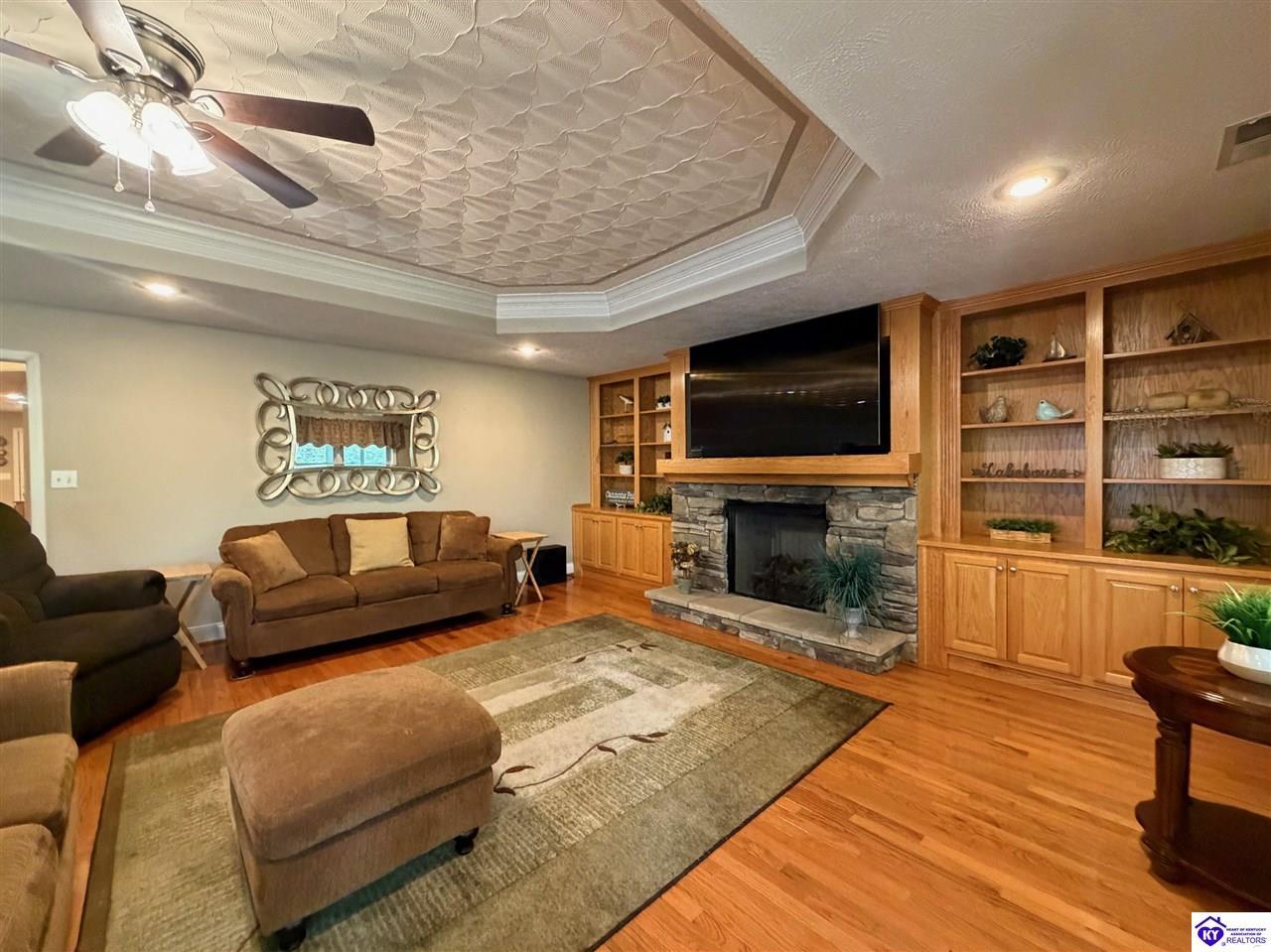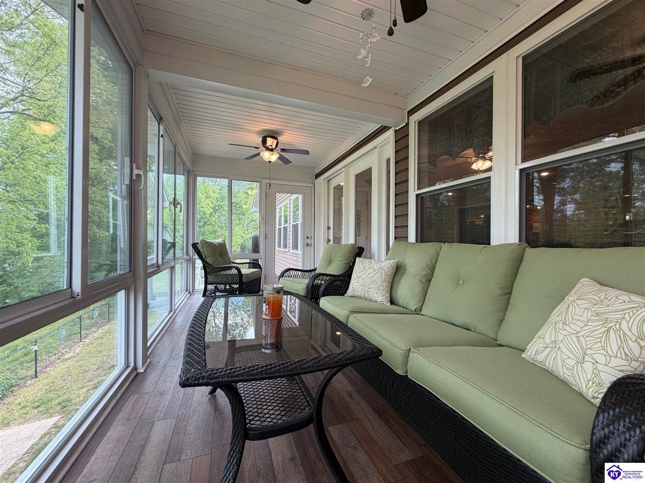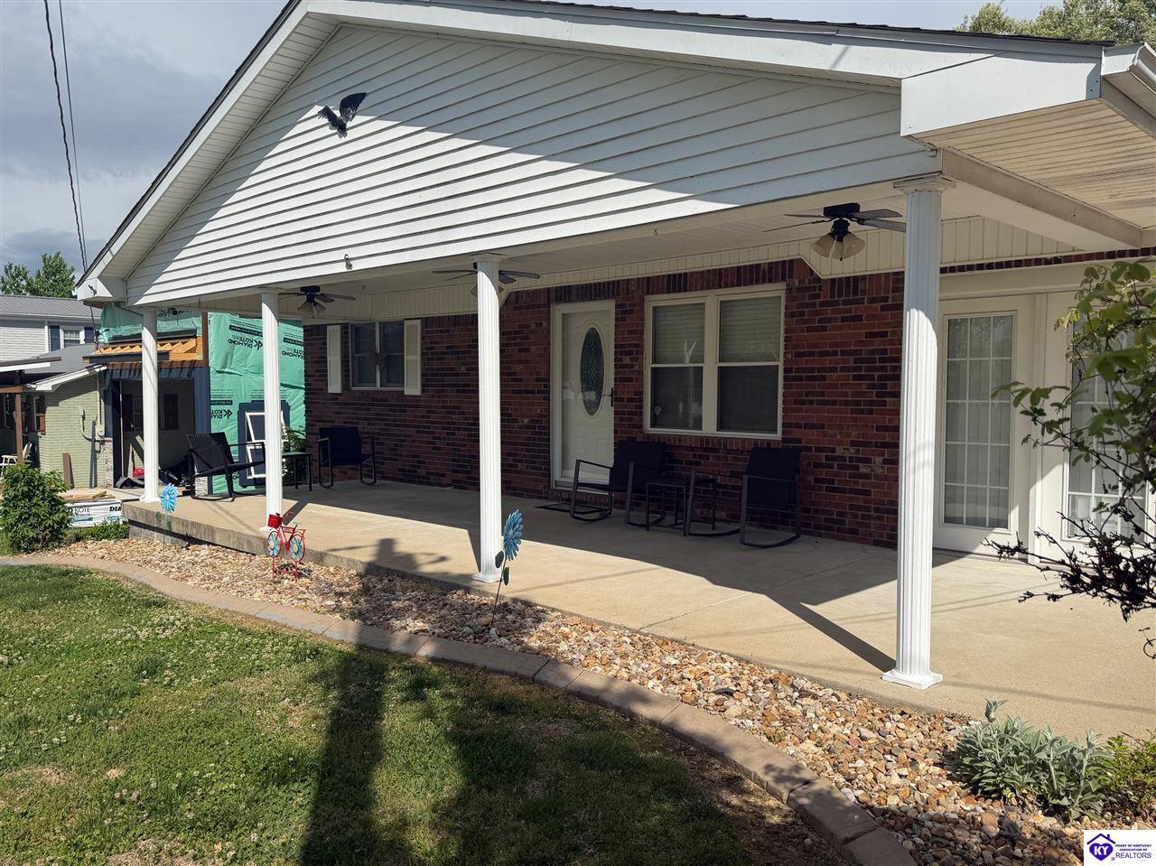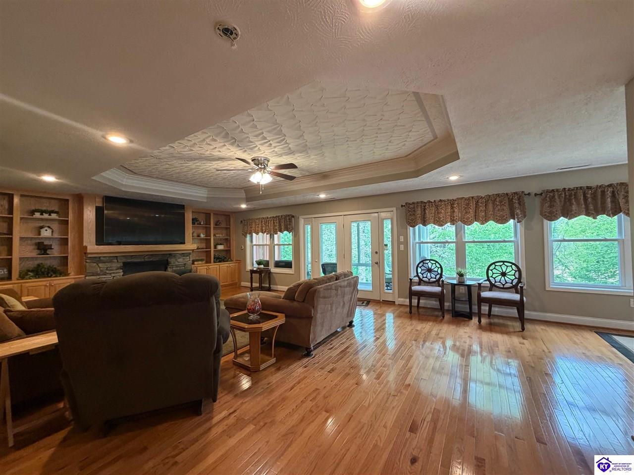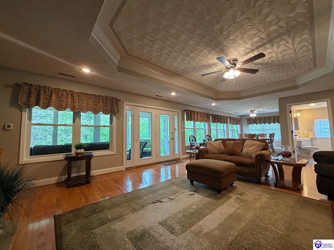 Realtor's notes: Lakefront home in Cannons Point Subdivision on Rough River Lake! This 3 bedroom, 3 bathroom home sits on a half-acre lot with direct backyard lake access and a private shared boat dock with COE approval. Enjoy easy lake living with a neighborhood boat ramp and courtesy dock just a short walk or golf cart ride away. The home features an open floor plan with hardwood floors, abundant natural light, and a spacious kitchen with granite countertops, custom cabinetry, and eat-in dining. The main level includes a private primary suite with walk-in shower, soaking tub, and attached laundry, plus two additional bedrooms and a full bath. The living area offers custom built-ins, tray ceilings, a gas fireplace, and access to a year-round sunroom with beautiful lake views. The finished walkout basement provides additional living space, a full bathroom, and access to a covered patio—perfect for entertaining. A standout feature is the incredible 6.5 car garage capacity, including multiple detached garages and a large 31x35 garage with heat, air, electric, and RV hookup—ideal for boats, campers, and lake toys. Don’t miss this rare opportunity to own a well-maintained lakefront home with direct access to Rough River Lake!
