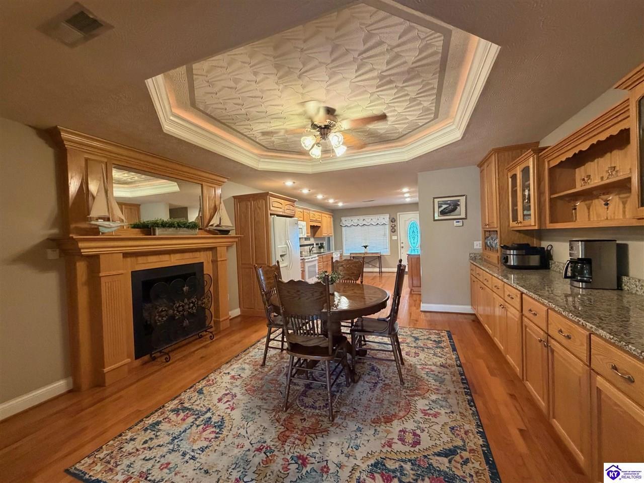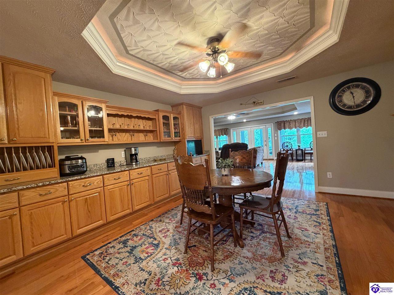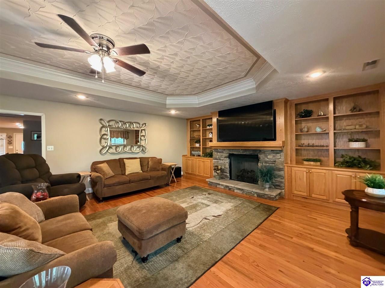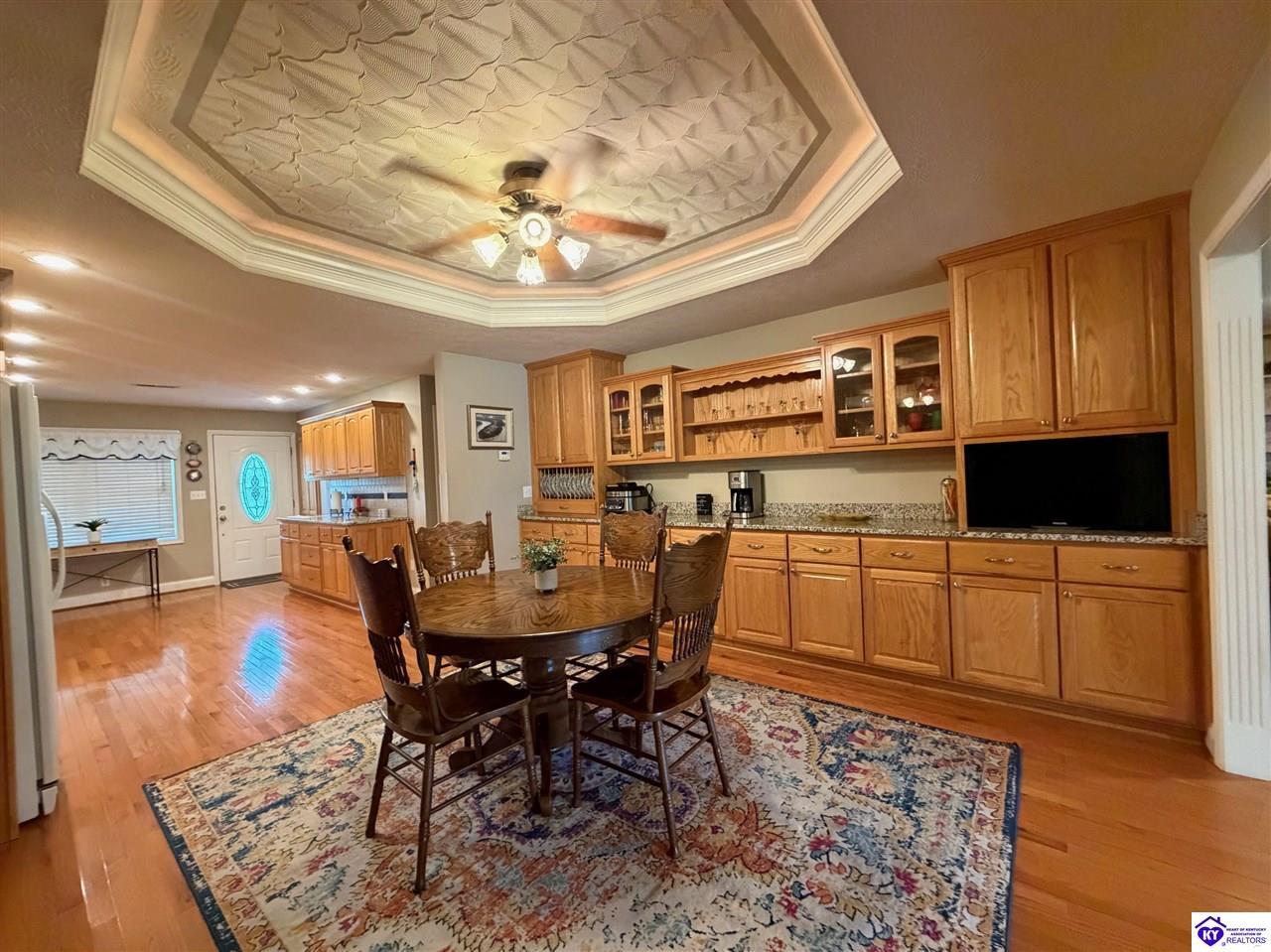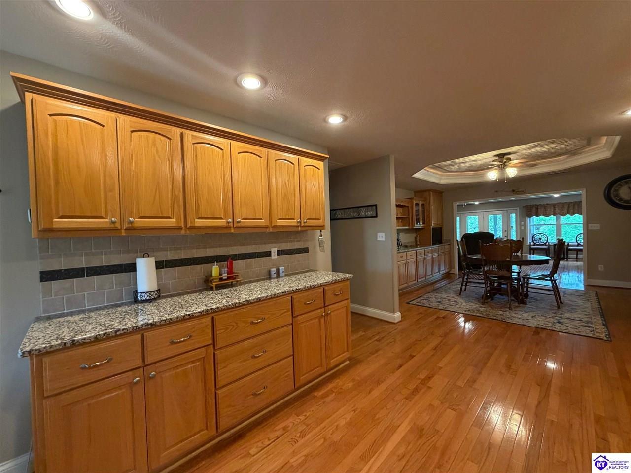 Realtor's notes: Lakefront home in Cannons Point Subdivision on Rough River Lake! This 3 bedroom, 3 bathroom home sits on a half-acre lot with direct backyard lake access and a private shared boat dock with COE approval. Enjoy easy lake living with a neighborhood boat ramp and courtesy dock just a short walk or golf cart ride away. The home features an open floor plan with hardwood floors, abundant natural light, and a spacious kitchen with granite countertops, custom cabinetry, and eat-in dining. The main level includes a private primary suite with walk-in shower, soaking tub, and attached laundry, plus two additional bedrooms and a full bath. The living area offers custom built-ins, tray ceilings, a gas fireplace, and access to a year-round sunroom with beautiful lake views. The finished walkout basement provides additional living space, a full bathroom, and access to a covered patio—perfect for entertaining. A standout feature is the incredible 6.5 car garage capacity, including multiple detached garages and a large 31x35 garage with heat, air, electric, and RV hookup—ideal for boats, campers, and lake toys. Don’t miss this rare opportunity to own a well-maintained lakefront home with direct access to Rough River Lake!