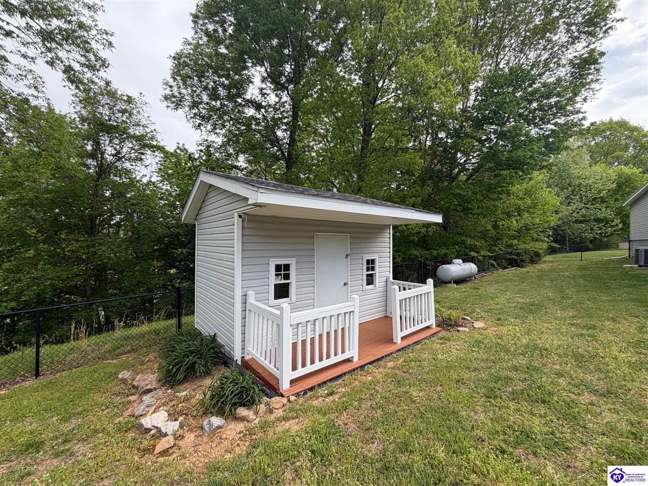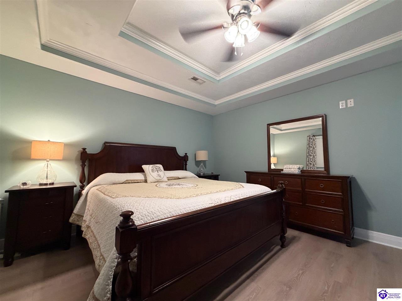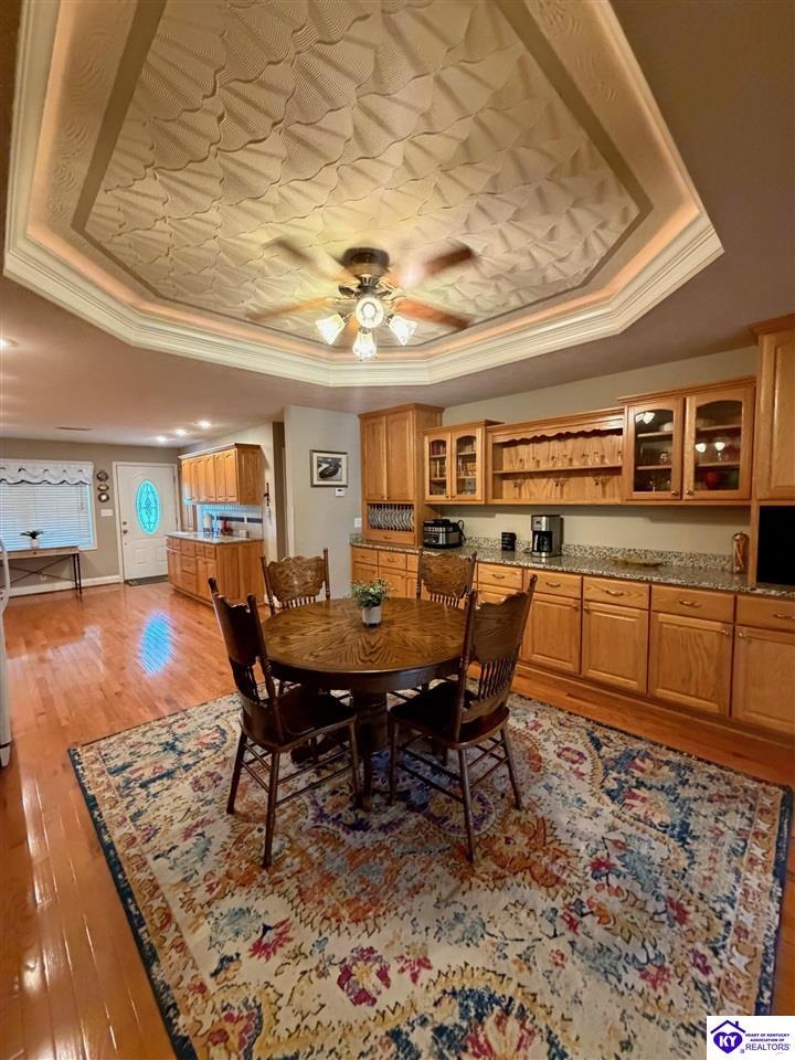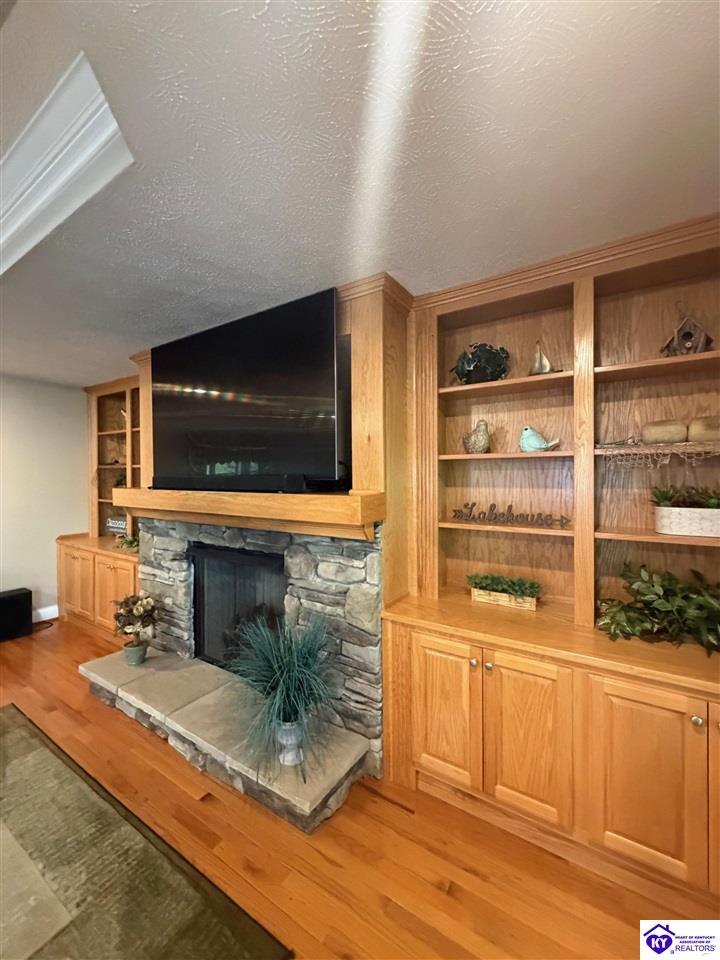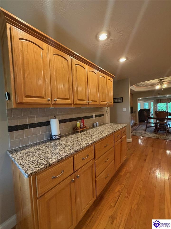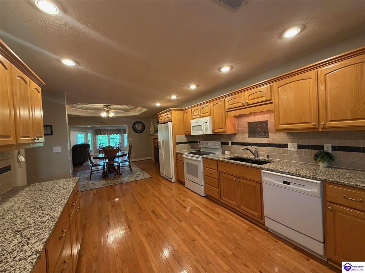 Realtor's notes: Lakefront home in Cannons Point Subdivision on Rough River Lake! This 3 bedroom, 3 bathroom home sits on a half-acre lot with direct backyard lake access and a private shared boat dock with COE approval. Enjoy easy lake living with a neighborhood boat ramp and courtesy dock just a short walk or golf cart ride away. The home features an open floor plan with hardwood floors, abundant natural light, and a spacious kitchen with granite countertops, custom cabinetry, and eat-in dining. The main level includes a private primary suite with walk-in shower, soaking tub, and attached laundry, plus two additional bedrooms and a full bath. The living area offers custom built-ins, tray ceilings, a gas fireplace, and access to a year-round sunroom with beautiful lake views. The finished walkout basement provides additional living space, a full bathroom, and access to a covered patio—perfect for entertaining. A standout feature is the incredible 6.5 car garage capacity, including multiple detached garages and a large 31x35 garage with heat, air, electric, and RV hookup—ideal for boats, campers, and lake toys. Don’t miss this rare opportunity to own a well-maintained lakefront home with direct access to Rough River Lake!