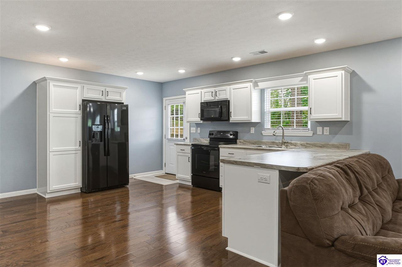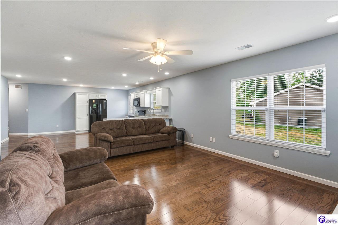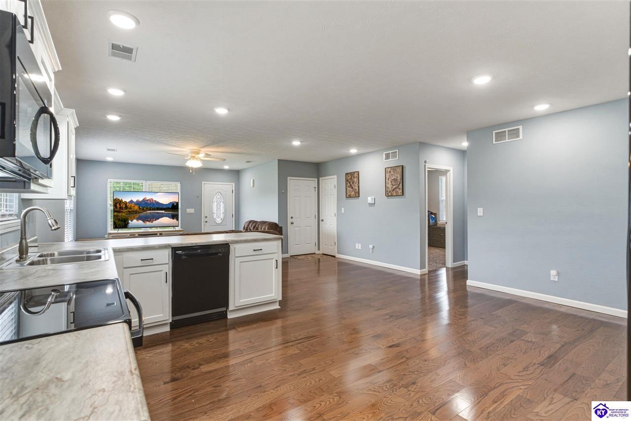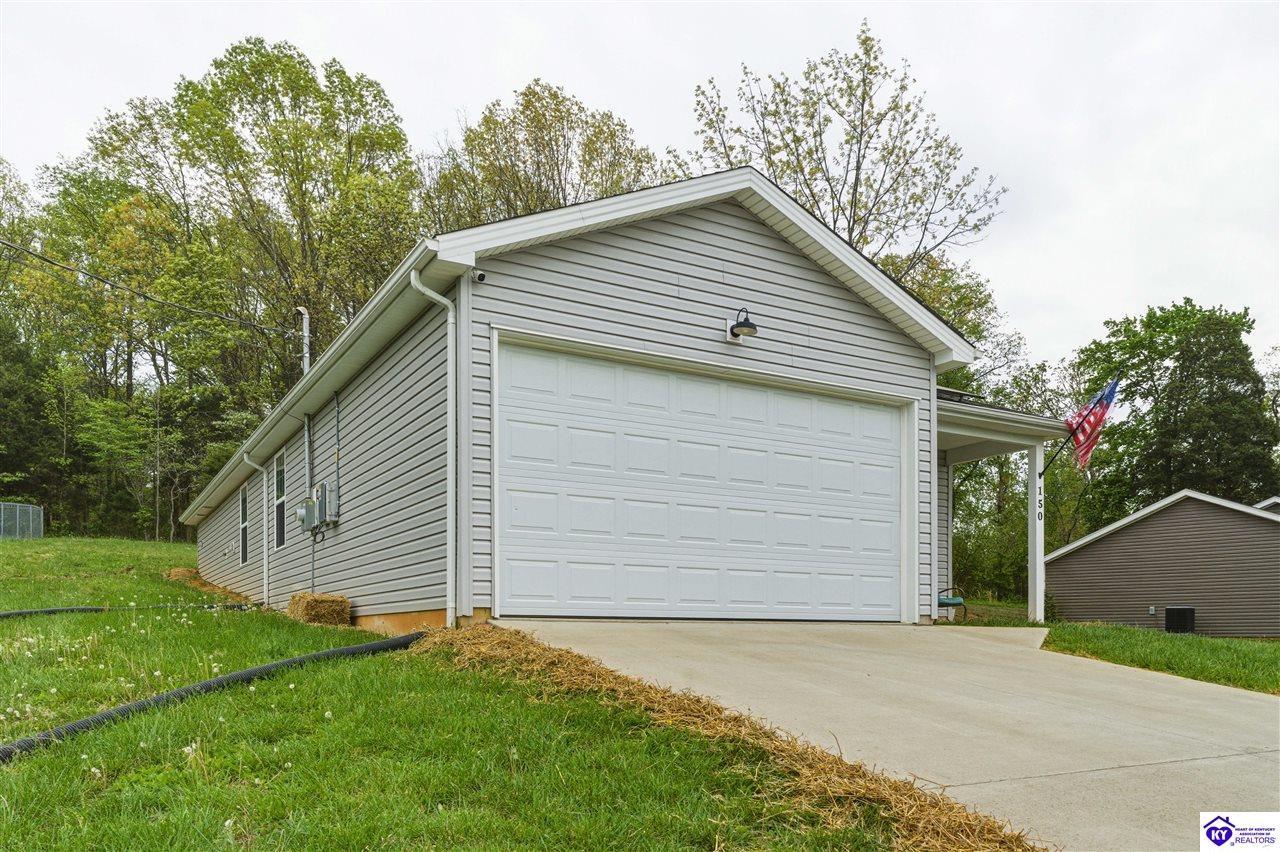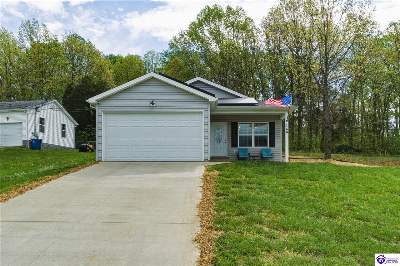 Realtor's notes: Built in 2023, this well-kept home offers 1,488 square feet, a 2-car garage, paid-for solar panels, and a covered front porch. At 150 Michael Lane in Brandenburg, the layout features an open living room with engineered hardwood floors flowing into an eat-in kitchen with generous counter space, white cabinetry, an electric range, microwave, dishwasher, and side-by-side refrigerator. The dining area is set within the kitchen for easy everyday living and entertaining. A separate hallway leads to the bedroom wing, where two secondary bedrooms offer carpet and good closet space. The hall bath includes a double vanity with hard-surface tops, tile flooring, and a fiberglass shower surround. The spacious primary bedroom also features carpet, double closets, and a private bath with double vanities, taller cabinetry, hard-surface tops, tile flooring, and a shower surround. Additional features include a laundry room with tile flooring, electric hot water, electric heat shingle roof, white vinyl siding, and city water and sewer through the City of Brandenburg. Outside, you'll find a small side porch, exterior solar features, and the convenience of an attached 2-car garage. A standout feature of this home is the installed solar panel system, which is fully paid for and will transfer with the property, offering the potential for long- term energy savings and lower electric utility costs. With modern finishes, energy-efficient features, and a functional single-level layout, this 2023-built home offers comfortable living in a practical Brandenburg location.