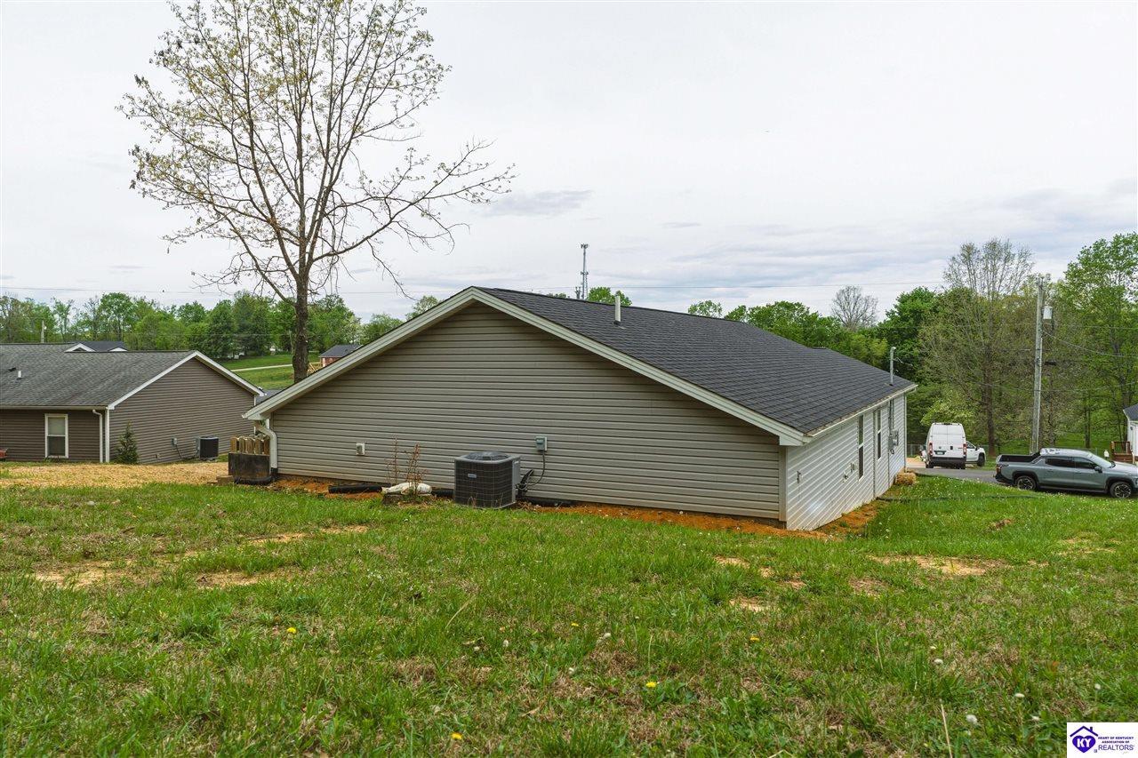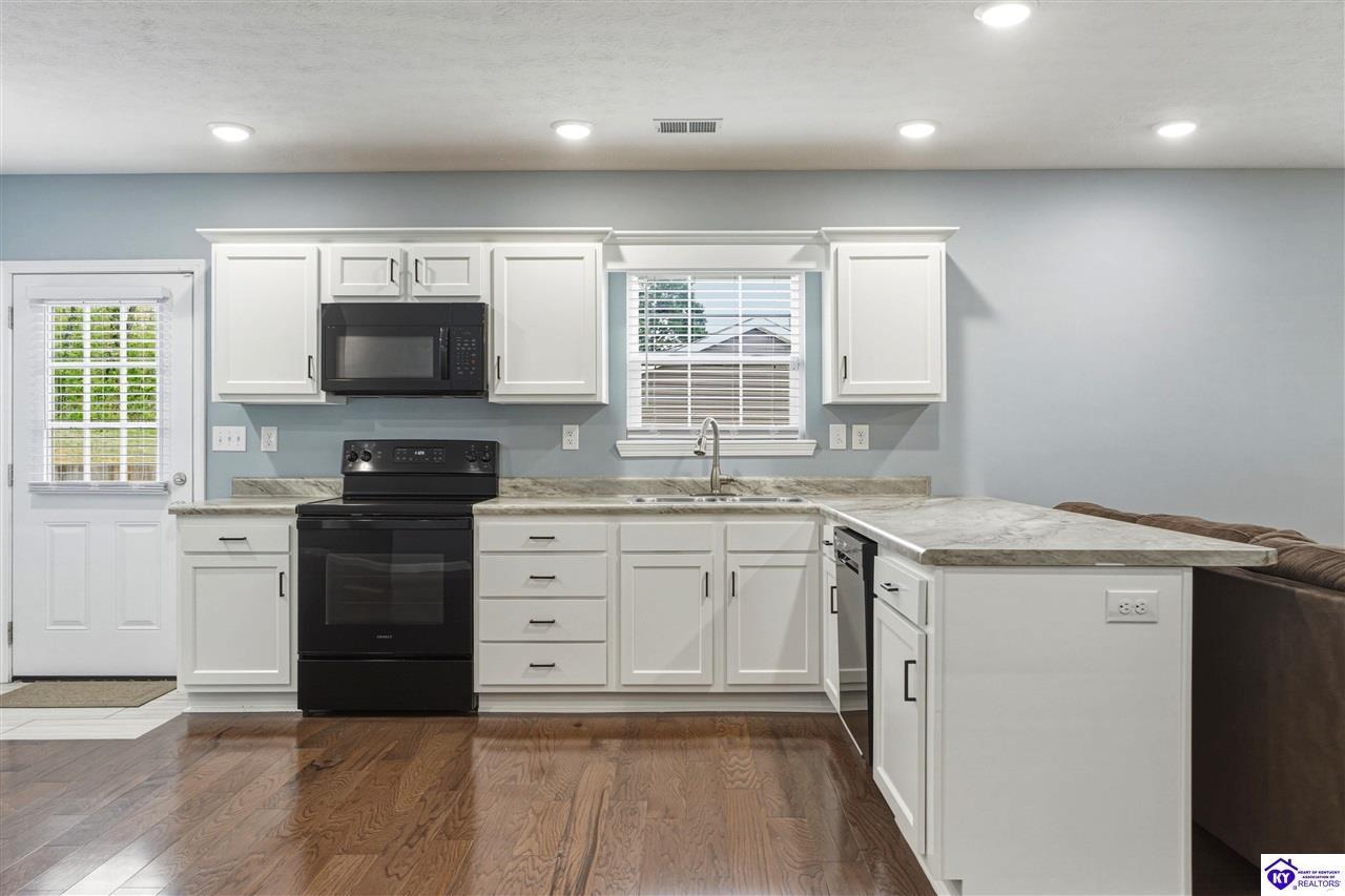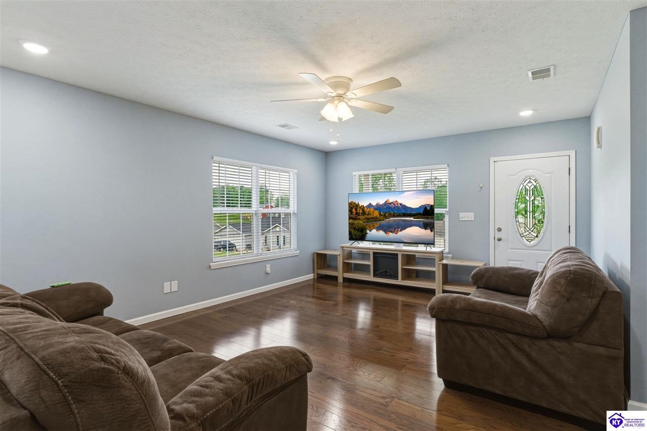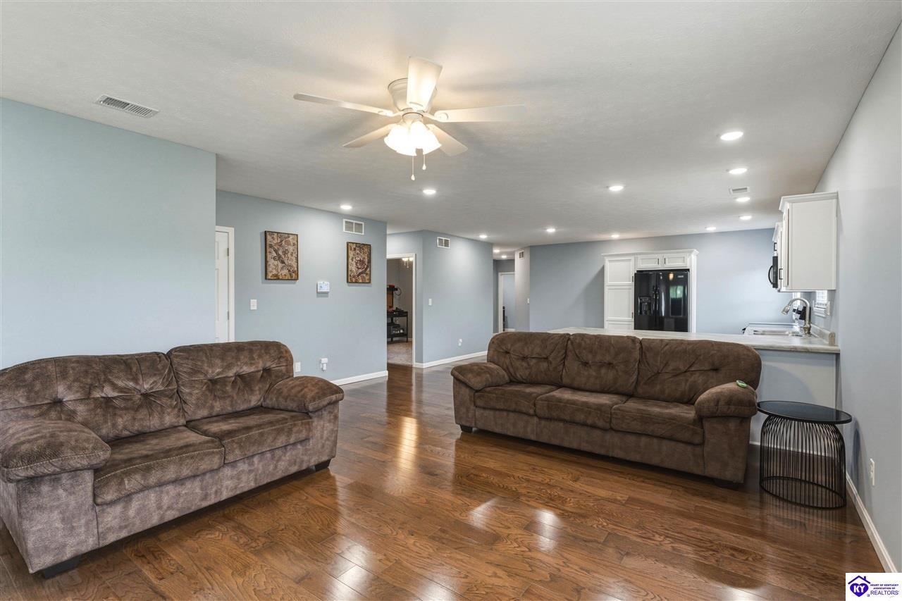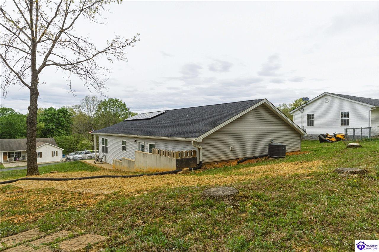 Realtor's notes: Built in 2023, this well-kept home offers 1,488 square feet, a 2-car garage, paid-for solar panels, and a covered front porch. At 150 Michael Lane in Brandenburg, the layout features an open living room with engineered hardwood floors flowing into an eat-in kitchen with generous counter space, white cabinetry, an electric range, microwave, dishwasher, and side-by-side refrigerator. The dining area is set within the kitchen for easy everyday living and entertaining. A separate hallway leads to the bedroom wing, where two secondary bedrooms offer carpet and good closet space. The hall bath includes a double vanity with hard-surface tops, tile flooring, and a fiberglass shower surround. The spacious primary bedroom also features carpet, double closets, and a private bath with double vanities, taller cabinetry, hard-surface tops, tile flooring, and a shower surround. Additional features include a laundry room with tile flooring, electric hot water, electric heat shingle roof, white vinyl siding, and city water and sewer through the City of Brandenburg. Outside, you'll find a small side porch, exterior solar features, and the convenience of an attached 2-car garage. A standout feature of this home is the installed solar panel system, which is fully paid for and will transfer with the property, offering the potential for long- term energy savings and lower electric utility costs. With modern finishes, energy-efficient features, and a functional single-level layout, this 2023-built home offers comfortable living in a practical Brandenburg location.