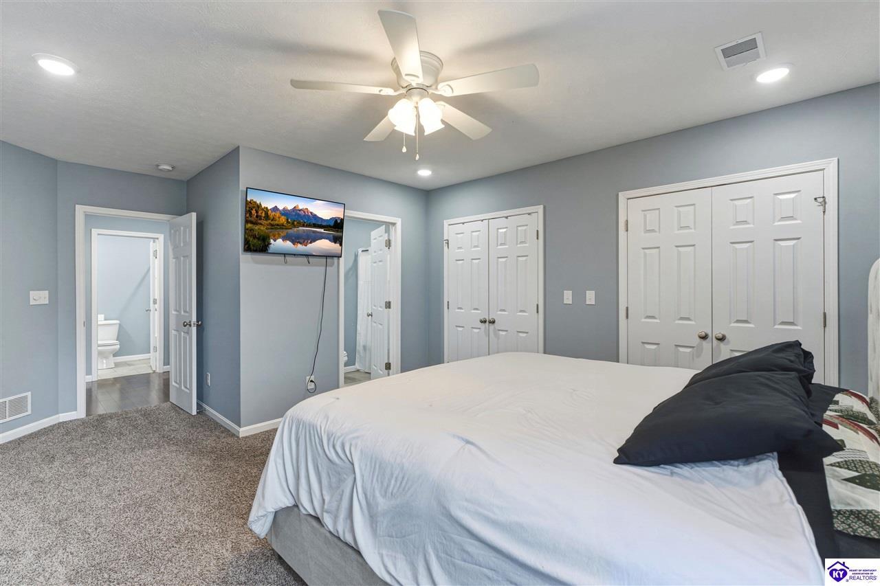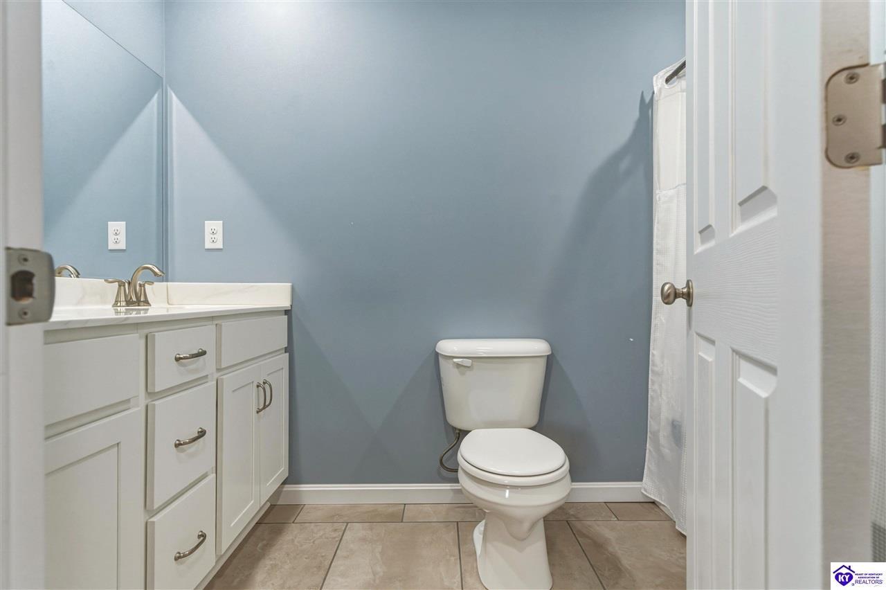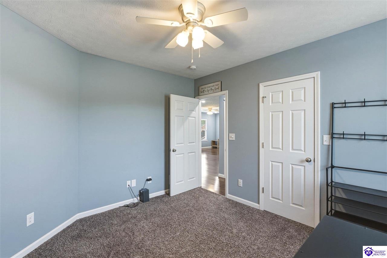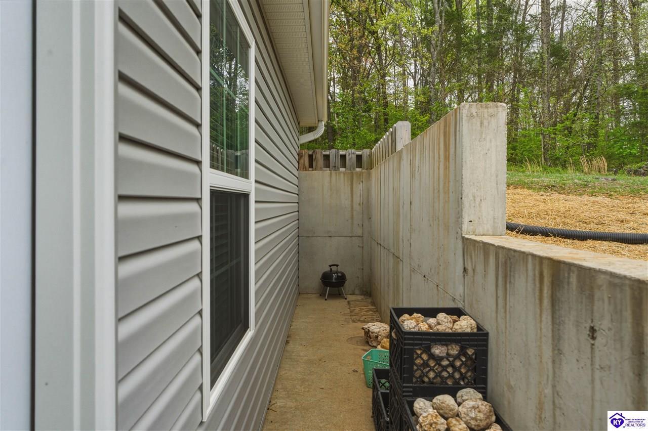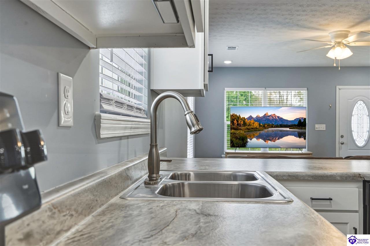 Realtor's notes: Built in 2023, this well-kept home offers 1,488 square feet, a 2-car garage, paid-for solar panels, and a covered front porch. At 150 Michael Lane in Brandenburg, the layout features an open living room with engineered hardwood floors flowing into an eat-in kitchen with generous counter space, white cabinetry, an electric range, microwave, dishwasher, and side-by-side refrigerator. The dining area is set within the kitchen for easy everyday living and entertaining. A separate hallway leads to the bedroom wing, where two secondary bedrooms offer carpet and good closet space. The hall bath includes a double vanity with hard-surface tops, tile flooring, and a fiberglass shower surround. The spacious primary bedroom also features carpet, double closets, and a private bath with double vanities, taller cabinetry, hard-surface tops, tile flooring, and a shower surround. Additional features include a laundry room with tile flooring, electric hot water, electric heat shingle roof, white vinyl siding, and city water and sewer through the City of Brandenburg. Outside, you'll find a small side porch, exterior solar features, and the convenience of an attached 2-car garage. A standout feature of this home is the installed solar panel system, which is fully paid for and will transfer with the property, offering the potential for long- term energy savings and lower electric utility costs. With modern finishes, energy-efficient features, and a functional single-level layout, this 2023-built home offers comfortable living in a practical Brandenburg location.