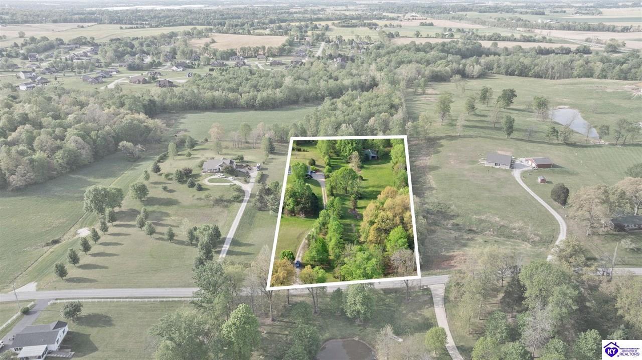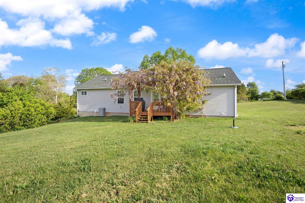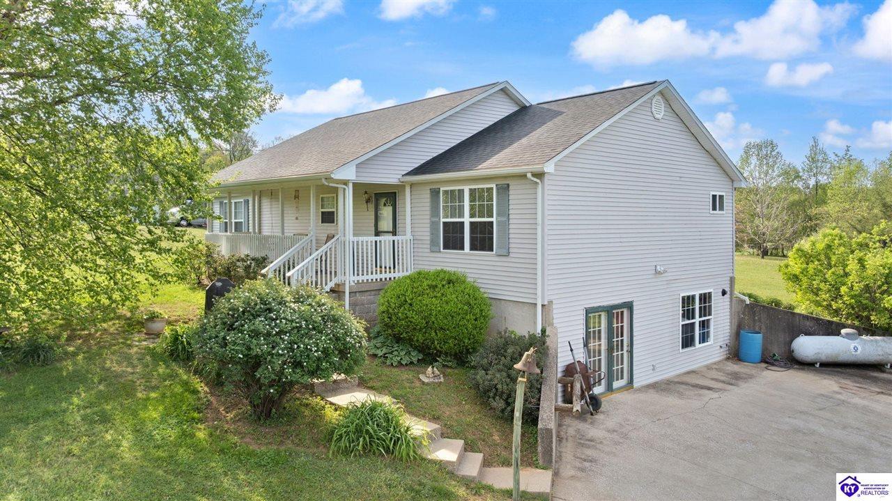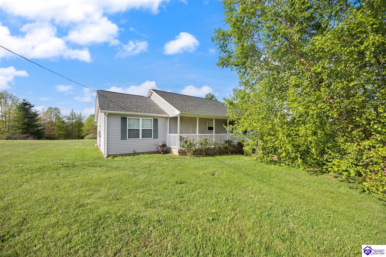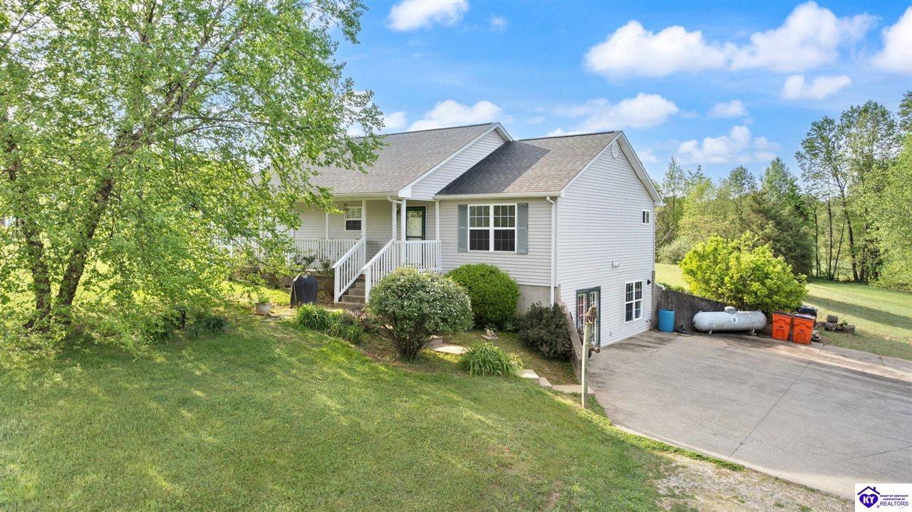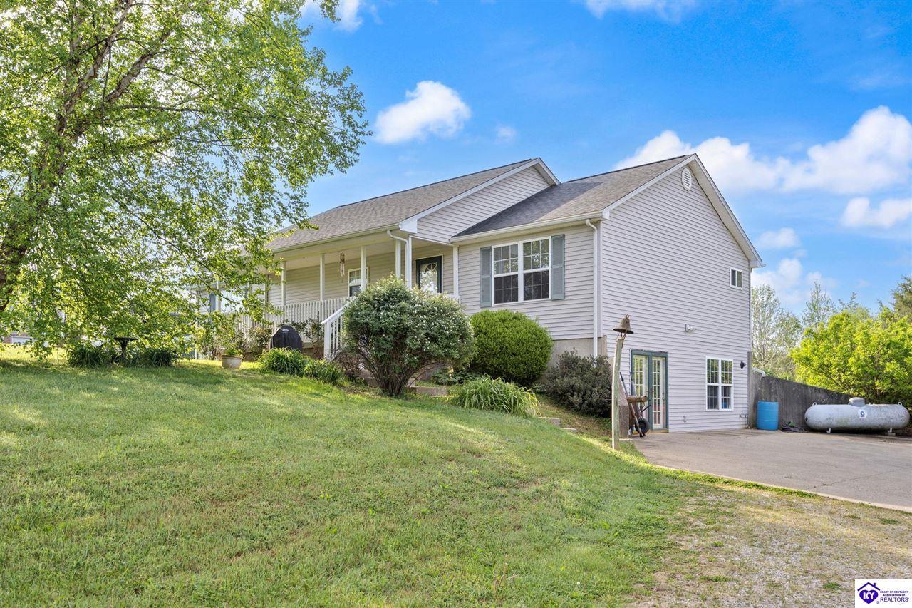 Realtor's notes: Welcome home to this raised ranch situated on 5 private, tree-lined acres just outside the Elizabethtown city limits. This custom-built, one-owner home has been well maintained and features a desirable split floor plan with an open-concept living area and hardwood floors. All bedrooms are generously sized and include walk-in closets. The recently remodeled primary suite offers a spacious walk-in closet with a custom storage system and a beautifully updated bathroom featuring a double vanity, separate walk-in shower, and relaxing whirlpool tub. The kitchen includes a walk-in pantry, full appliance package, and recent updates such as a newer refrigerator and dishwasher. The unfinished basement provides excellent potential for additional living space, ready for your personal touch. Enjoy the versatility of the 5-acre property, complete with a detached building previously used for horses—ideal for a hobby farm, workshop, or recreational use. Bring your ideas and make it your own!