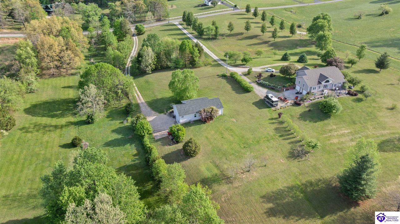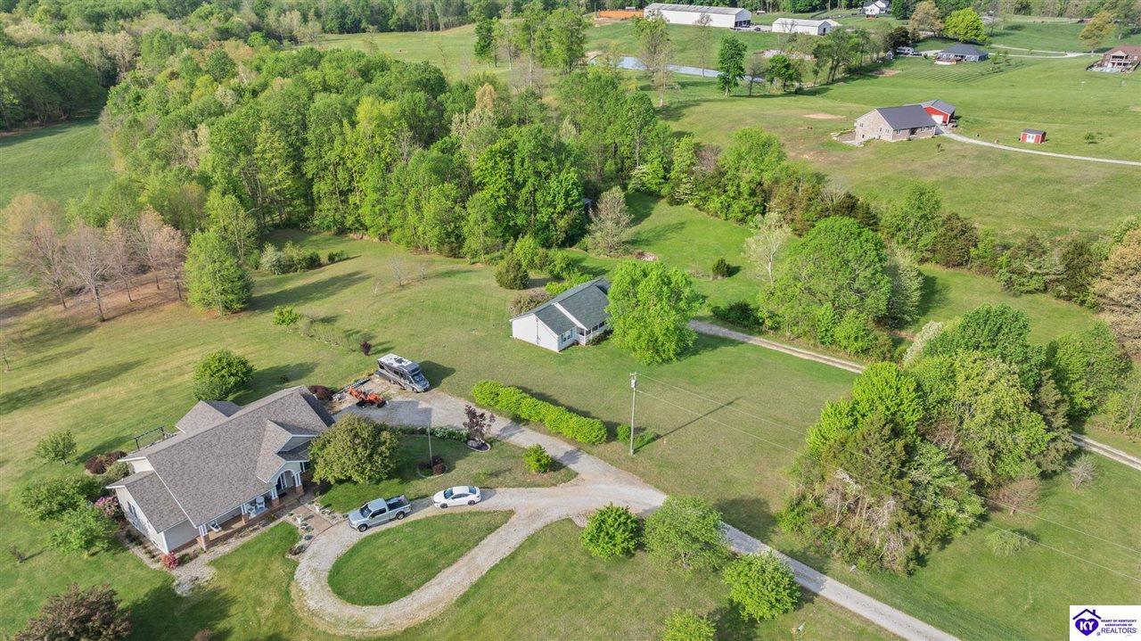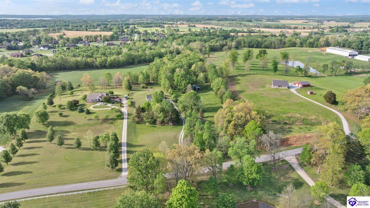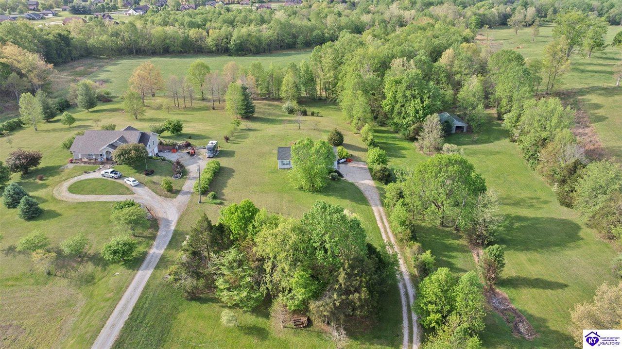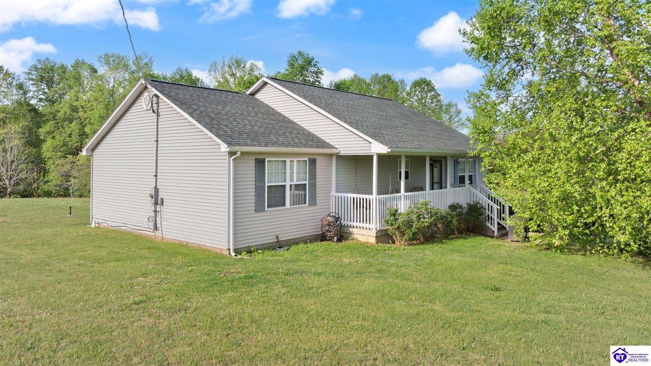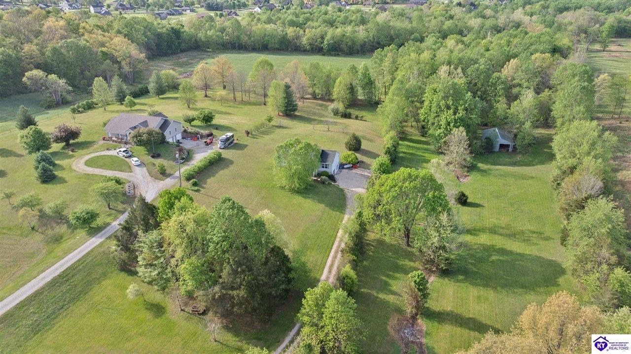 Realtor's notes: Welcome home to this raised ranch situated on 5 private, tree-lined acres just outside the Elizabethtown city limits. This custom-built, one-owner home has been well maintained and features a desirable split floor plan with an open-concept living area and hardwood floors. All bedrooms are generously sized and include walk-in closets. The recently remodeled primary suite offers a spacious walk-in closet with a custom storage system and a beautifully updated bathroom featuring a double vanity, separate walk-in shower, and relaxing whirlpool tub. The kitchen includes a walk-in pantry, full appliance package, and recent updates such as a newer refrigerator and dishwasher. The unfinished basement provides excellent potential for additional living space, ready for your personal touch. Enjoy the versatility of the 5-acre property, complete with a detached building previously used for horses—ideal for a hobby farm, workshop, or recreational use. Bring your ideas and make it your own!
