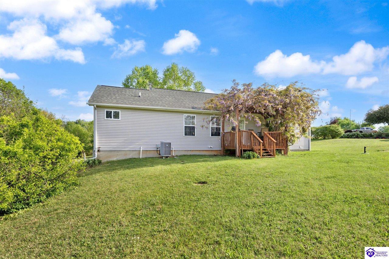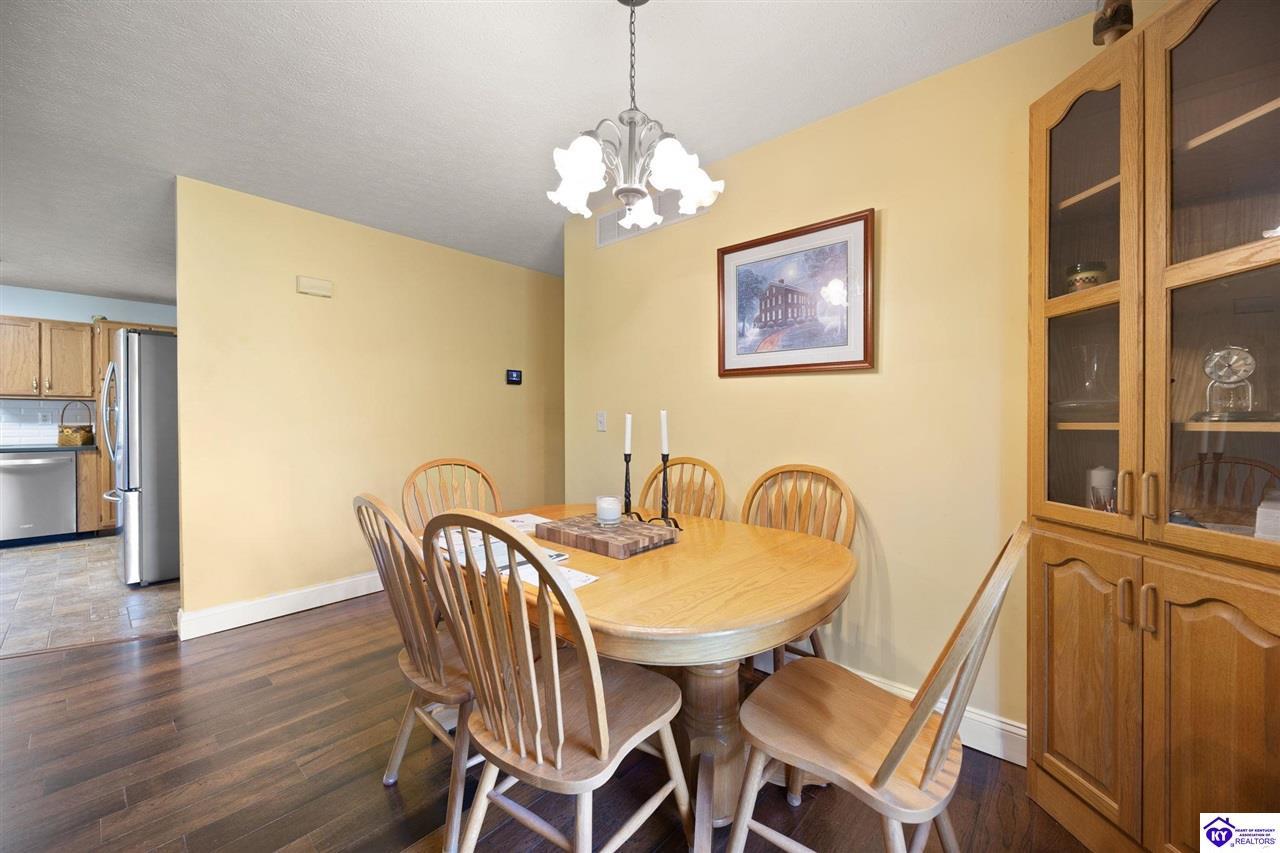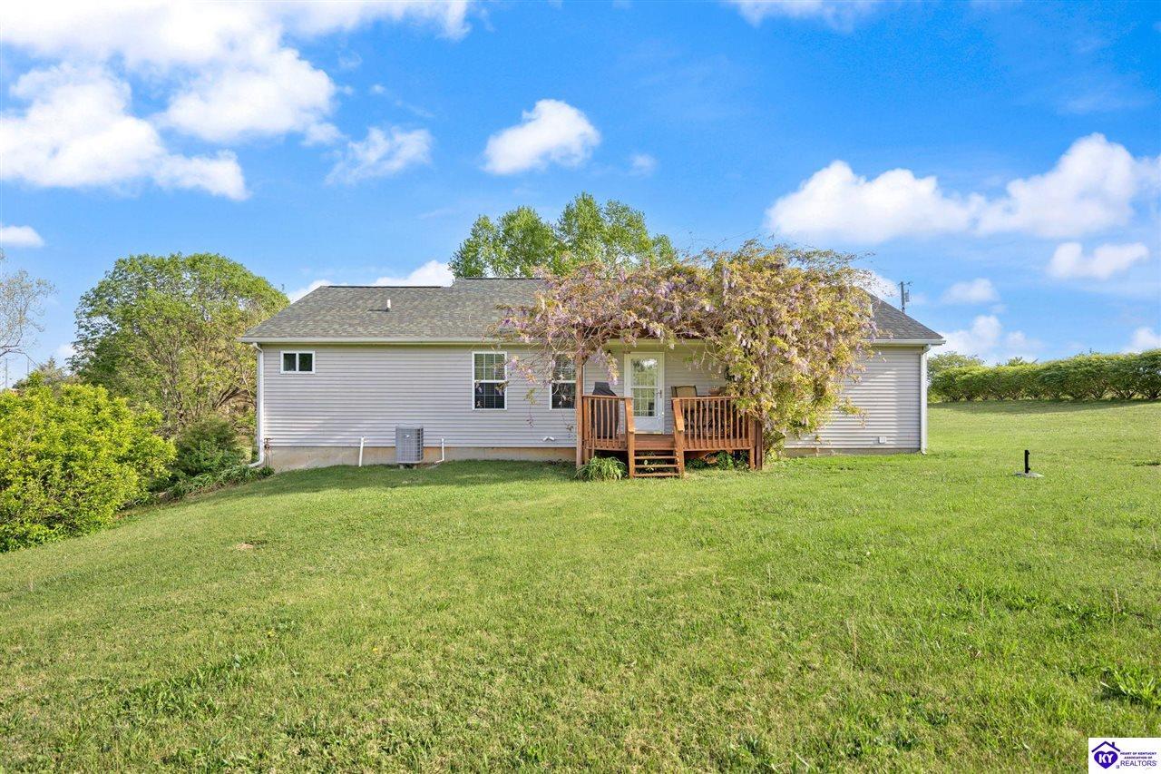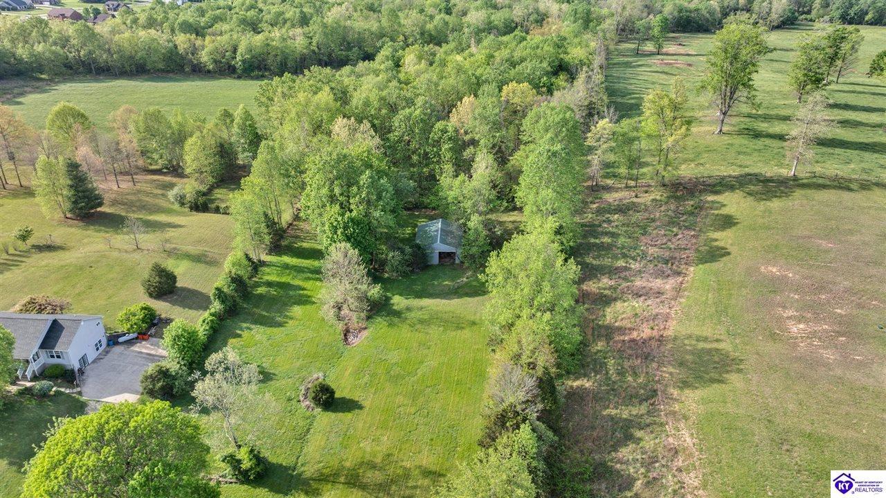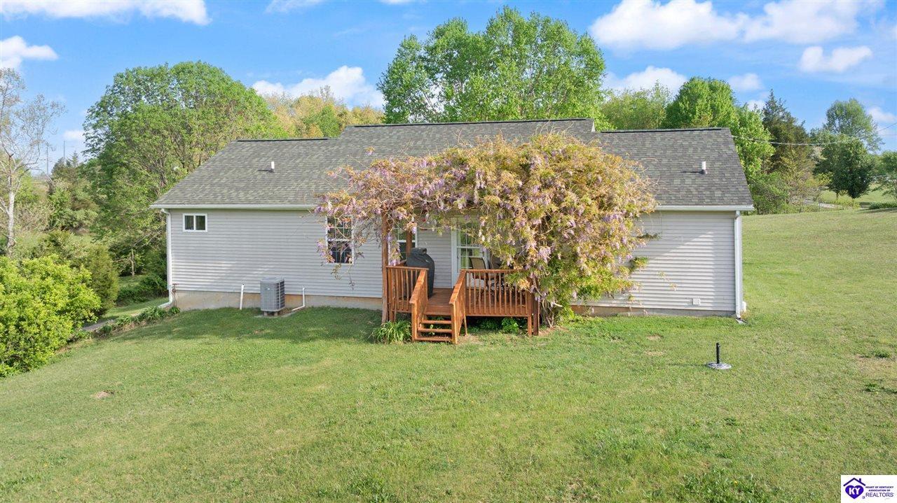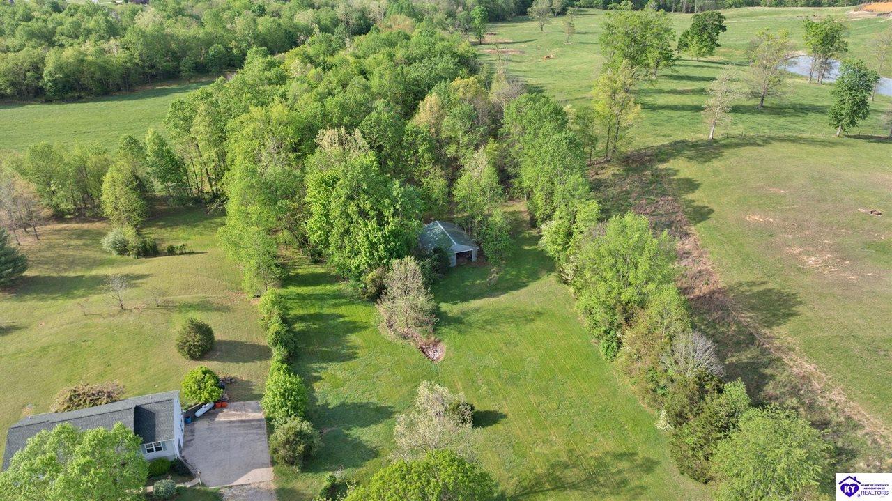Realtor's notes: Welcome home to this raised ranch situated on 5 private, tree-lined acres just outside the Elizabethtown city limits. This custom-built, one-owner home has been well maintained and features a desirable split floor plan with an open-concept living area and hardwood floors. All bedrooms are generously sized and include walk-in closets. The recently remodeled primary suite offers a spacious walk-in closet with a custom storage system and a beautifully updated bathroom featuring a double vanity, separate walk-in shower, and relaxing whirlpool tub. The kitchen includes a walk-in pantry, full appliance package, and recent updates such as a newer refrigerator and dishwasher. The unfinished basement provides excellent potential for additional living space, ready for your personal touch. Enjoy the versatility of the 5-acre property, complete with a detached building previously used for horses—ideal for a hobby farm, workshop, or recreational use. Bring your ideas and make it your own!