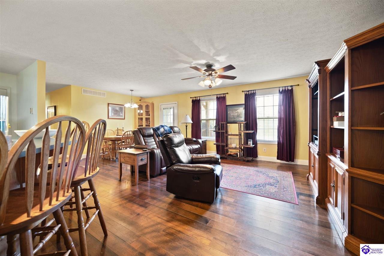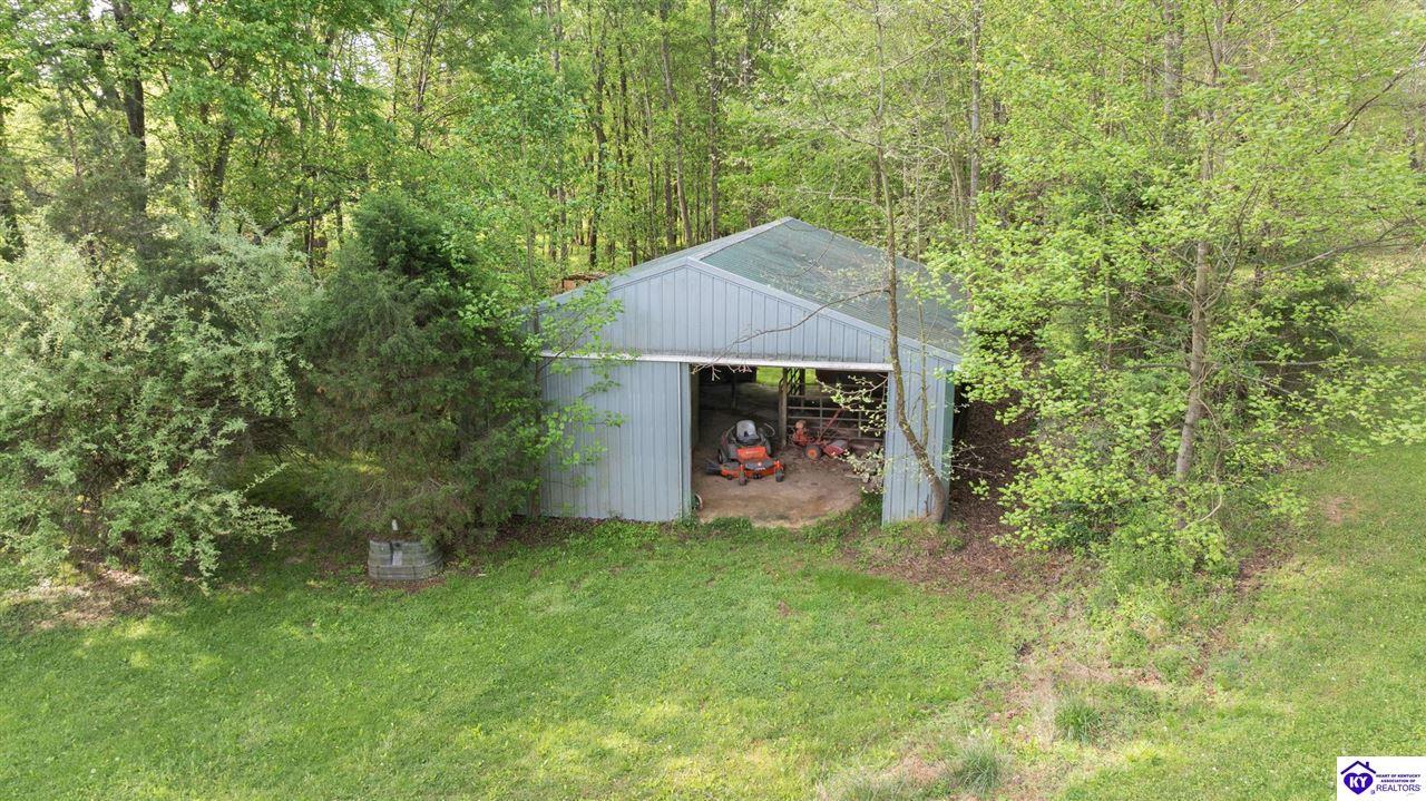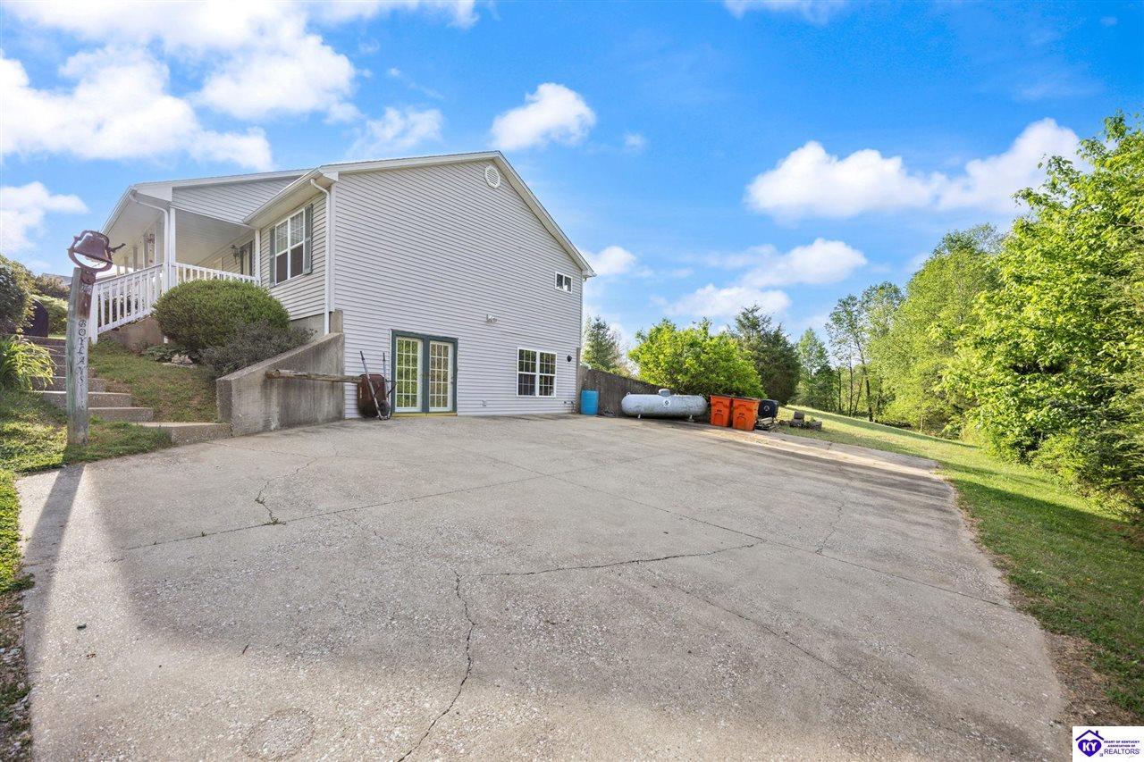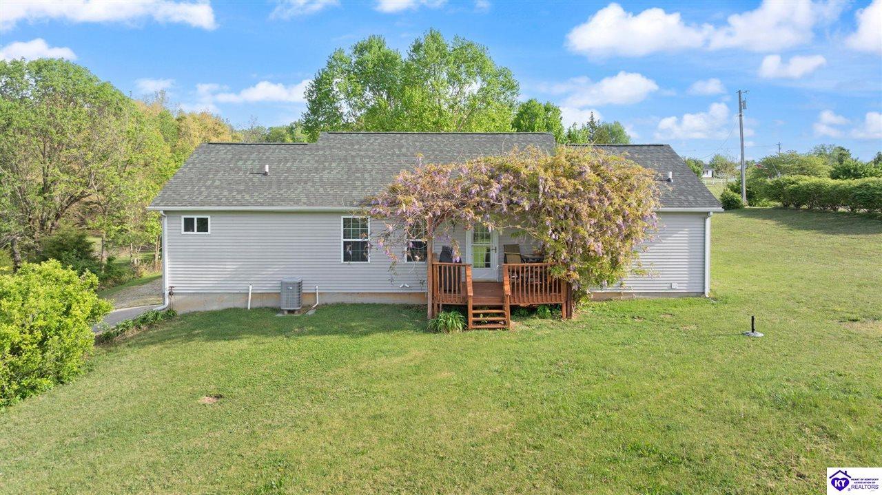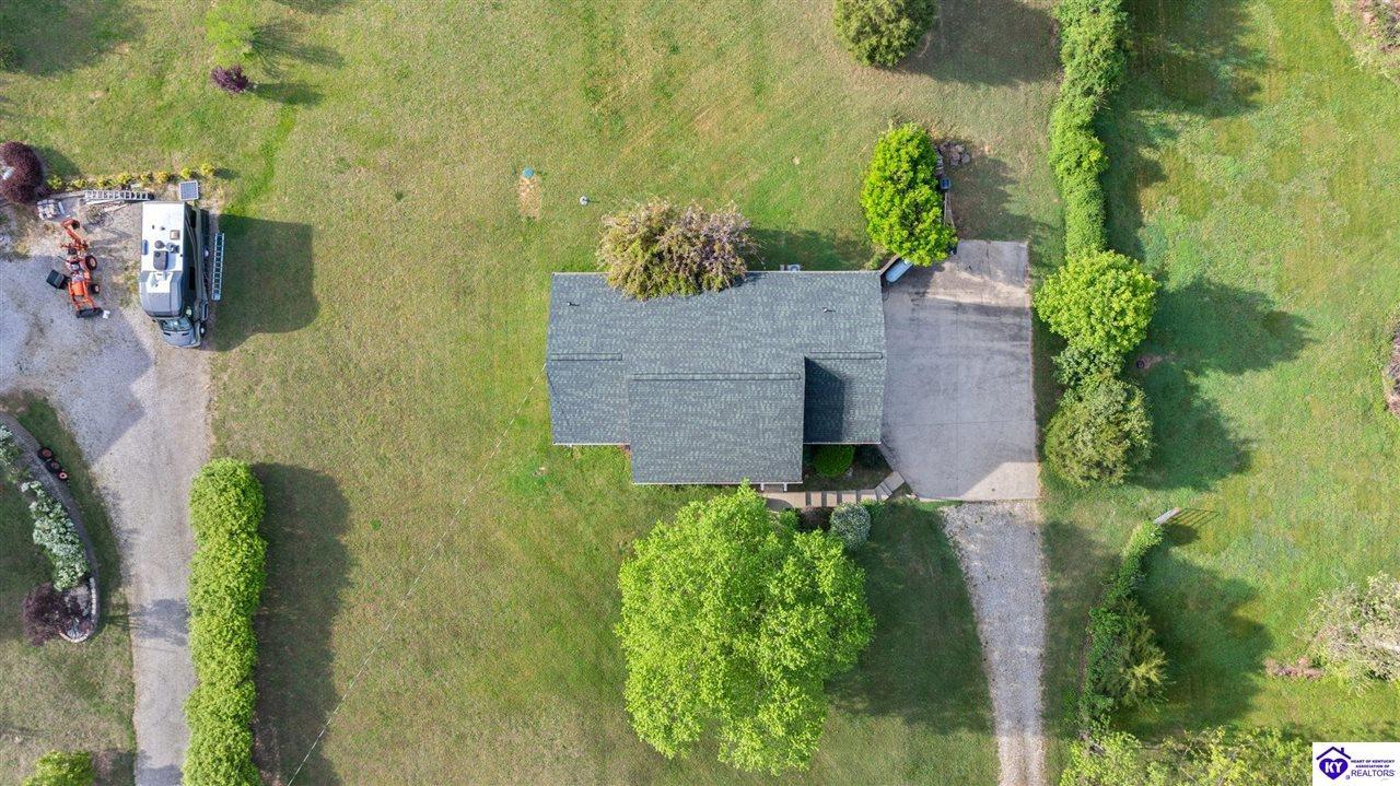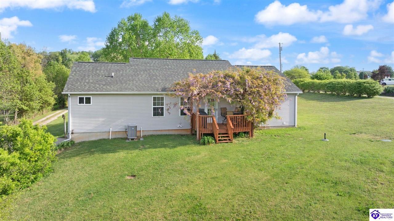 Realtor's notes: Welcome home to this raised ranch situated on 5 private, tree-lined acres just outside the Elizabethtown city limits. This custom-built, one-owner home has been well maintained and features a desirable split floor plan with an open-concept living area and hardwood floors. All bedrooms are generously sized and include walk-in closets. The recently remodeled primary suite offers a spacious walk-in closet with a custom storage system and a beautifully updated bathroom featuring a double vanity, separate walk-in shower, and relaxing whirlpool tub. The kitchen includes a walk-in pantry, full appliance package, and recent updates such as a newer refrigerator and dishwasher. The unfinished basement provides excellent potential for additional living space, ready for your personal touch. Enjoy the versatility of the 5-acre property, complete with a detached building previously used for horses—ideal for a hobby farm, workshop, or recreational use. Bring your ideas and make it your own!