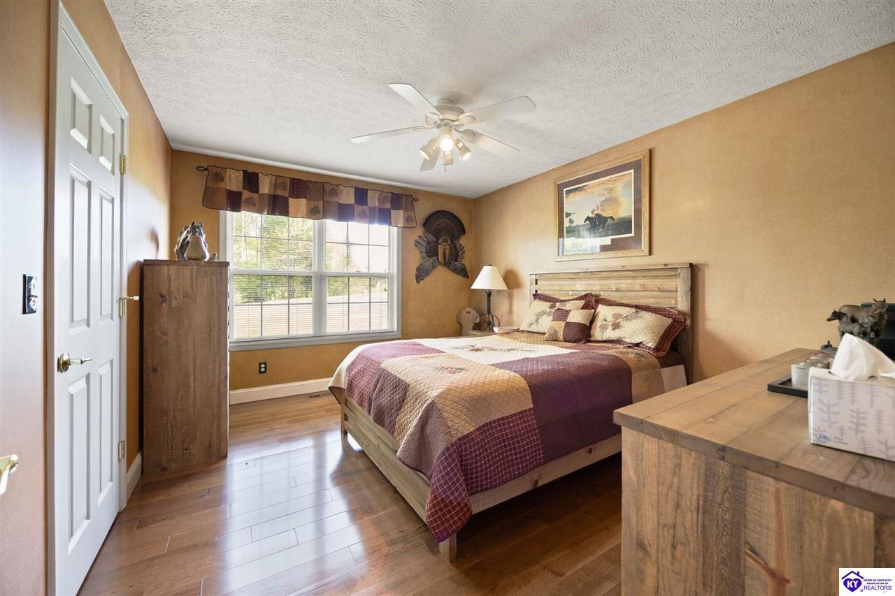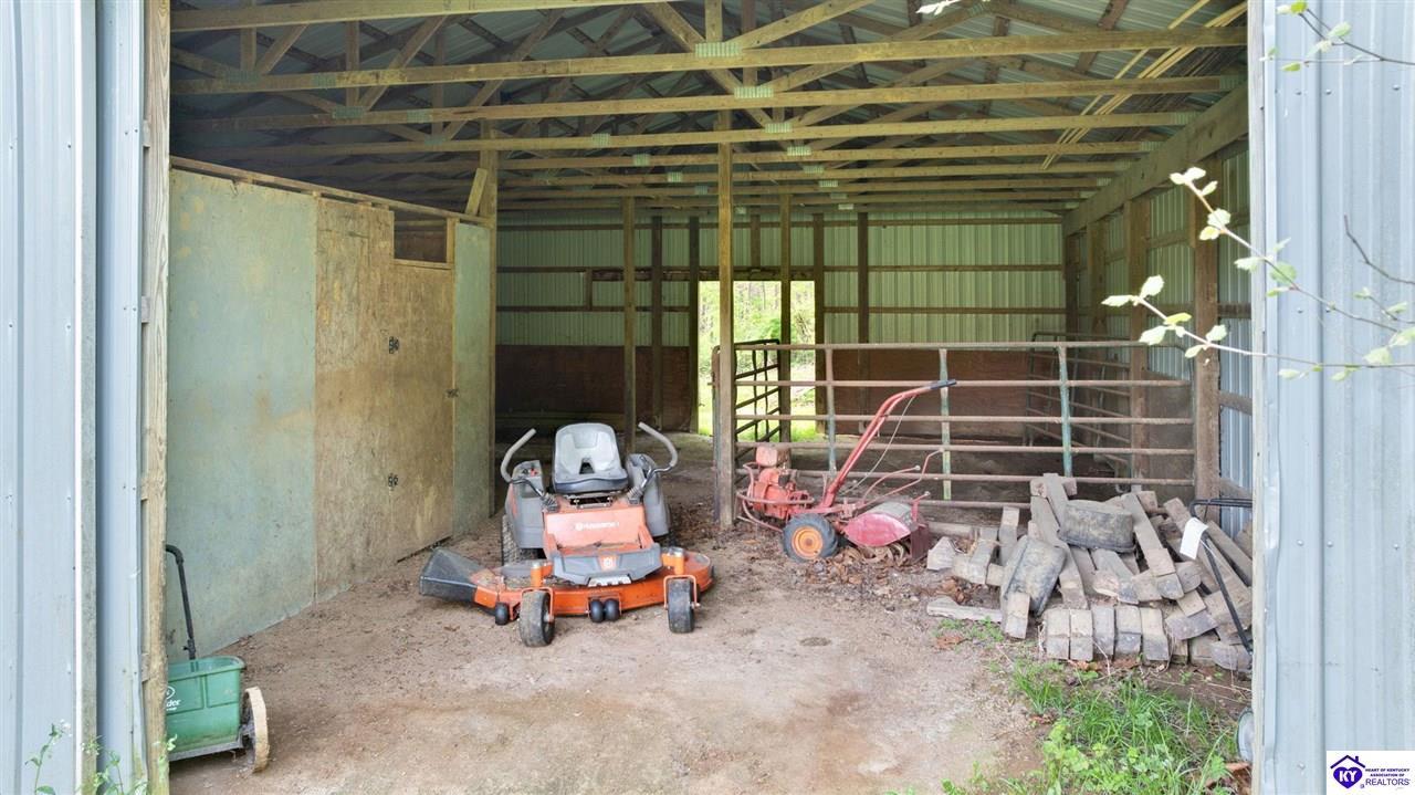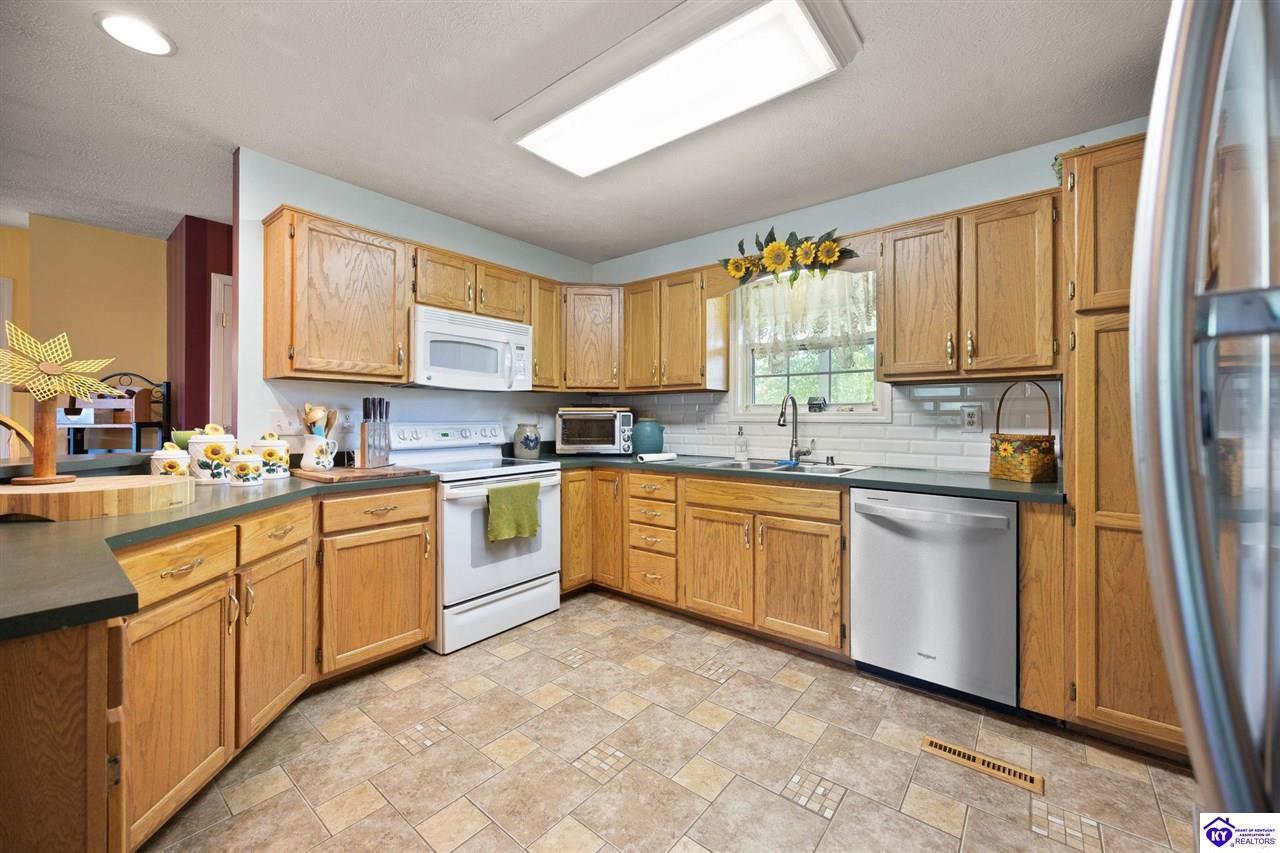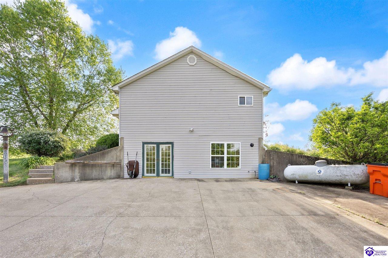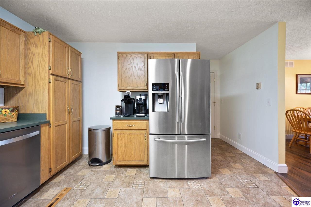 Realtor's notes: Welcome home to this raised ranch situated on 5 private, tree-lined acres just outside the Elizabethtown city limits. This custom-built, one-owner home has been well maintained and features a desirable split floor plan with an open-concept living area and hardwood floors. All bedrooms are generously sized and include walk-in closets. The recently remodeled primary suite offers a spacious walk-in closet with a custom storage system and a beautifully updated bathroom featuring a double vanity, separate walk-in shower, and relaxing whirlpool tub. The kitchen includes a walk-in pantry, full appliance package, and recent updates such as a newer refrigerator and dishwasher. The unfinished basement provides excellent potential for additional living space, ready for your personal touch. Enjoy the versatility of the 5-acre property, complete with a detached building previously used for horses—ideal for a hobby farm, workshop, or recreational use. Bring your ideas and make it your own!