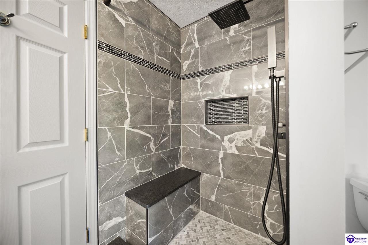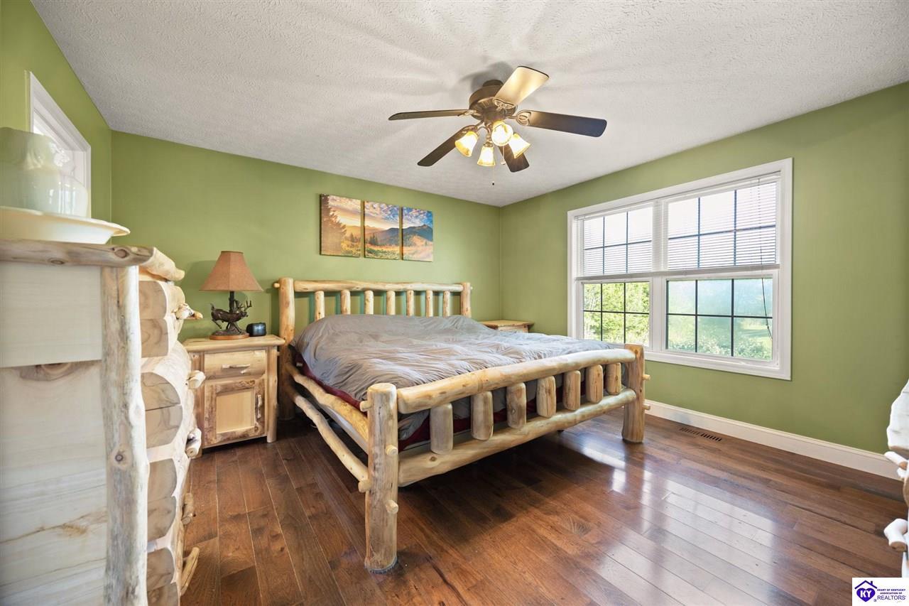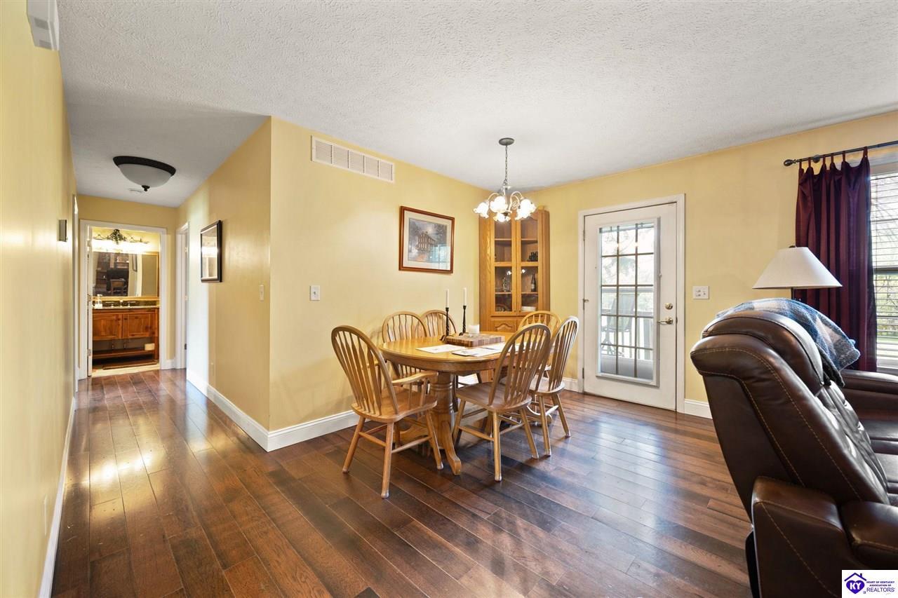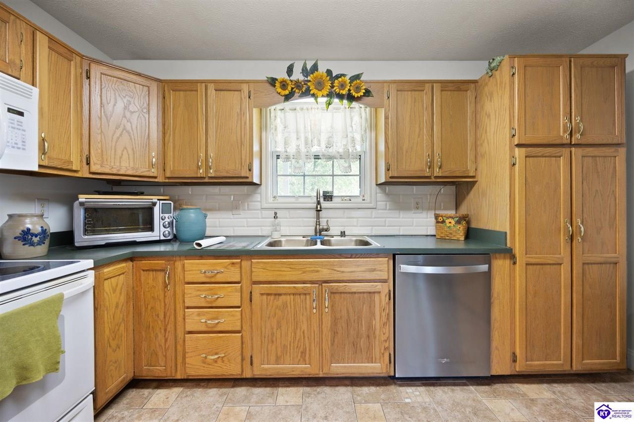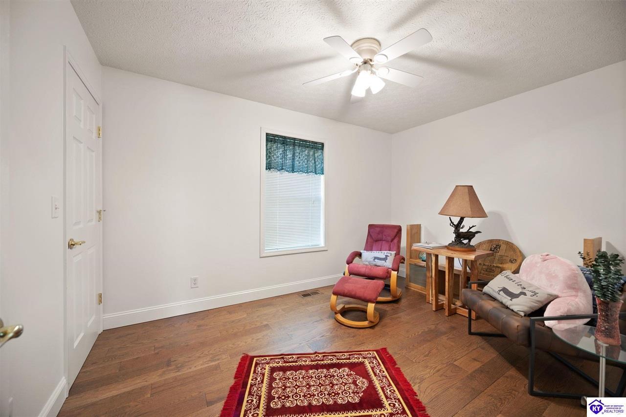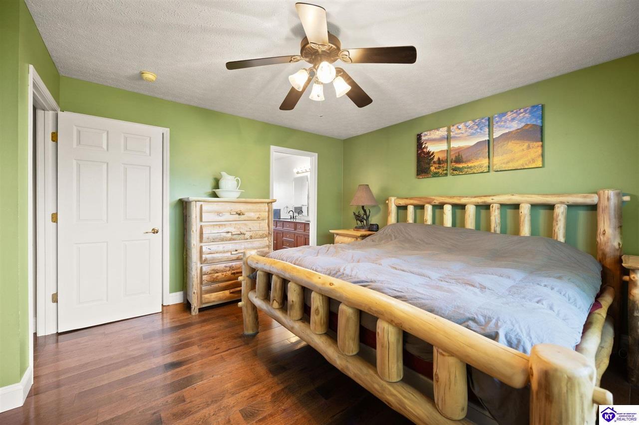 Realtor's notes: Welcome home to this raised ranch situated on 5 private, tree-lined acres just outside the Elizabethtown city limits. This custom-built, one-owner home has been well maintained and features a desirable split floor plan with an open-concept living area and hardwood floors. All bedrooms are generously sized and include walk-in closets. The recently remodeled primary suite offers a spacious walk-in closet with a custom storage system and a beautifully updated bathroom featuring a double vanity, separate walk-in shower, and relaxing whirlpool tub. The kitchen includes a walk-in pantry, full appliance package, and recent updates such as a newer refrigerator and dishwasher. The unfinished basement provides excellent potential for additional living space, ready for your personal touch. Enjoy the versatility of the 5-acre property, complete with a detached building previously used for horses—ideal for a hobby farm, workshop, or recreational use. Bring your ideas and make it your own!