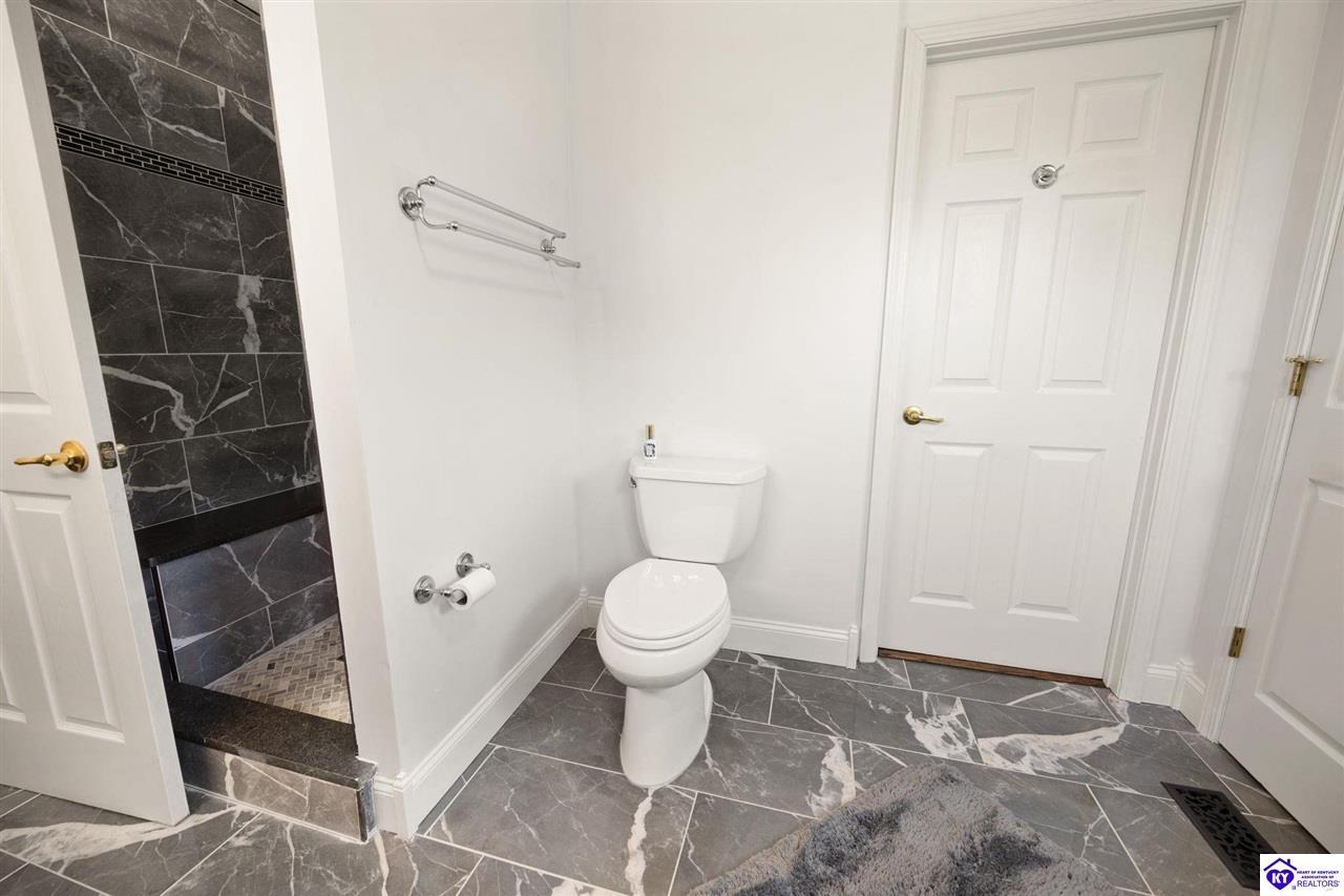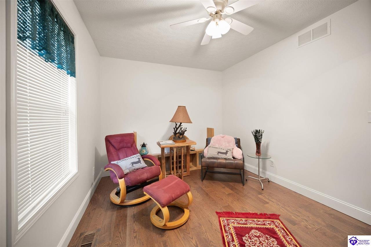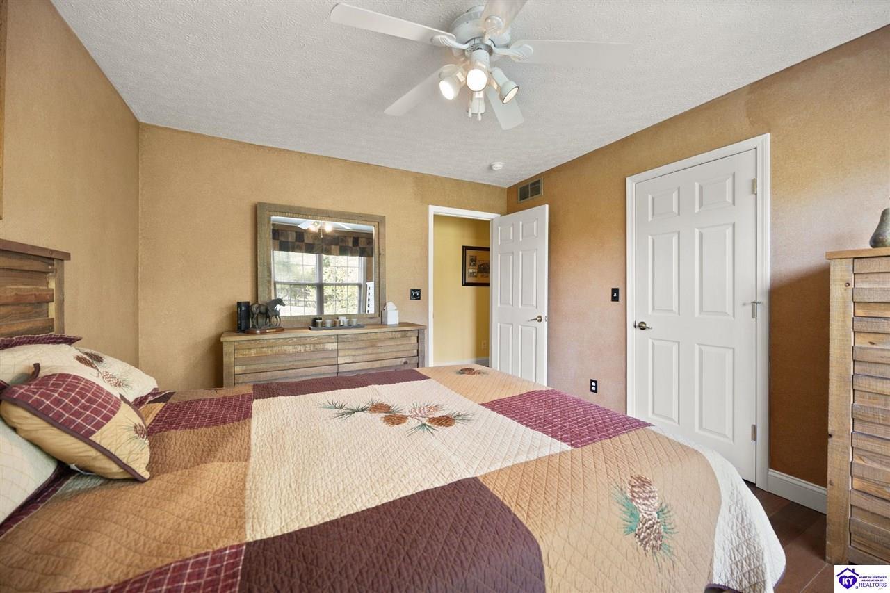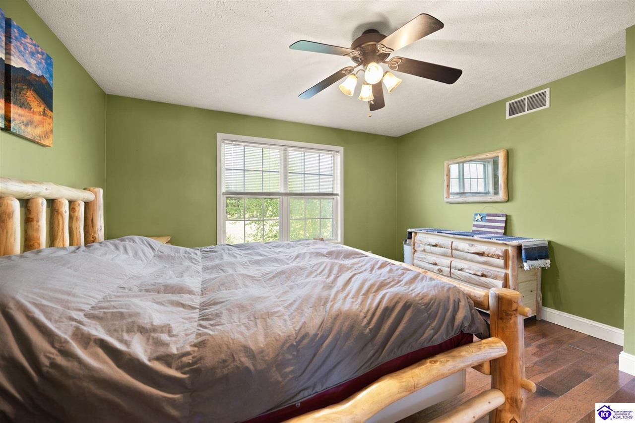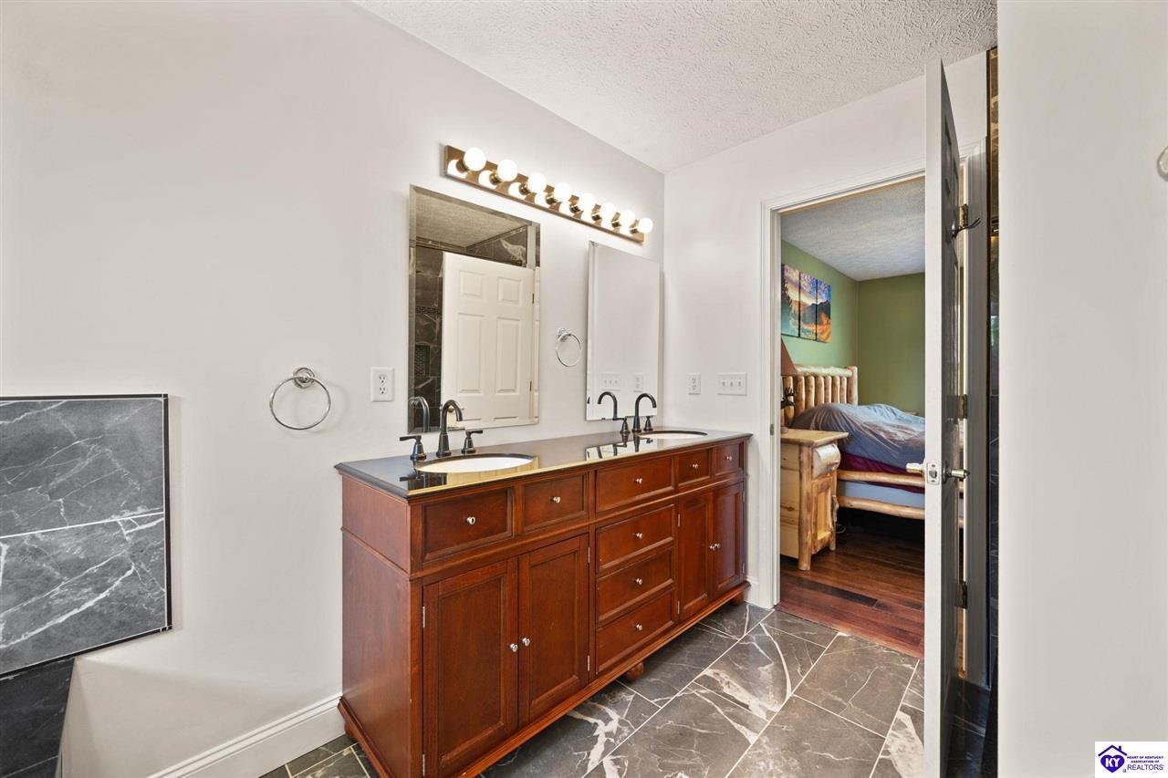 Realtor's notes: Welcome home to this raised ranch situated on 5 private, tree-lined acres just outside the Elizabethtown city limits. This custom-built, one-owner home has been well maintained and features a desirable split floor plan with an open-concept living area and hardwood floors. All bedrooms are generously sized and include walk-in closets. The recently remodeled primary suite offers a spacious walk-in closet with a custom storage system and a beautifully updated bathroom featuring a double vanity, separate walk-in shower, and relaxing whirlpool tub. The kitchen includes a walk-in pantry, full appliance package, and recent updates such as a newer refrigerator and dishwasher. The unfinished basement provides excellent potential for additional living space, ready for your personal touch. Enjoy the versatility of the 5-acre property, complete with a detached building previously used for horses—ideal for a hobby farm, workshop, or recreational use. Bring your ideas and make it your own!