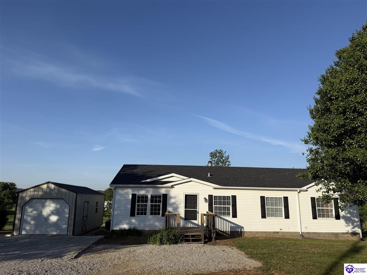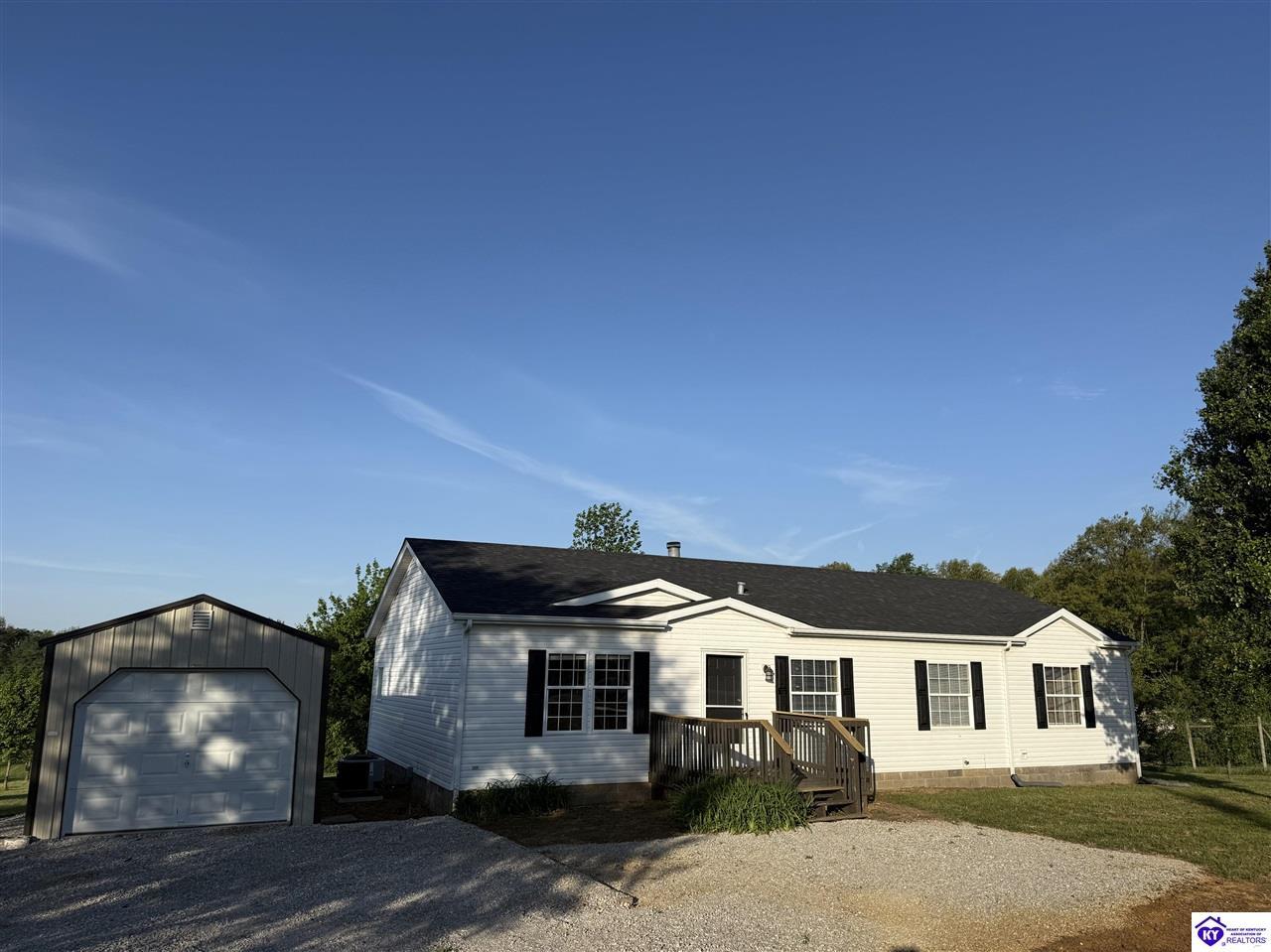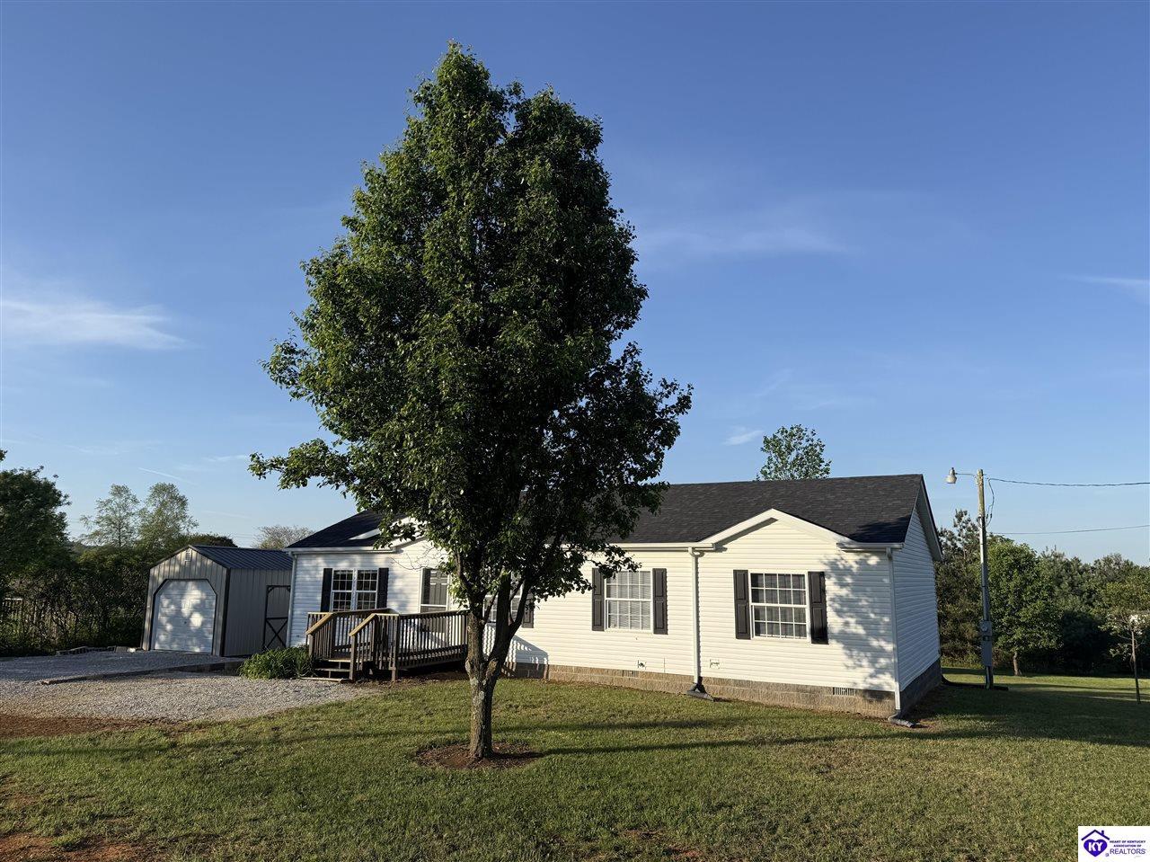 Realtor's notes: Charming 3 bedroom, 2 bathroom home located in the heart of Ekron, KY! This property offers a great location with convenient access to nearby amenities while still providing a peaceful setting. Inside, you’ll find a cozy wood fireplace, spacious walk-in closets, and a functional layout perfect for everyday living. Step outside to enjoy the covered rear deck overlooking a large backyard—ideal for relaxing or entertaining. Additional building remains on the property provide extra potential for storage or future use. Qualifies for FHA & VA financing. Don't miss out on your chance to own this beautiful home!