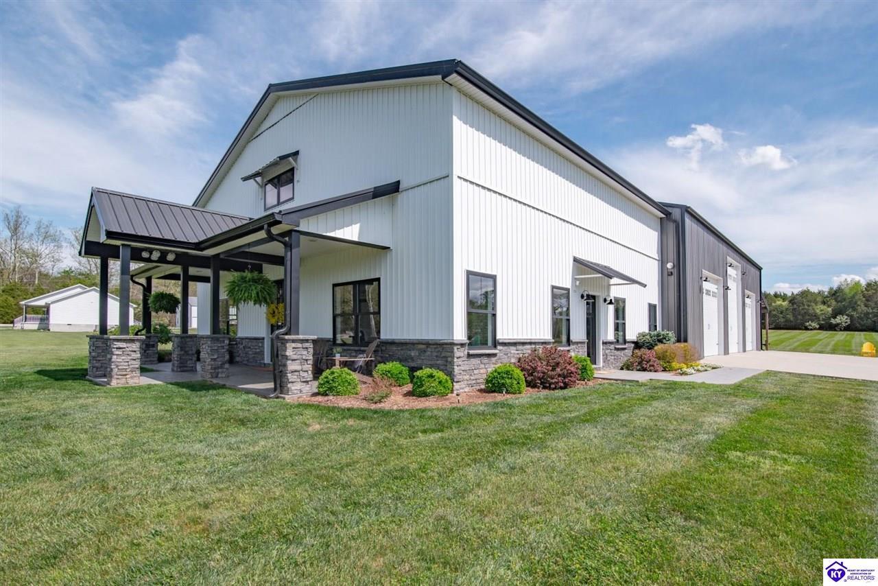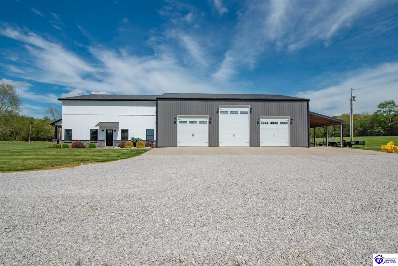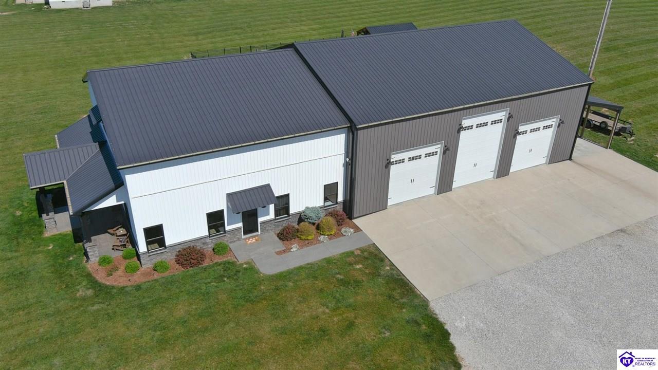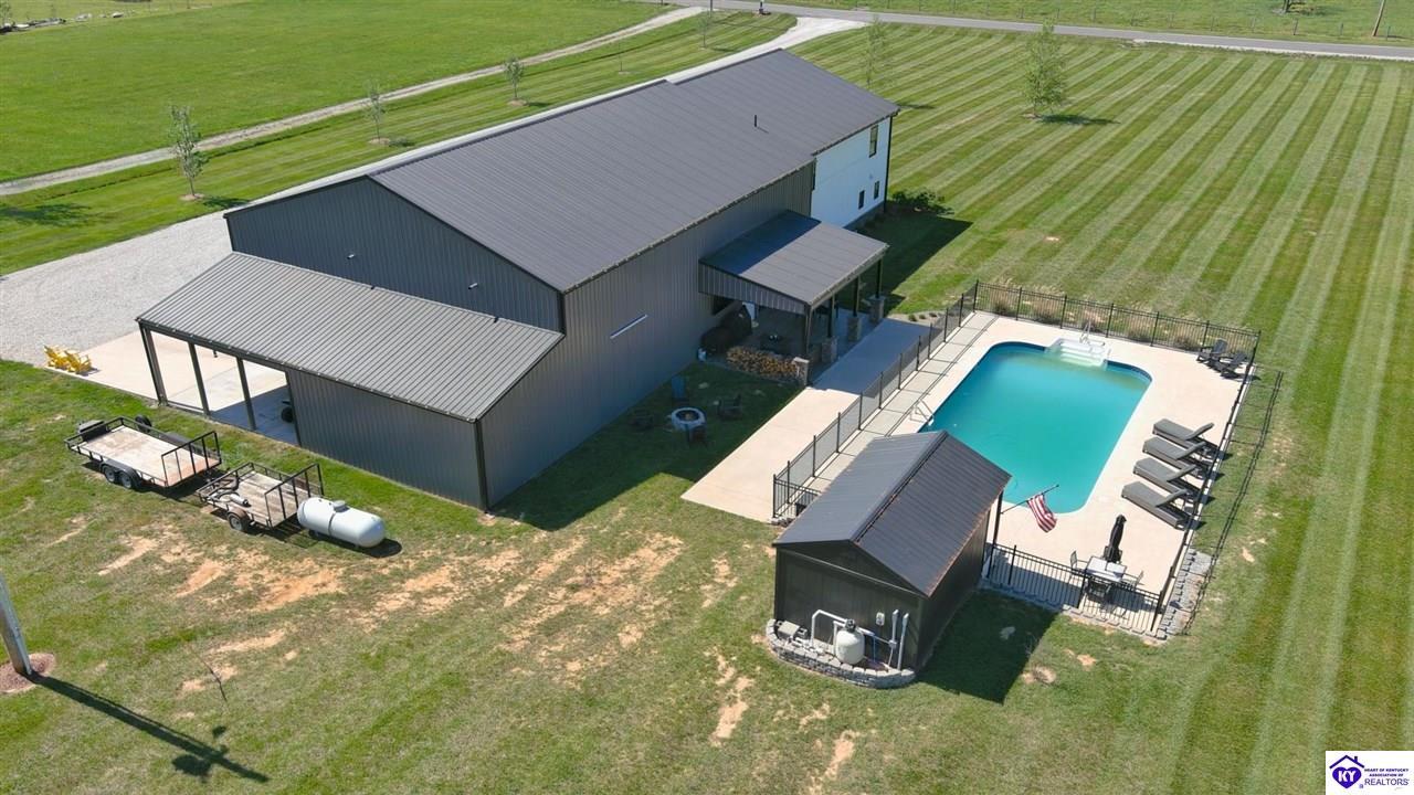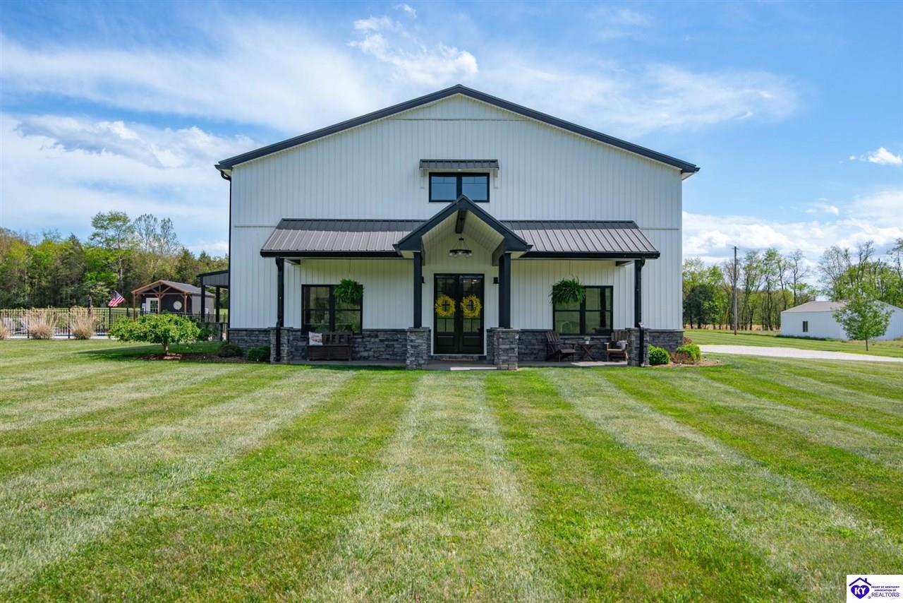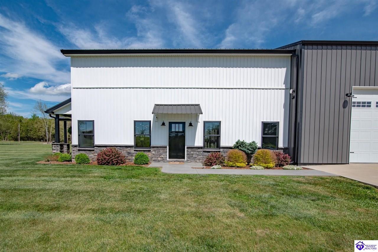 Realtor's notes: WELCOME TO 888 MILAN RD., Payneville, KY. This Beautiful custom designed Barndominium-style home features 3 bedrooms and 4 baths,2 kitchens, a 50' x 60' Shop/Garage complete with 2: 12' x 12' Garage Doors, and 1: 16' x 12' Center Door with Commercial & wall mount openers. A 10' x 10' glass Garage door leads out to covered patio & breathtaking pool area . The main kitchen is a standout with quartz countertops, custom cabinetry, large island, pantry, & Gas range/oven, opening to a warm, inviting living space with a Gas Log fireplace. The Primary Suite offers a relaxing retreat with a beautiful en-suite bath and Large walk in closet. A spacious , well-organized Main level Laundry Room adds to this home's everyday functionality & convenience. Upper level features a Lg. Bonus/Family room, 2 bedrooms with walk in closets, and a full bathroom with double vanity. The TRUE highlight of this property is the separate entertainment living area, complete with a 2nd kitchen & 4th Bathroom, offering flexible space for guests, and large gatherings. This area opens directly onto a large covered patio, leading to a stunning custom designed inground pool with expansive concrete decking & pool house-creating a private outdoor oasis. All situated on mostly open, beautifully maintained acreage with added privacy, this property offers the perfect combination of country living, modern amenities, & exceptional entertaining space. Schedule your Showing today.