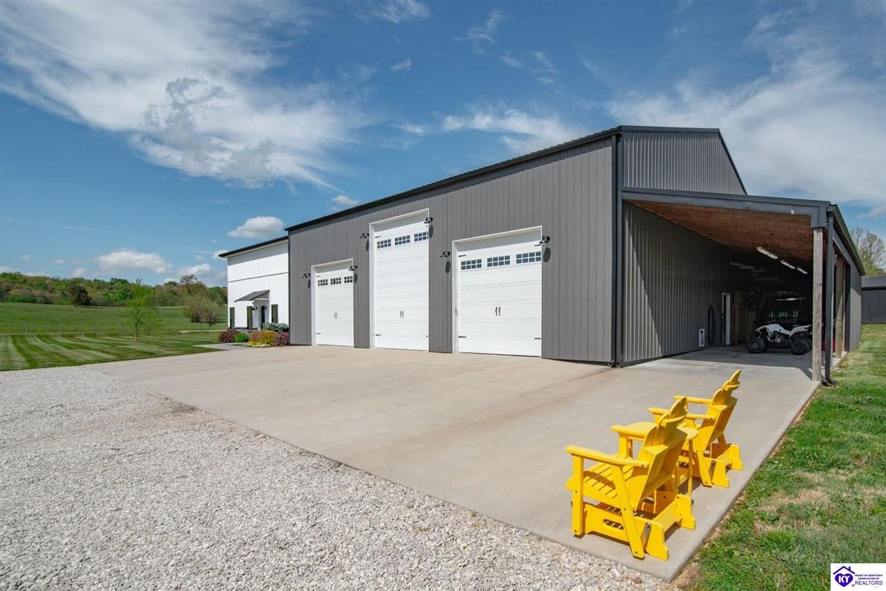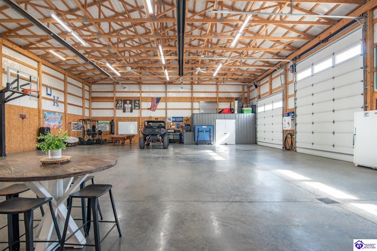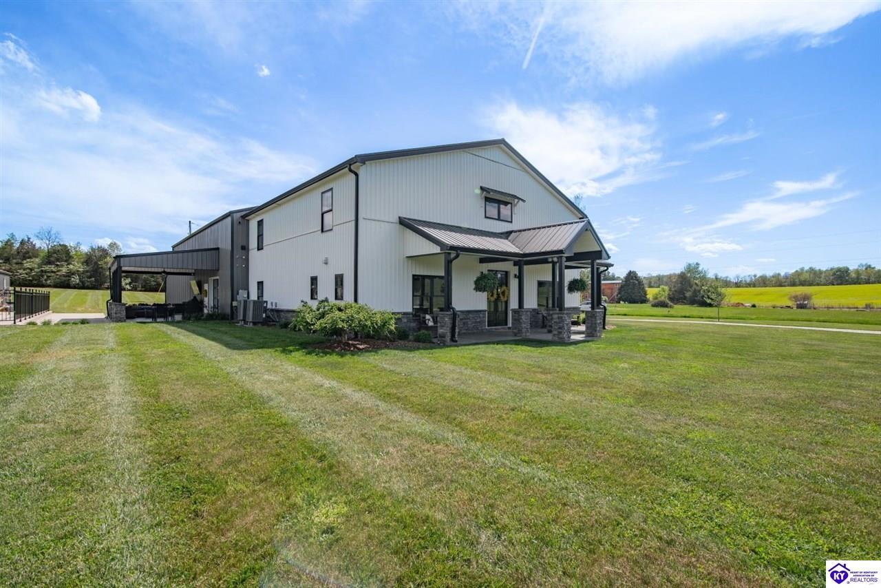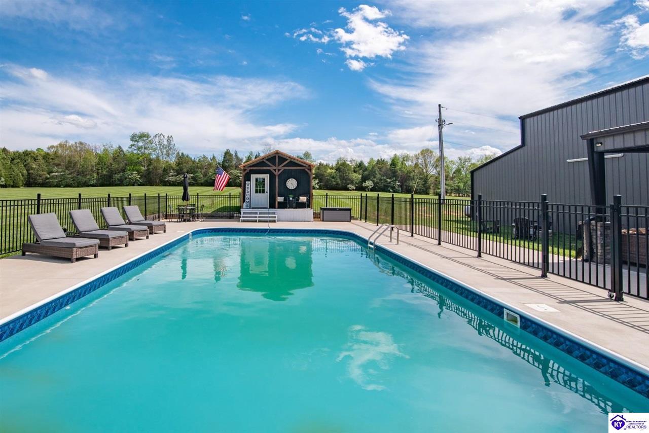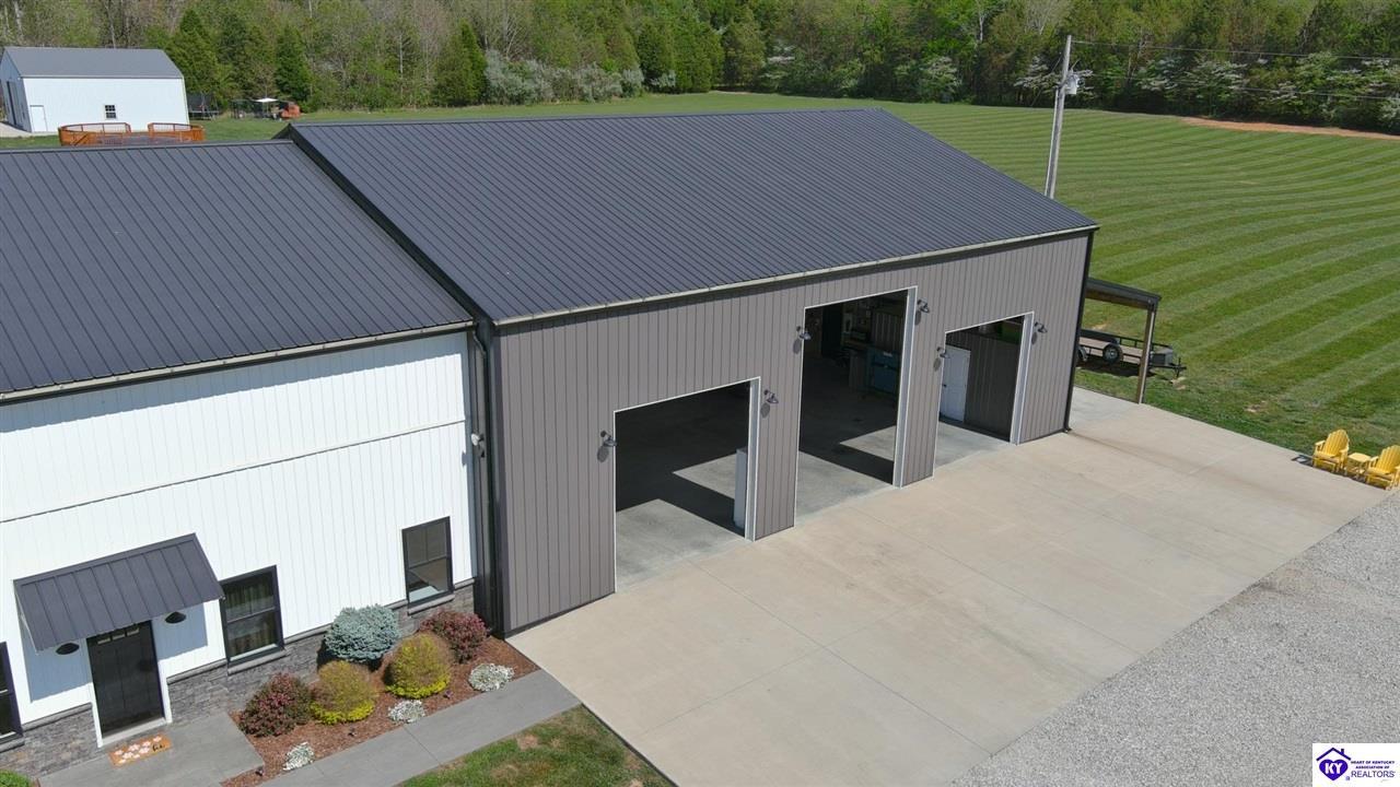 Realtor's notes: WELCOME TO 888 MILAN RD., Payneville, KY. This Beautiful custom designed Barndominium-style home features 3 bedrooms and 4 baths,2 kitchens, a 50' x 60' Shop/Garage complete with 2: 12' x 12' Garage Doors, and 1: 16' x 12' Center Door with Commercial & wall mount openers. A 10' x 10' glass Garage door leads out to covered patio & breathtaking pool area . The main kitchen is a standout with quartz countertops, custom cabinetry, large island, pantry, & Gas range/oven, opening to a warm, inviting living space with a Gas Log fireplace. The Primary Suite offers a relaxing retreat with a beautiful en-suite bath and Large walk in closet. A spacious , well-organized Main level Laundry Room adds to this home's everyday functionality & convenience. Upper level features a Lg. Bonus/Family room, 2 bedrooms with walk in closets, and a full bathroom with double vanity. The TRUE highlight of this property is the separate entertainment living area, complete with a 2nd kitchen & 4th Bathroom, offering flexible space for guests, and large gatherings. This area opens directly onto a large covered patio, leading to a stunning custom designed inground pool with expansive concrete decking & pool house-creating a private outdoor oasis. All situated on mostly open, beautifully maintained acreage with added privacy, this property offers the perfect combination of country living, modern amenities, & exceptional entertaining space. Schedule your Showing today.