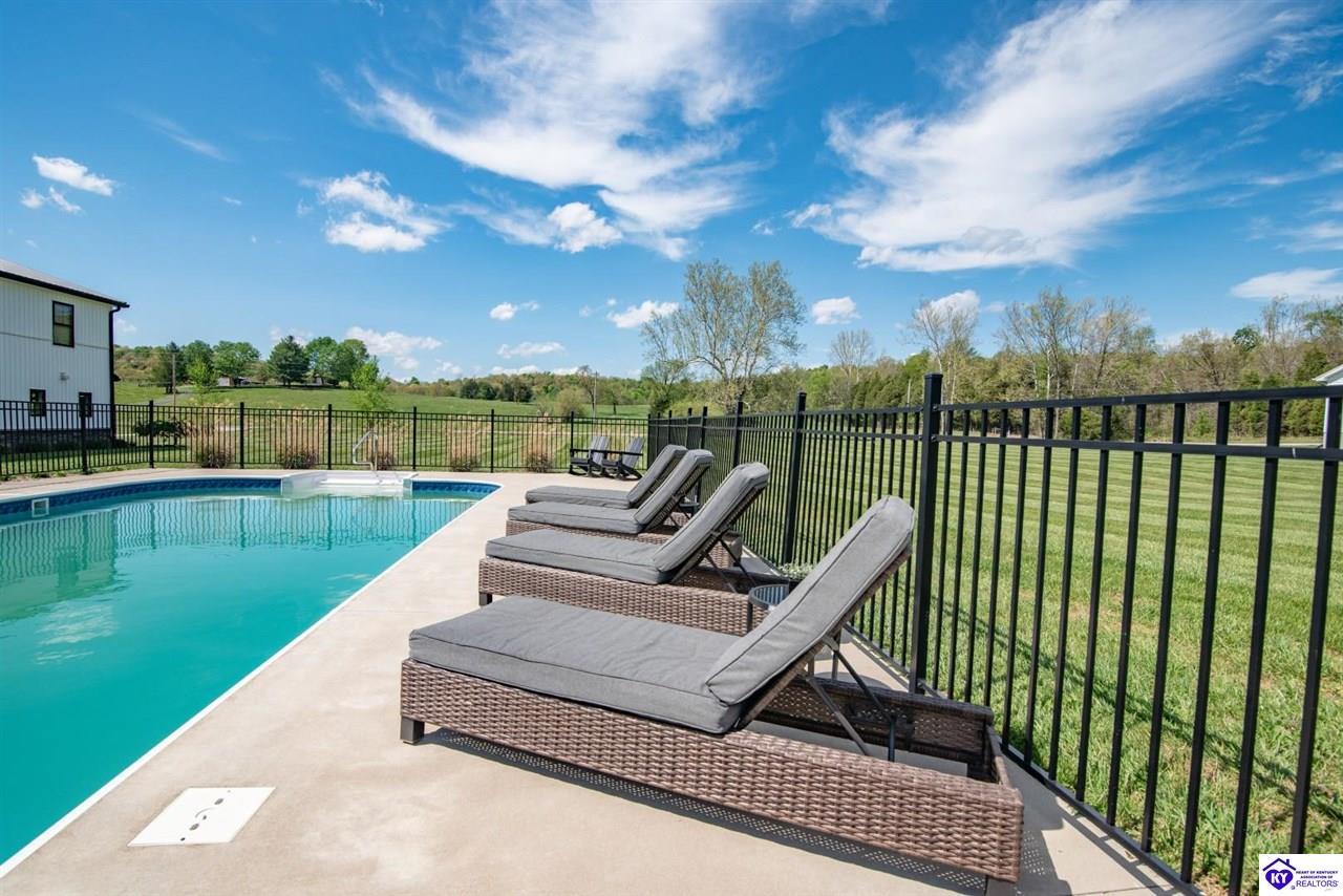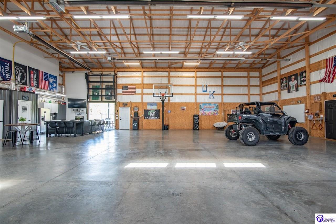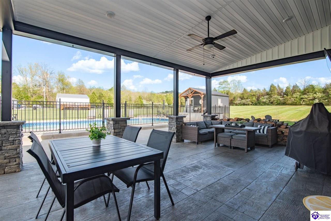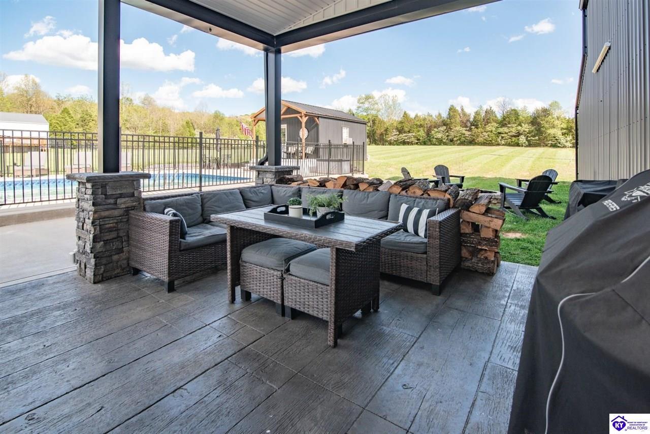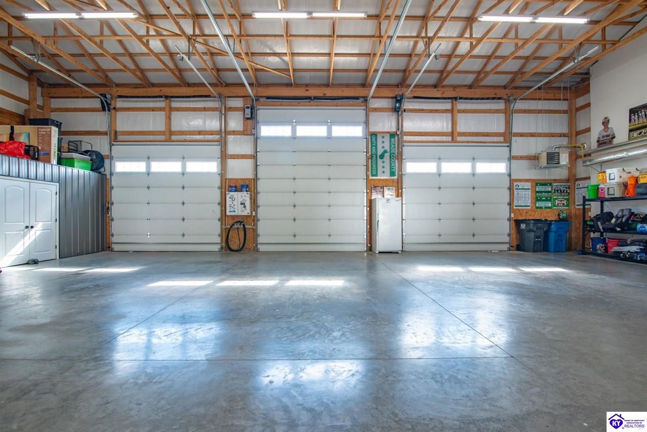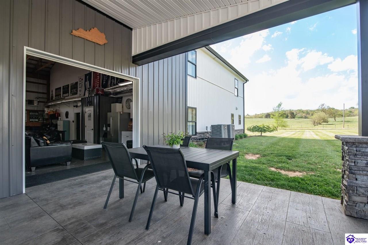 Realtor's notes: WELCOME TO 888 MILAN RD., Payneville, KY. This Beautiful custom designed Barndominium-style home features 3 bedrooms and 4 baths,2 kitchens, a 50' x 60' Shop/Garage complete with 2: 12' x 12' Garage Doors, and 1: 16' x 12' Center Door with Commercial & wall mount openers. A 10' x 10' glass Garage door leads out to covered patio & breathtaking pool area . The main kitchen is a standout with quartz countertops, custom cabinetry, large island, pantry, & Gas range/oven, opening to a warm, inviting living space with a Gas Log fireplace. The Primary Suite offers a relaxing retreat with a beautiful en-suite bath and Large walk in closet. A spacious , well-organized Main level Laundry Room adds to this home's everyday functionality & convenience. Upper level features a Lg. Bonus/Family room, 2 bedrooms with walk in closets, and a full bathroom with double vanity. The TRUE highlight of this property is the separate entertainment living area, complete with a 2nd kitchen & 4th Bathroom, offering flexible space for guests, and large gatherings. This area opens directly onto a large covered patio, leading to a stunning custom designed inground pool with expansive concrete decking & pool house-creating a private outdoor oasis. All situated on mostly open, beautifully maintained acreage with added privacy, this property offers the perfect combination of country living, modern amenities, & exceptional entertaining space. Schedule your Showing today.