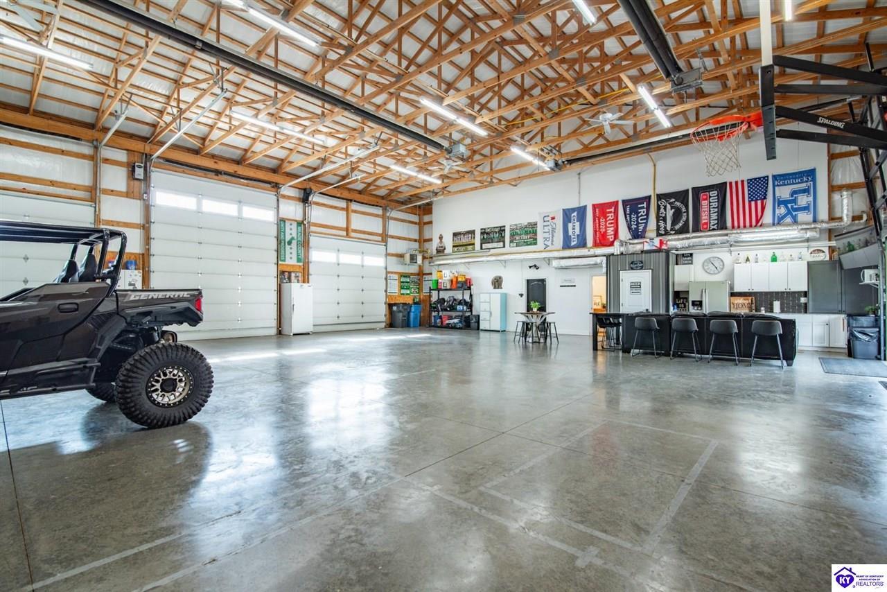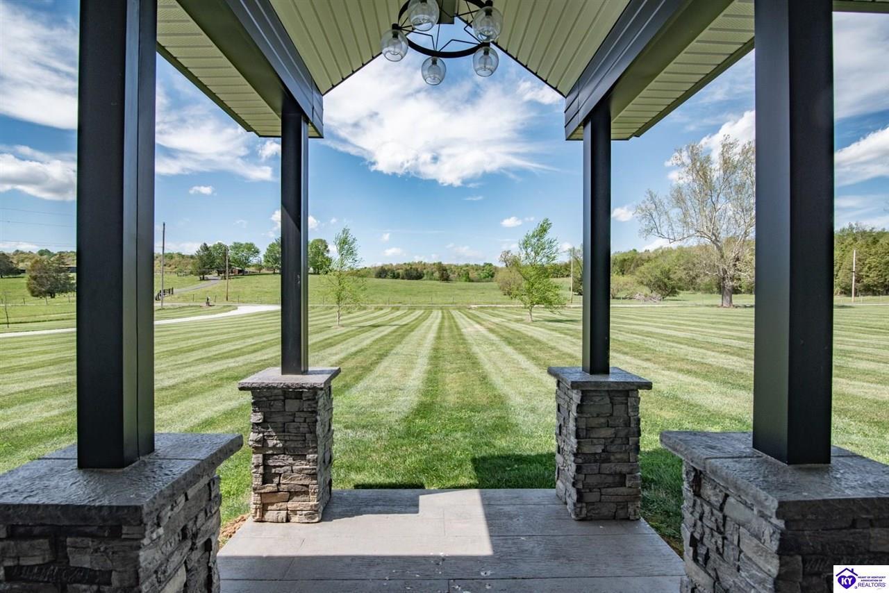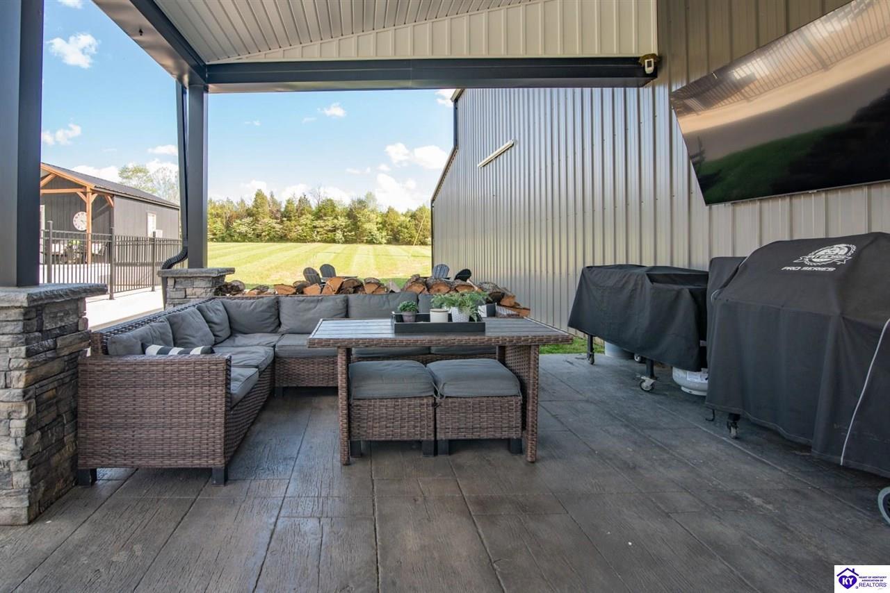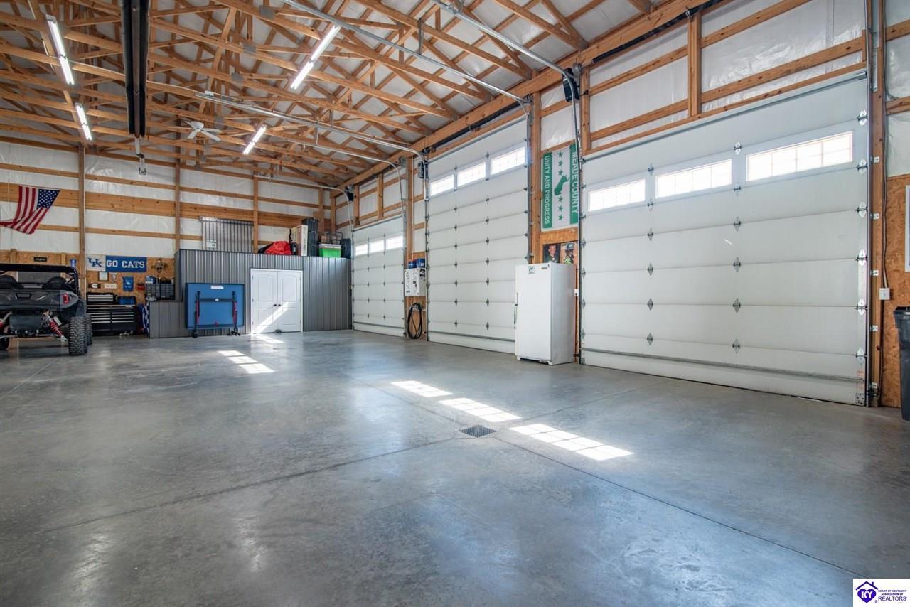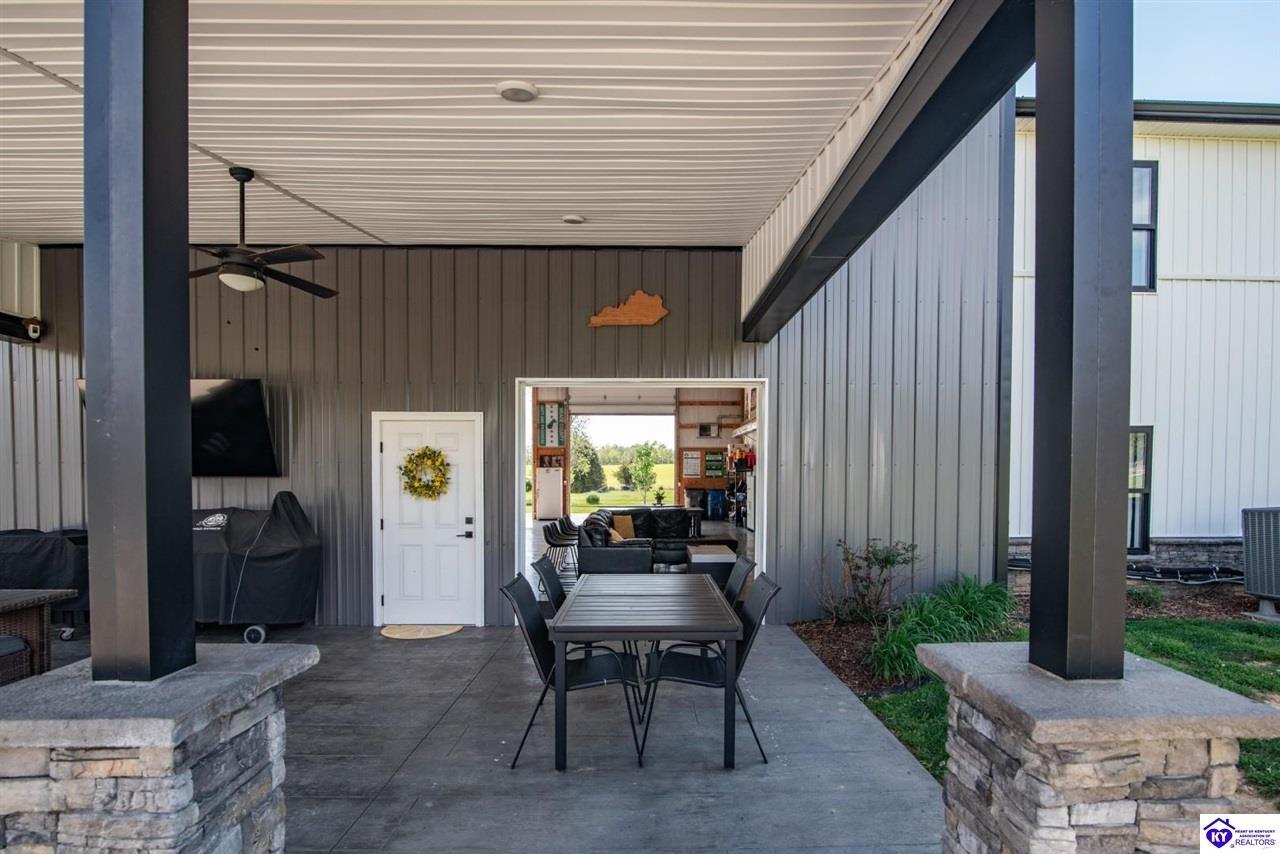Realtor's notes: WELCOME TO 888 MILAN RD., Payneville, KY. This Beautiful custom designed Barndominium-style home features 3 bedrooms and 4 baths,2 kitchens, a 50' x 60' Shop/Garage complete with 2: 12' x 12' Garage Doors, and 1: 16' x 12' Center Door with Commercial & wall mount openers. A 10' x 10' glass Garage door leads out to covered patio & breathtaking pool area . The main kitchen is a standout with quartz countertops, custom cabinetry, large island, pantry, & Gas range/oven, opening to a warm, inviting living space with a Gas Log fireplace. The Primary Suite offers a relaxing retreat with a beautiful en-suite bath and Large walk in closet. A spacious , well-organized Main level Laundry Room adds to this home's everyday functionality & convenience. Upper level features a Lg. Bonus/Family room, 2 bedrooms with walk in closets, and a full bathroom with double vanity. The TRUE highlight of this property is the separate entertainment living area, complete with a 2nd kitchen & 4th Bathroom, offering flexible space for guests, and large gatherings. This area opens directly onto a large covered patio, leading to a stunning custom designed inground pool with expansive concrete decking & pool house-creating a private outdoor oasis. All situated on mostly open, beautifully maintained acreage with added privacy, this property offers the perfect combination of country living, modern amenities, & exceptional entertaining space. Schedule your Showing today.