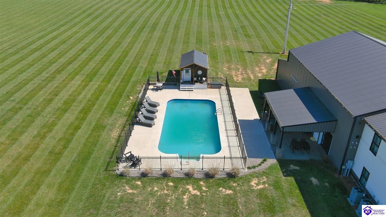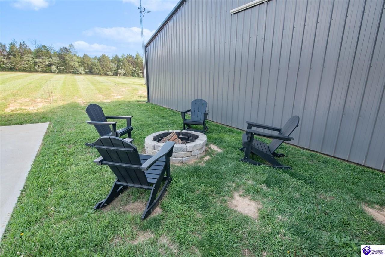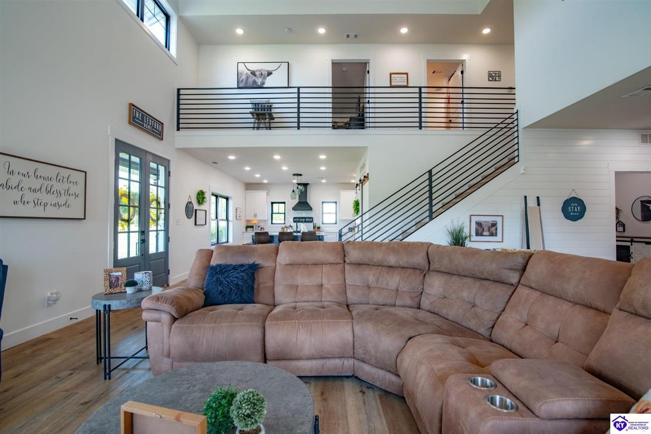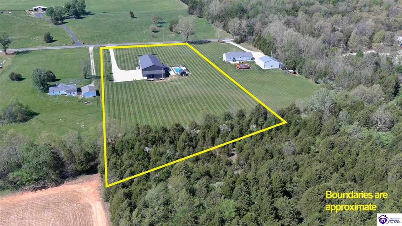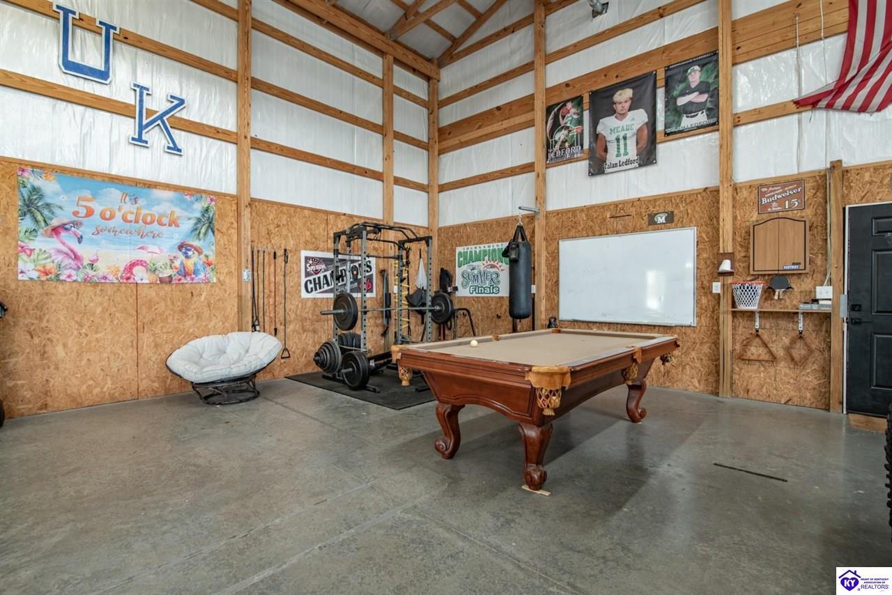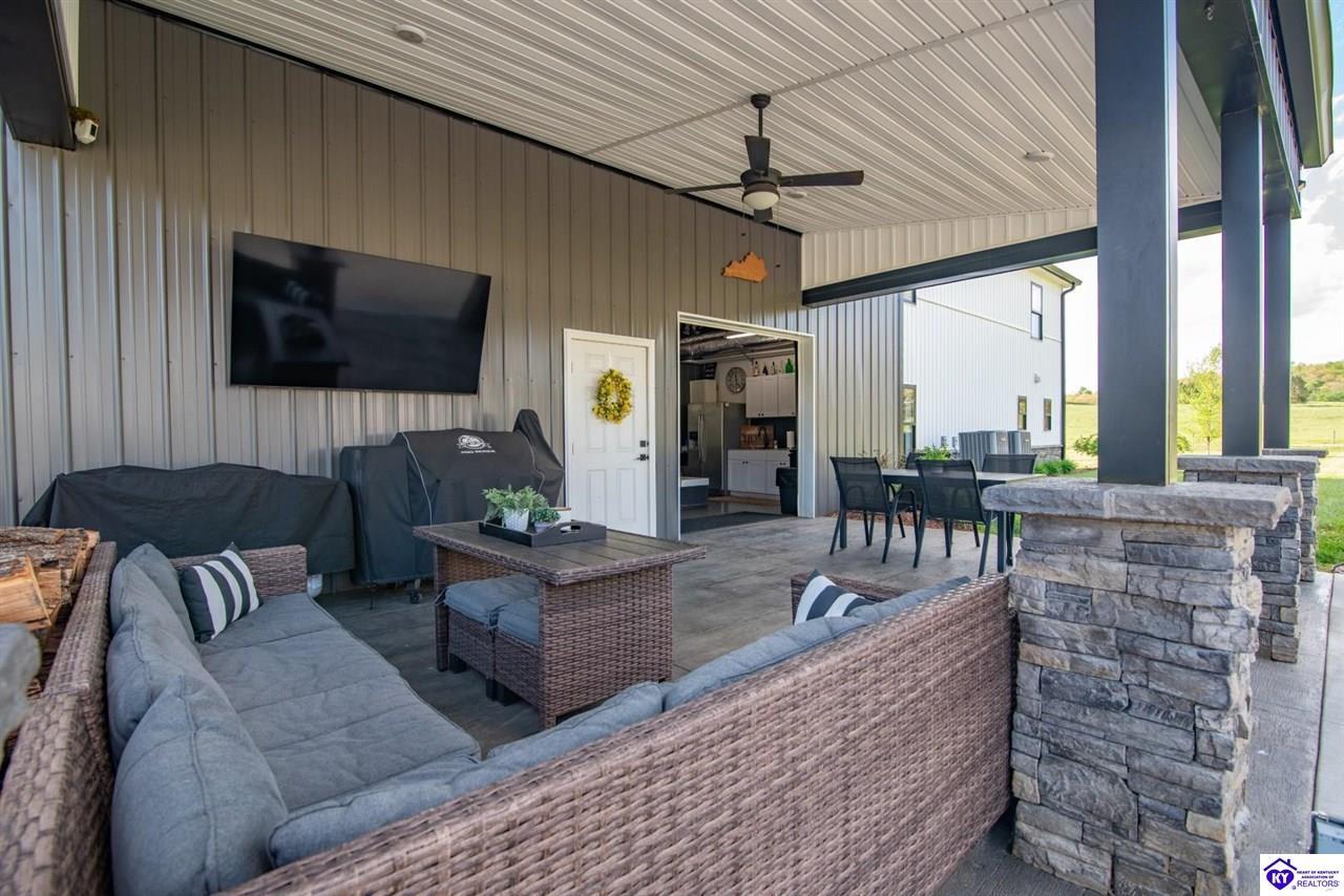 Realtor's notes: WELCOME TO 888 MILAN RD., Payneville, KY. This Beautiful custom designed Barndominium-style home features 3 bedrooms and 4 baths,2 kitchens, a 50' x 60' Shop/Garage complete with 2: 12' x 12' Garage Doors, and 1: 16' x 12' Center Door with Commercial & wall mount openers. A 10' x 10' glass Garage door leads out to covered patio & breathtaking pool area . The main kitchen is a standout with quartz countertops, custom cabinetry, large island, pantry, & Gas range/oven, opening to a warm, inviting living space with a Gas Log fireplace. The Primary Suite offers a relaxing retreat with a beautiful en-suite bath and Large walk in closet. A spacious , well-organized Main level Laundry Room adds to this home's everyday functionality & convenience. Upper level features a Lg. Bonus/Family room, 2 bedrooms with walk in closets, and a full bathroom with double vanity. The TRUE highlight of this property is the separate entertainment living area, complete with a 2nd kitchen & 4th Bathroom, offering flexible space for guests, and large gatherings. This area opens directly onto a large covered patio, leading to a stunning custom designed inground pool with expansive concrete decking & pool house-creating a private outdoor oasis. All situated on mostly open, beautifully maintained acreage with added privacy, this property offers the perfect combination of country living, modern amenities, & exceptional entertaining space. Schedule your Showing today.