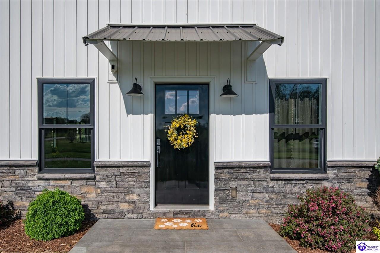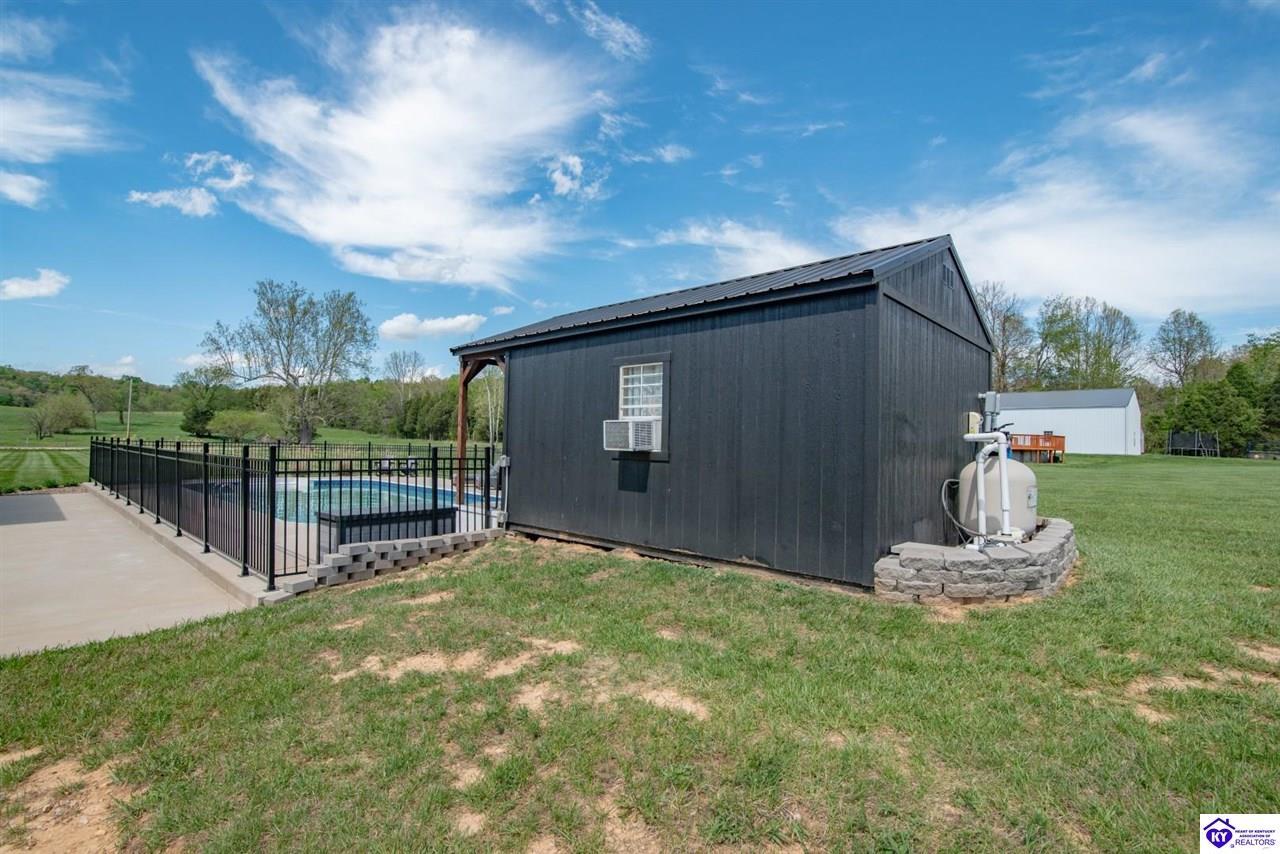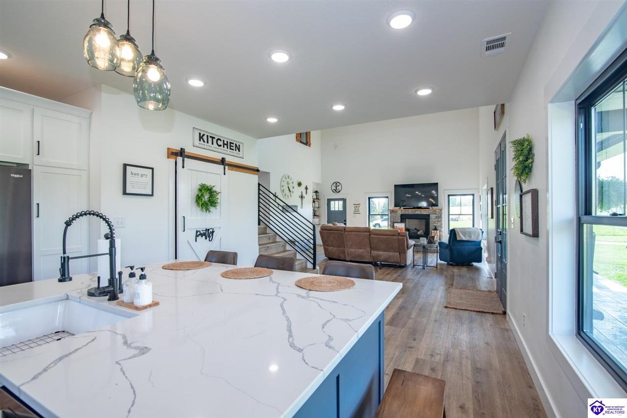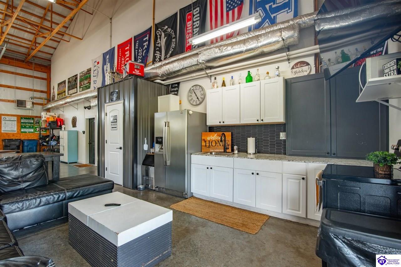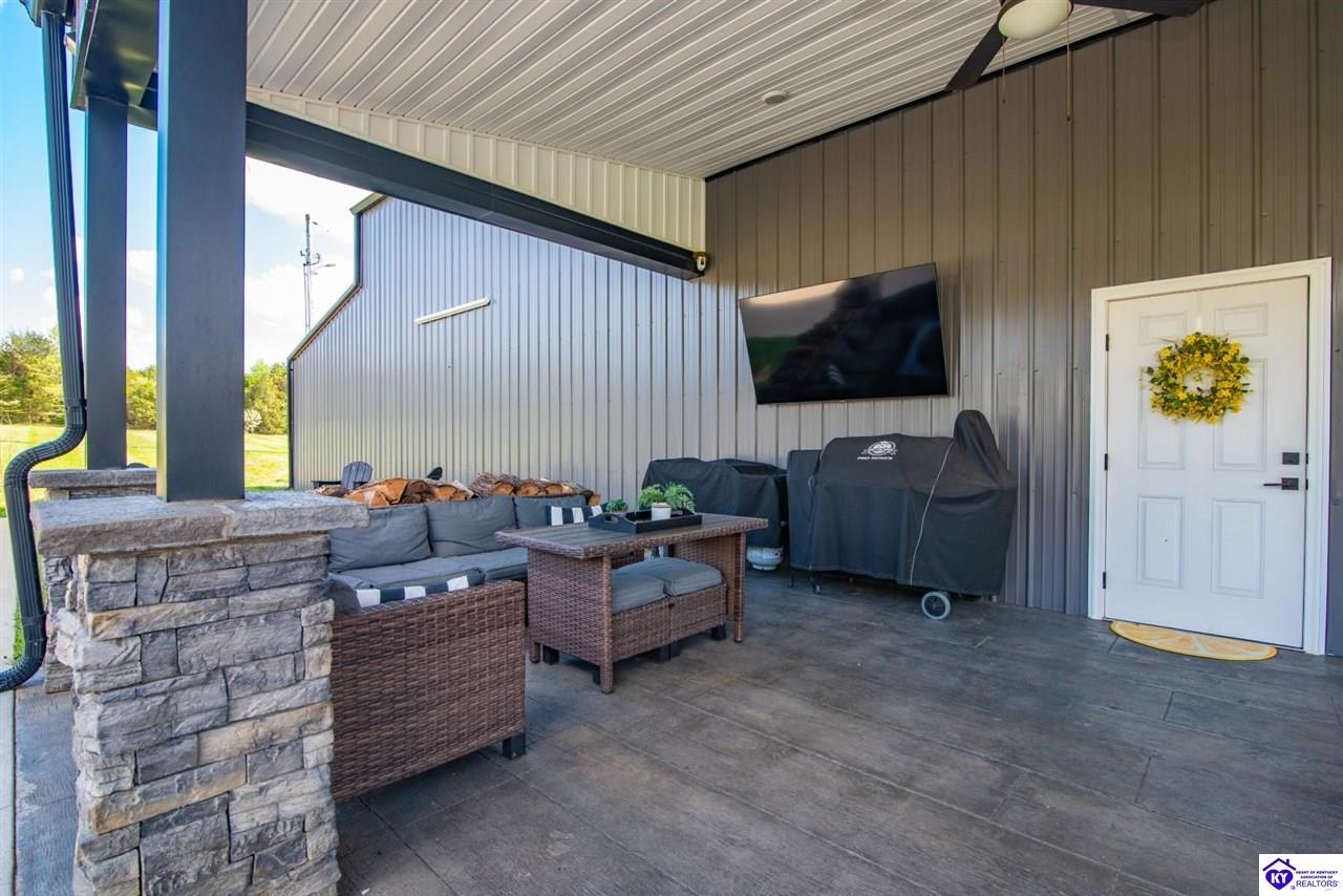 Realtor's notes: WELCOME TO 888 MILAN RD., Payneville, KY. This Beautiful custom designed Barndominium-style home features 3 bedrooms and 4 baths,2 kitchens, a 50' x 60' Shop/Garage complete with 2: 12' x 12' Garage Doors, and 1: 16' x 12' Center Door with Commercial & wall mount openers. A 10' x 10' glass Garage door leads out to covered patio & breathtaking pool area . The main kitchen is a standout with quartz countertops, custom cabinetry, large island, pantry, & Gas range/oven, opening to a warm, inviting living space with a Gas Log fireplace. The Primary Suite offers a relaxing retreat with a beautiful en-suite bath and Large walk in closet. A spacious , well-organized Main level Laundry Room adds to this home's everyday functionality & convenience. Upper level features a Lg. Bonus/Family room, 2 bedrooms with walk in closets, and a full bathroom with double vanity. The TRUE highlight of this property is the separate entertainment living area, complete with a 2nd kitchen & 4th Bathroom, offering flexible space for guests, and large gatherings. This area opens directly onto a large covered patio, leading to a stunning custom designed inground pool with expansive concrete decking & pool house-creating a private outdoor oasis. All situated on mostly open, beautifully maintained acreage with added privacy, this property offers the perfect combination of country living, modern amenities, & exceptional entertaining space. Schedule your Showing today.