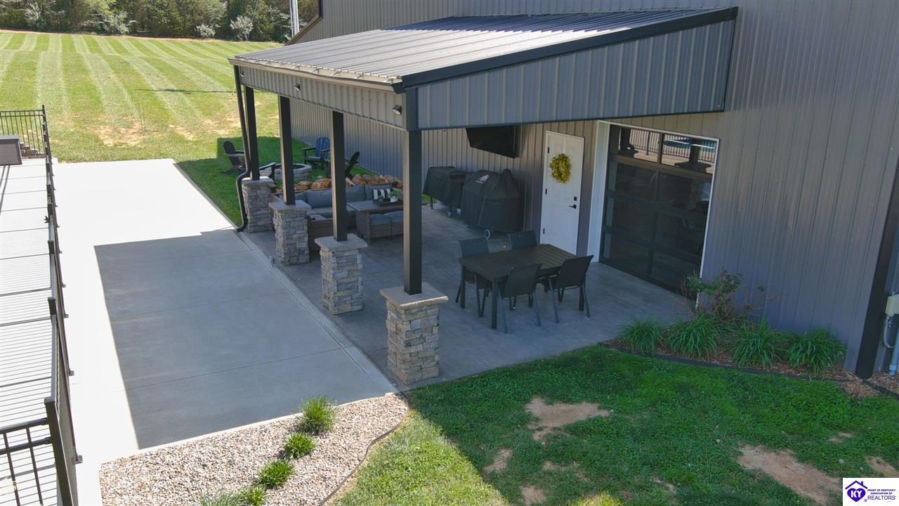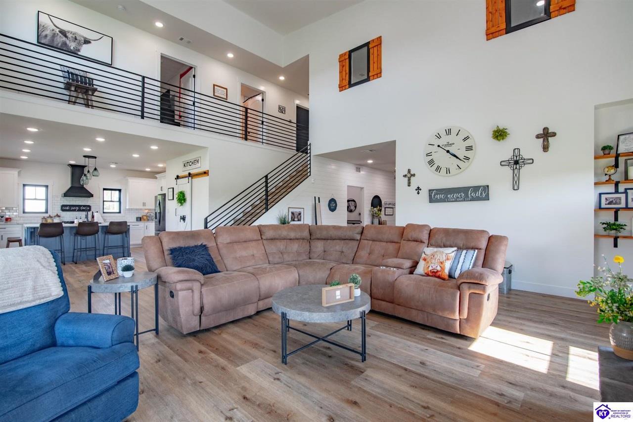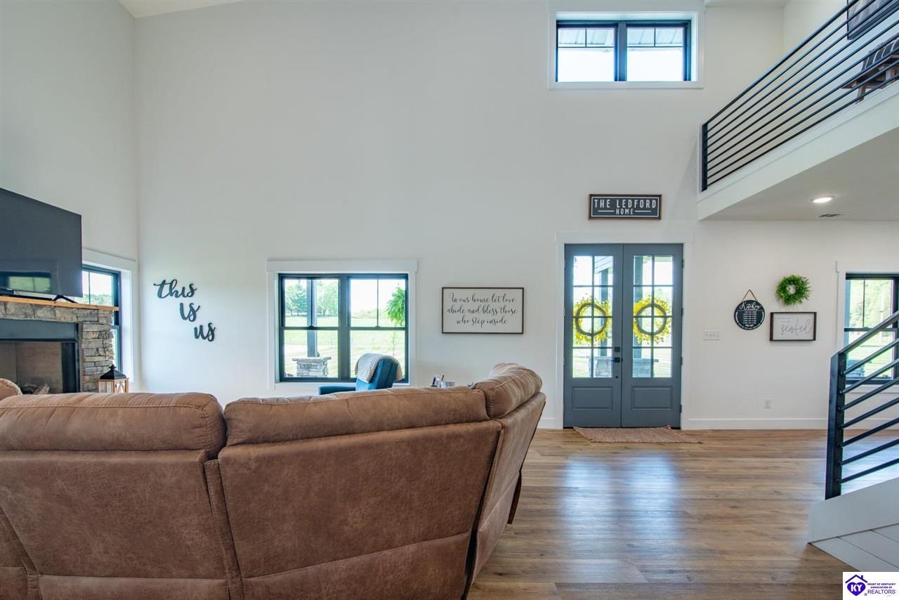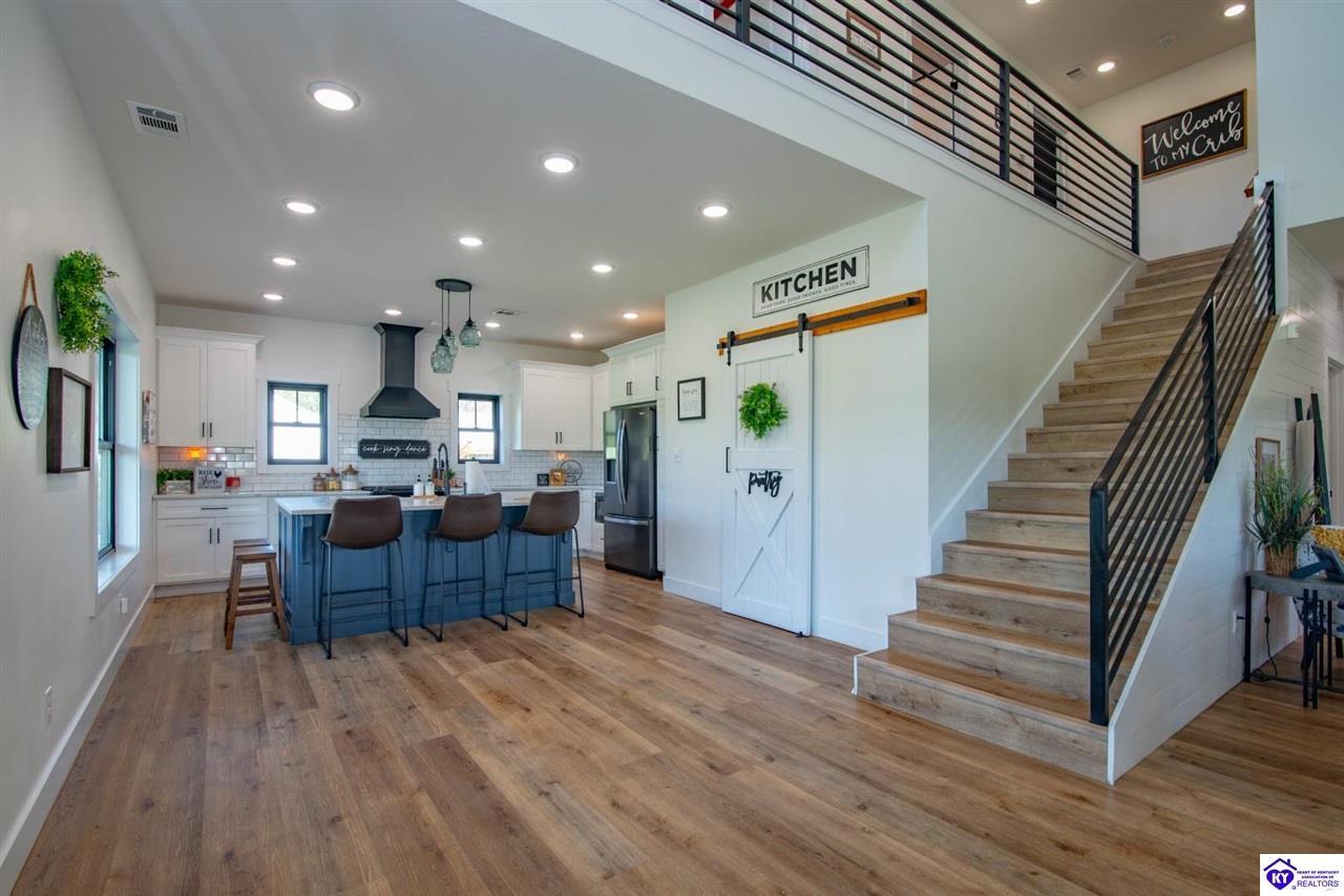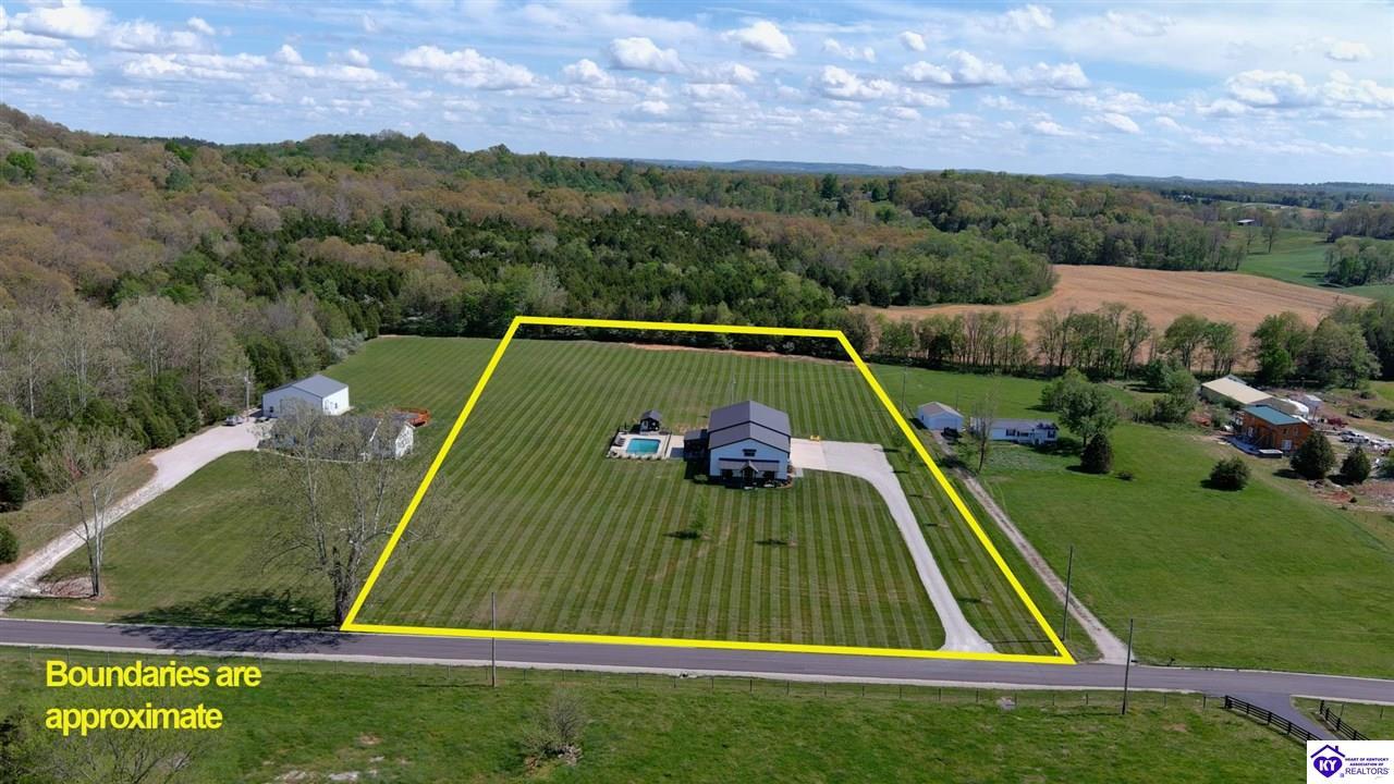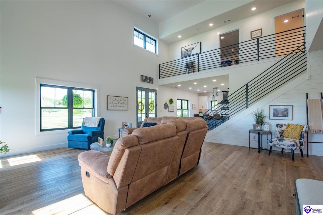 Realtor's notes: WELCOME TO 888 MILAN RD., Payneville, KY. This Beautiful custom designed Barndominium-style home features 3 bedrooms and 4 baths,2 kitchens, a 50' x 60' Shop/Garage complete with 2: 12' x 12' Garage Doors, and 1: 16' x 12' Center Door with Commercial & wall mount openers. A 10' x 10' glass Garage door leads out to covered patio & breathtaking pool area . The main kitchen is a standout with quartz countertops, custom cabinetry, large island, pantry, & Gas range/oven, opening to a warm, inviting living space with a Gas Log fireplace. The Primary Suite offers a relaxing retreat with a beautiful en-suite bath and Large walk in closet. A spacious , well-organized Main level Laundry Room adds to this home's everyday functionality & convenience. Upper level features a Lg. Bonus/Family room, 2 bedrooms with walk in closets, and a full bathroom with double vanity. The TRUE highlight of this property is the separate entertainment living area, complete with a 2nd kitchen & 4th Bathroom, offering flexible space for guests, and large gatherings. This area opens directly onto a large covered patio, leading to a stunning custom designed inground pool with expansive concrete decking & pool house-creating a private outdoor oasis. All situated on mostly open, beautifully maintained acreage with added privacy, this property offers the perfect combination of country living, modern amenities, & exceptional entertaining space. Schedule your Showing today.