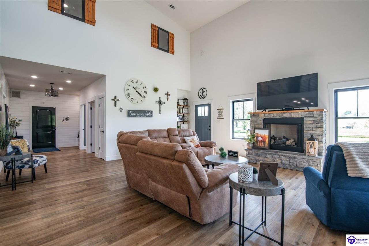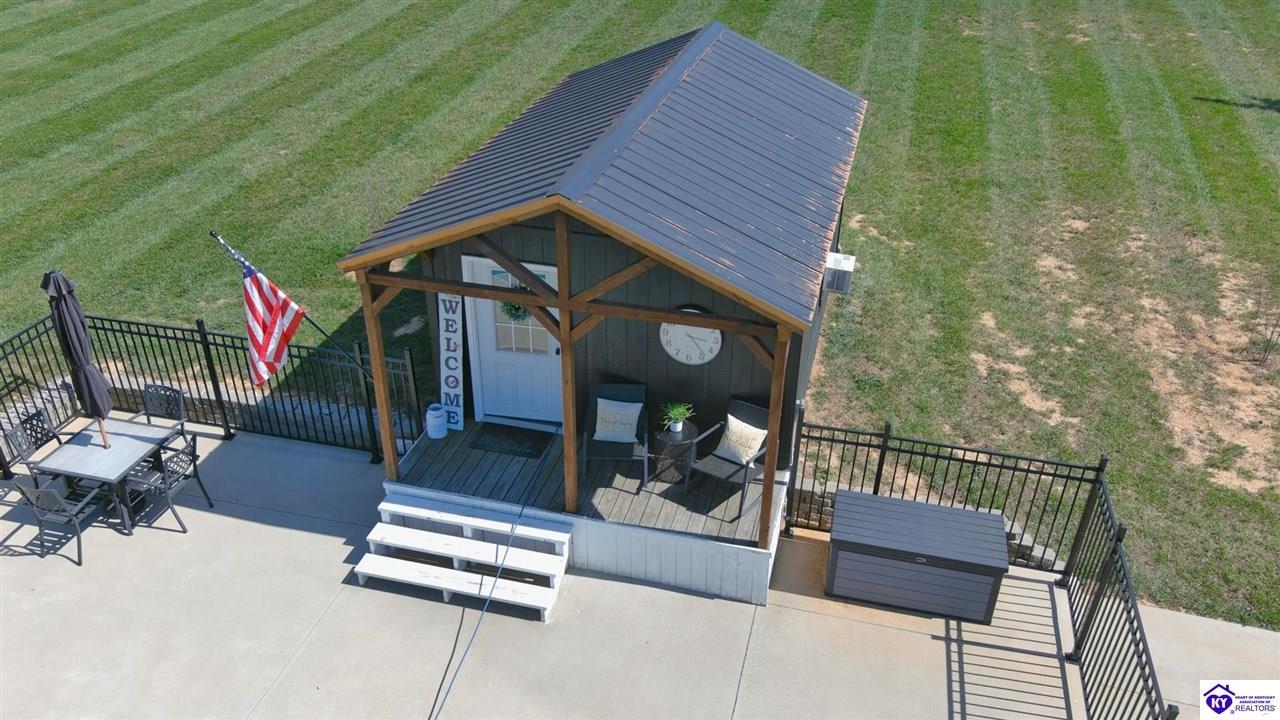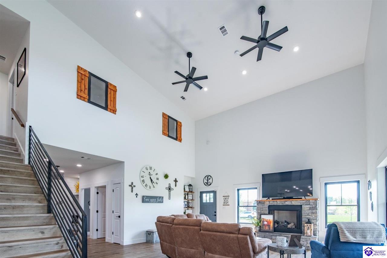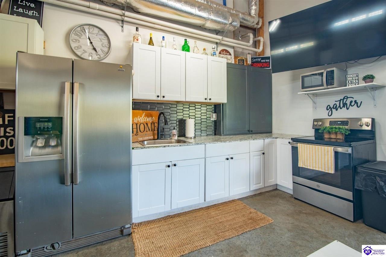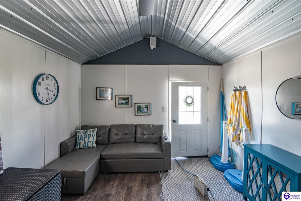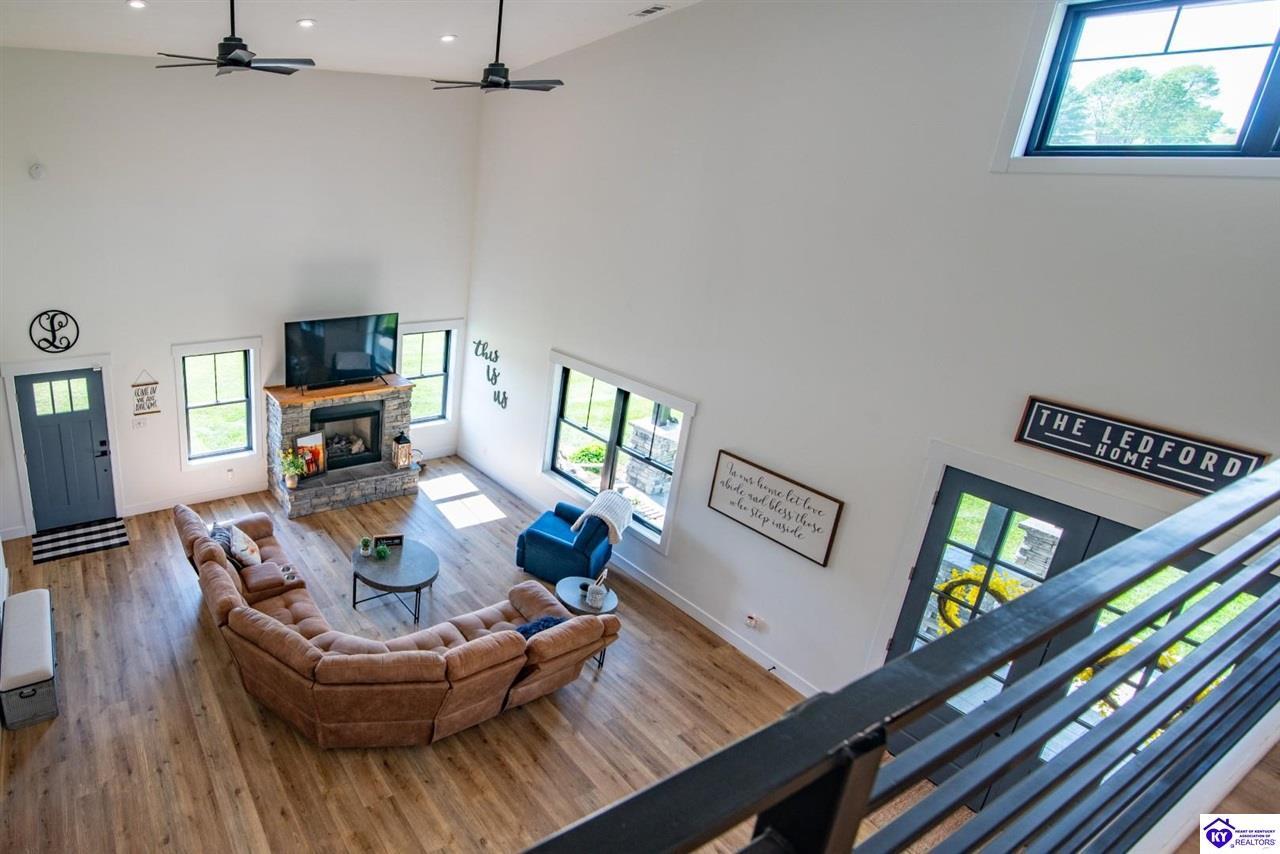 Realtor's notes: WELCOME TO 888 MILAN RD., Payneville, KY. This Beautiful custom designed Barndominium-style home features 3 bedrooms and 4 baths,2 kitchens, a 50' x 60' Shop/Garage complete with 2: 12' x 12' Garage Doors, and 1: 16' x 12' Center Door with Commercial & wall mount openers. A 10' x 10' glass Garage door leads out to covered patio & breathtaking pool area . The main kitchen is a standout with quartz countertops, custom cabinetry, large island, pantry, & Gas range/oven, opening to a warm, inviting living space with a Gas Log fireplace. The Primary Suite offers a relaxing retreat with a beautiful en-suite bath and Large walk in closet. A spacious , well-organized Main level Laundry Room adds to this home's everyday functionality & convenience. Upper level features a Lg. Bonus/Family room, 2 bedrooms with walk in closets, and a full bathroom with double vanity. The TRUE highlight of this property is the separate entertainment living area, complete with a 2nd kitchen & 4th Bathroom, offering flexible space for guests, and large gatherings. This area opens directly onto a large covered patio, leading to a stunning custom designed inground pool with expansive concrete decking & pool house-creating a private outdoor oasis. All situated on mostly open, beautifully maintained acreage with added privacy, this property offers the perfect combination of country living, modern amenities, & exceptional entertaining space. Schedule your Showing today.