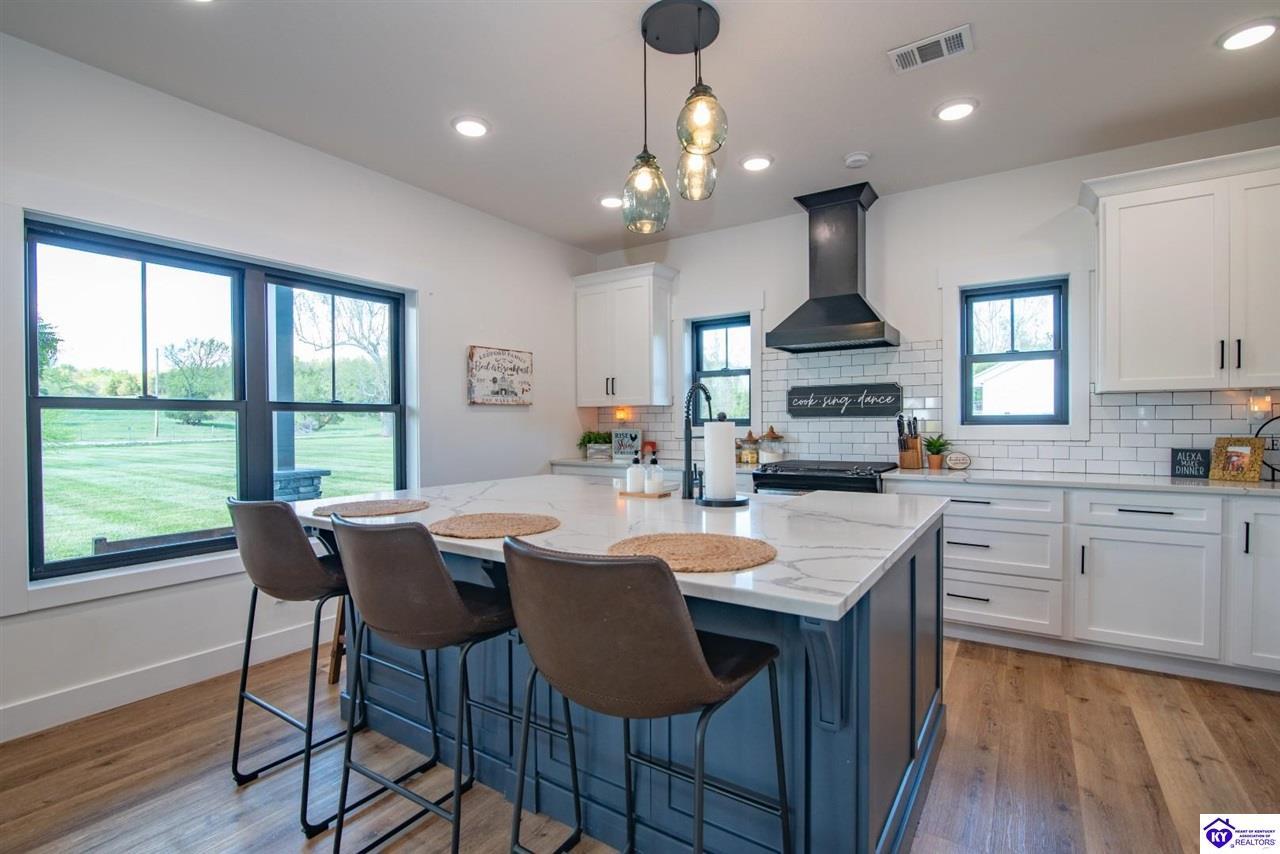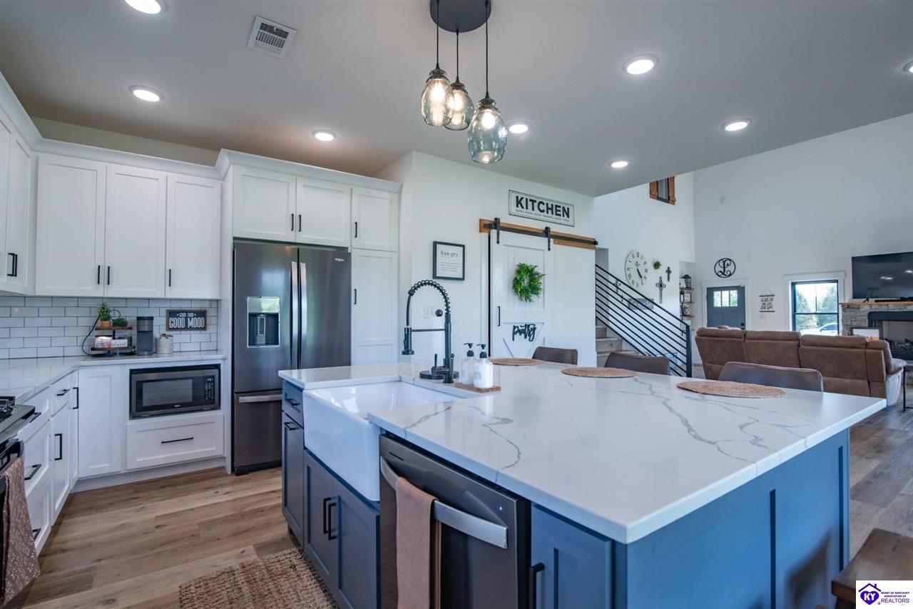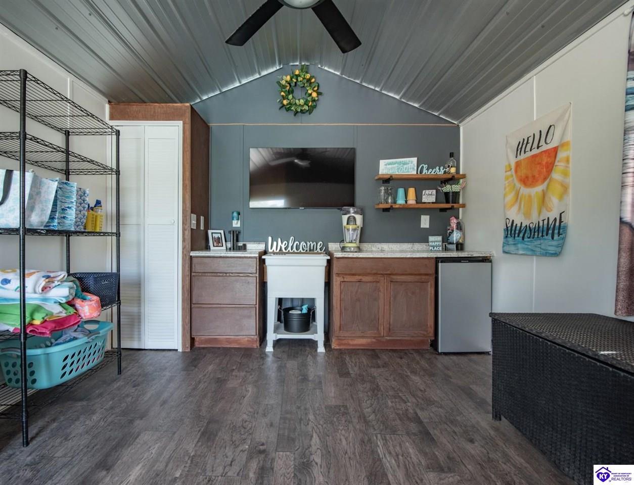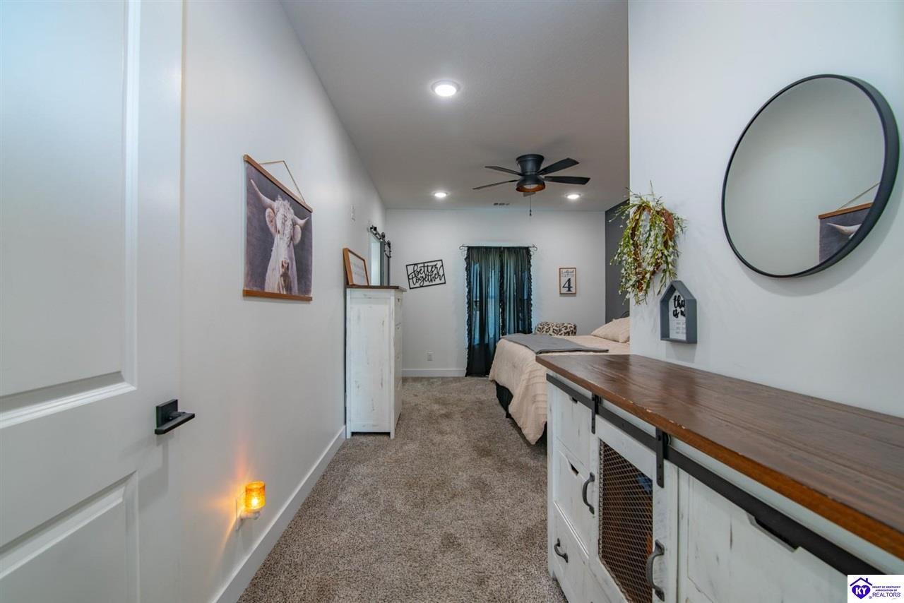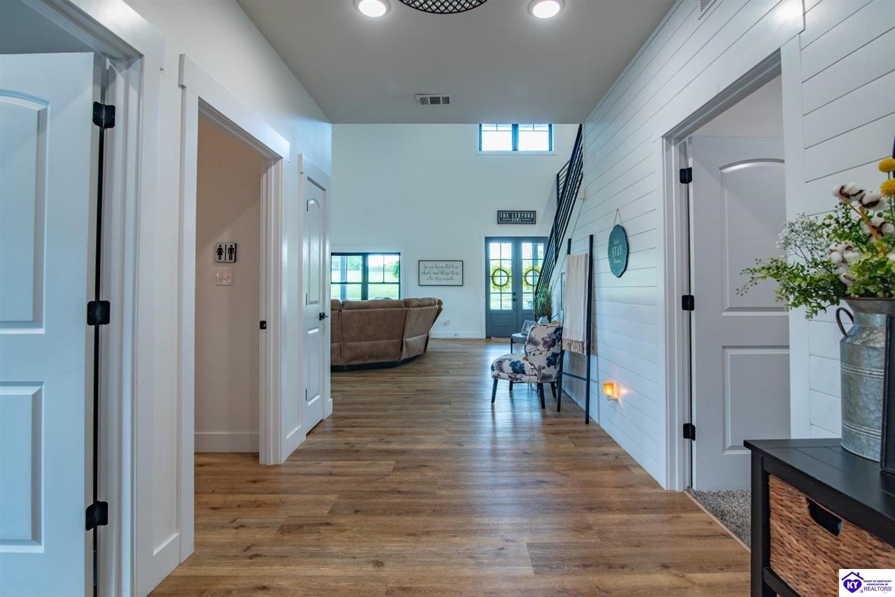Realtor's notes: WELCOME TO 888 MILAN RD., Payneville, KY. This Beautiful custom designed Barndominium-style home features 3 bedrooms and 4 baths,2 kitchens, a 50' x 60' Shop/Garage complete with 2: 12' x 12' Garage Doors, and 1: 16' x 12' Center Door with Commercial & wall mount openers. A 10' x 10' glass Garage door leads out to covered patio & breathtaking pool area . The main kitchen is a standout with quartz countertops, custom cabinetry, large island, pantry, & Gas range/oven, opening to a warm, inviting living space with a Gas Log fireplace. The Primary Suite offers a relaxing retreat with a beautiful en-suite bath and Large walk in closet. A spacious , well-organized Main level Laundry Room adds to this home's everyday functionality & convenience. Upper level features a Lg. Bonus/Family room, 2 bedrooms with walk in closets, and a full bathroom with double vanity. The TRUE highlight of this property is the separate entertainment living area, complete with a 2nd kitchen & 4th Bathroom, offering flexible space for guests, and large gatherings. This area opens directly onto a large covered patio, leading to a stunning custom designed inground pool with expansive concrete decking & pool house-creating a private outdoor oasis. All situated on mostly open, beautifully maintained acreage with added privacy, this property offers the perfect combination of country living, modern amenities, & exceptional entertaining space. Schedule your Showing today.