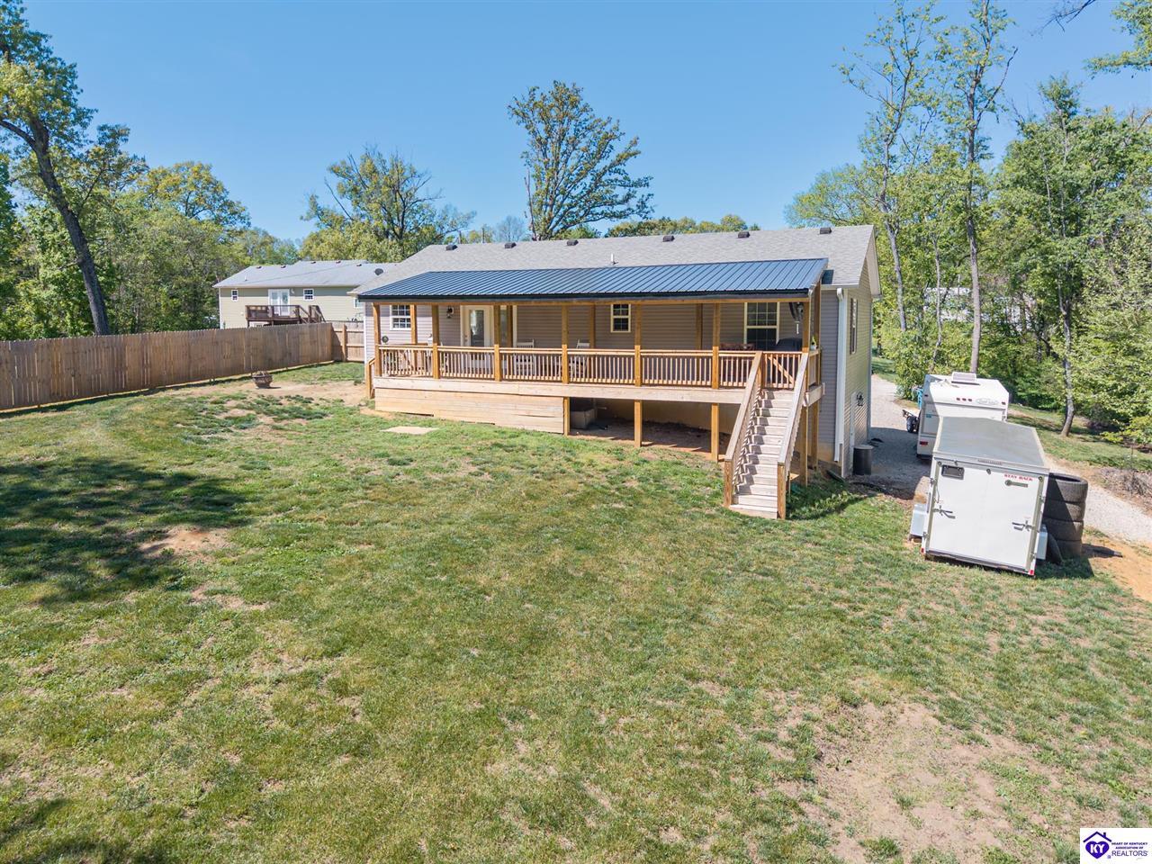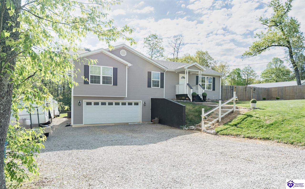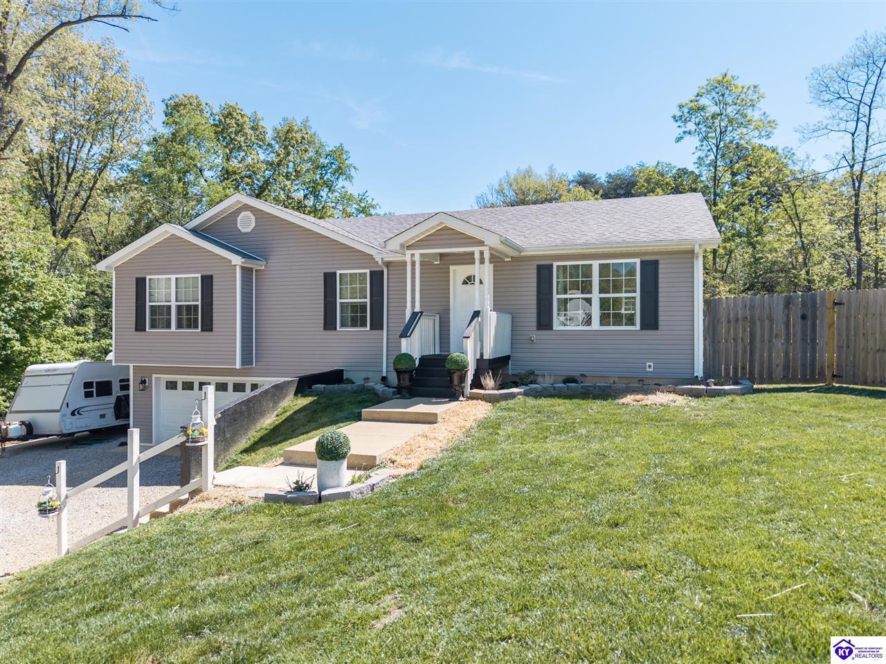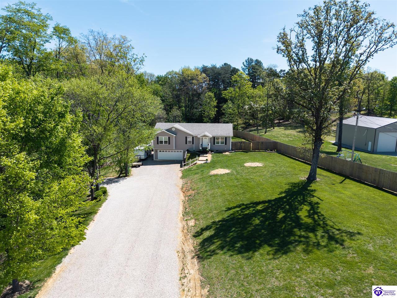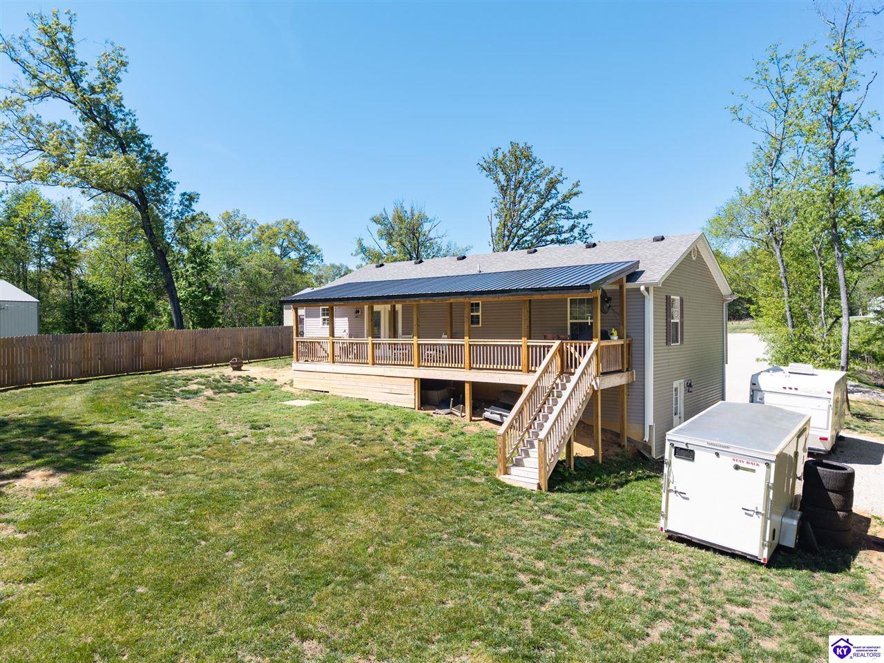 Realtor's notes: If you've been looking for a home with land and extra space, 1122 Garrett Rd delivers. This ranch-style home in Brandenburg, KY features 3 bedrooms, 2 bathrooms, an open concept layout, and a finished basement with 2 additional rooms that could be used as bedrooms, office space, a hobby room, or guest rooms. The primary bedroom includes 2 closets, and the attached 2-car garage adds everyday convenience. Set on 1.62 wooded acres, this property also offers a partially fenced yard with wood privacy fencing, and a covered deck that spans the back of the home. It's perfect for enjoying the rural setting and backyard views. (first image is AI enhanced)