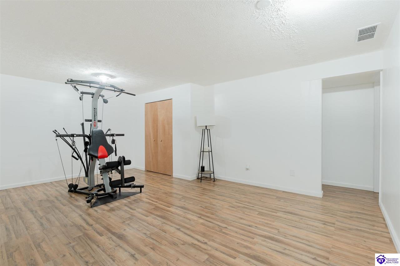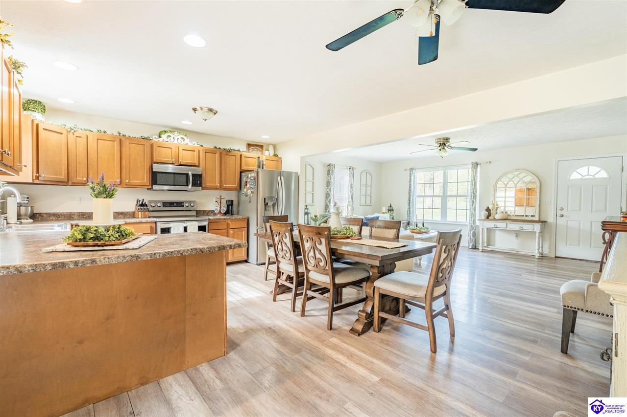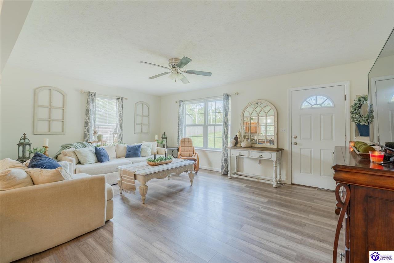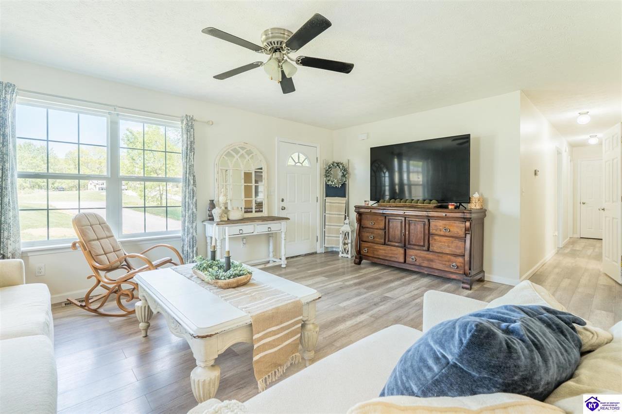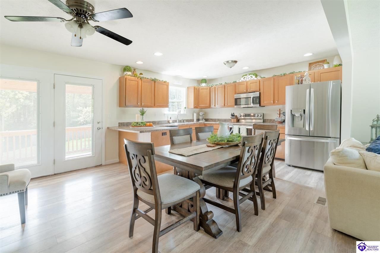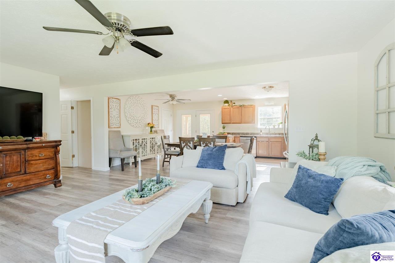 Realtor's notes: If you've been looking for a home with land and extra space, 1122 Garrett Rd delivers. This ranch-style home in Brandenburg, KY features 3 bedrooms, 2 bathrooms, an open concept layout, and a finished basement with 2 additional rooms that could be used as bedrooms, office space, a hobby room, or guest rooms. The primary bedroom includes 2 closets, and the attached 2-car garage adds everyday convenience. Set on 1.62 wooded acres, this property also offers a partially fenced yard with wood privacy fencing, and a covered deck that spans the back of the home. It's perfect for enjoying the rural setting and backyard views. (first image is AI enhanced)