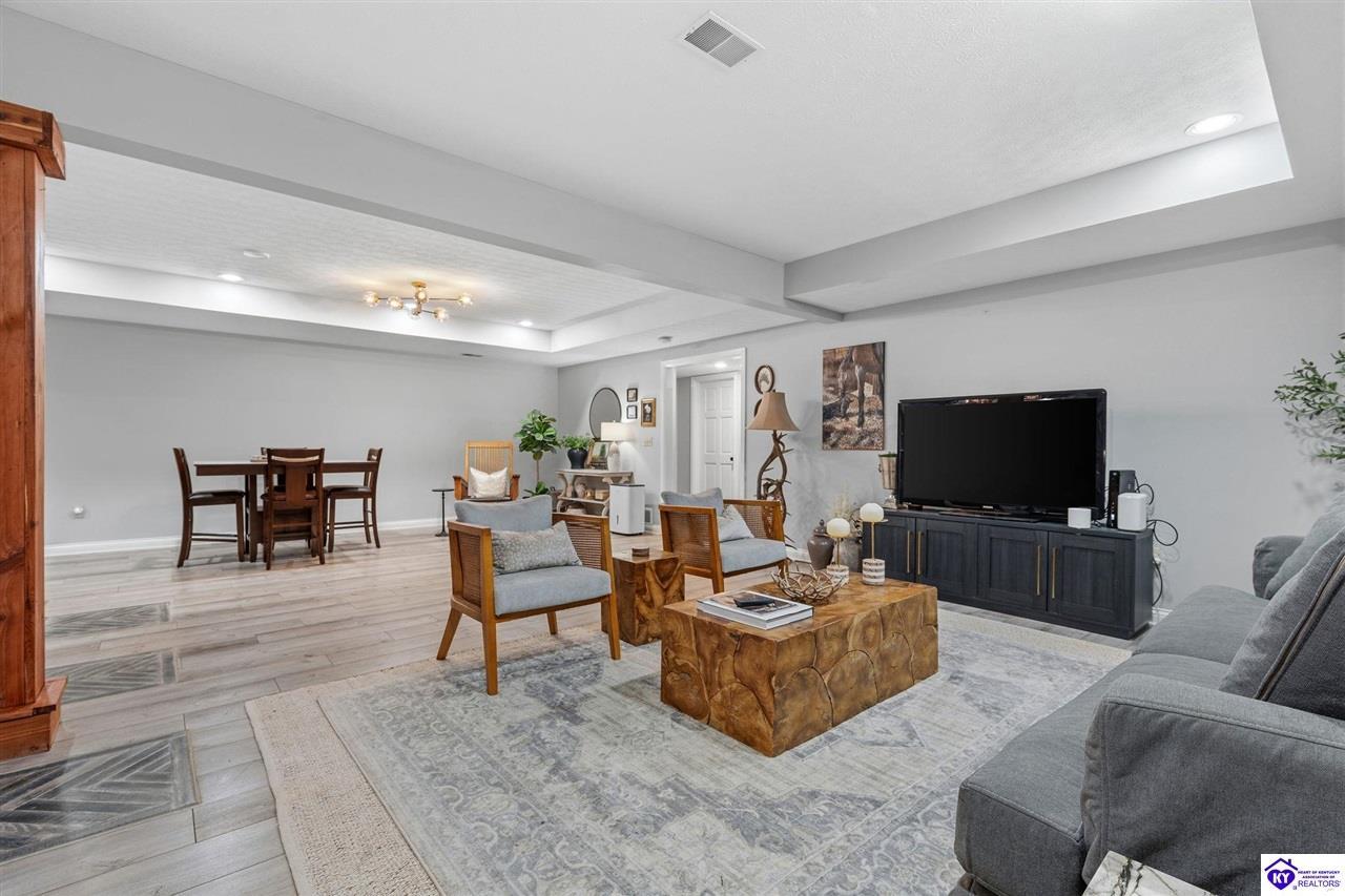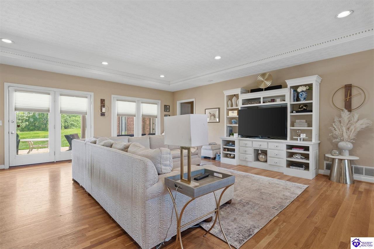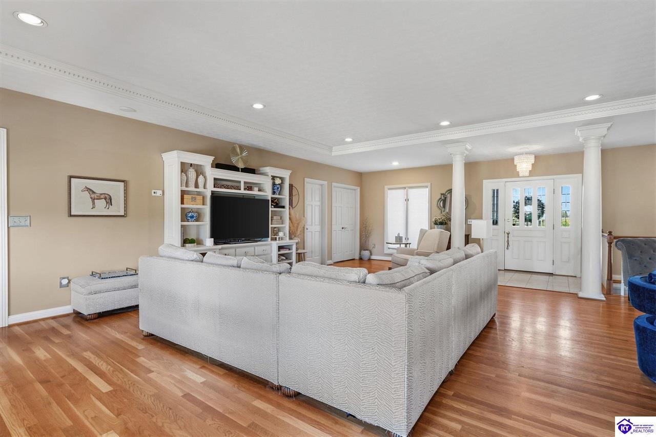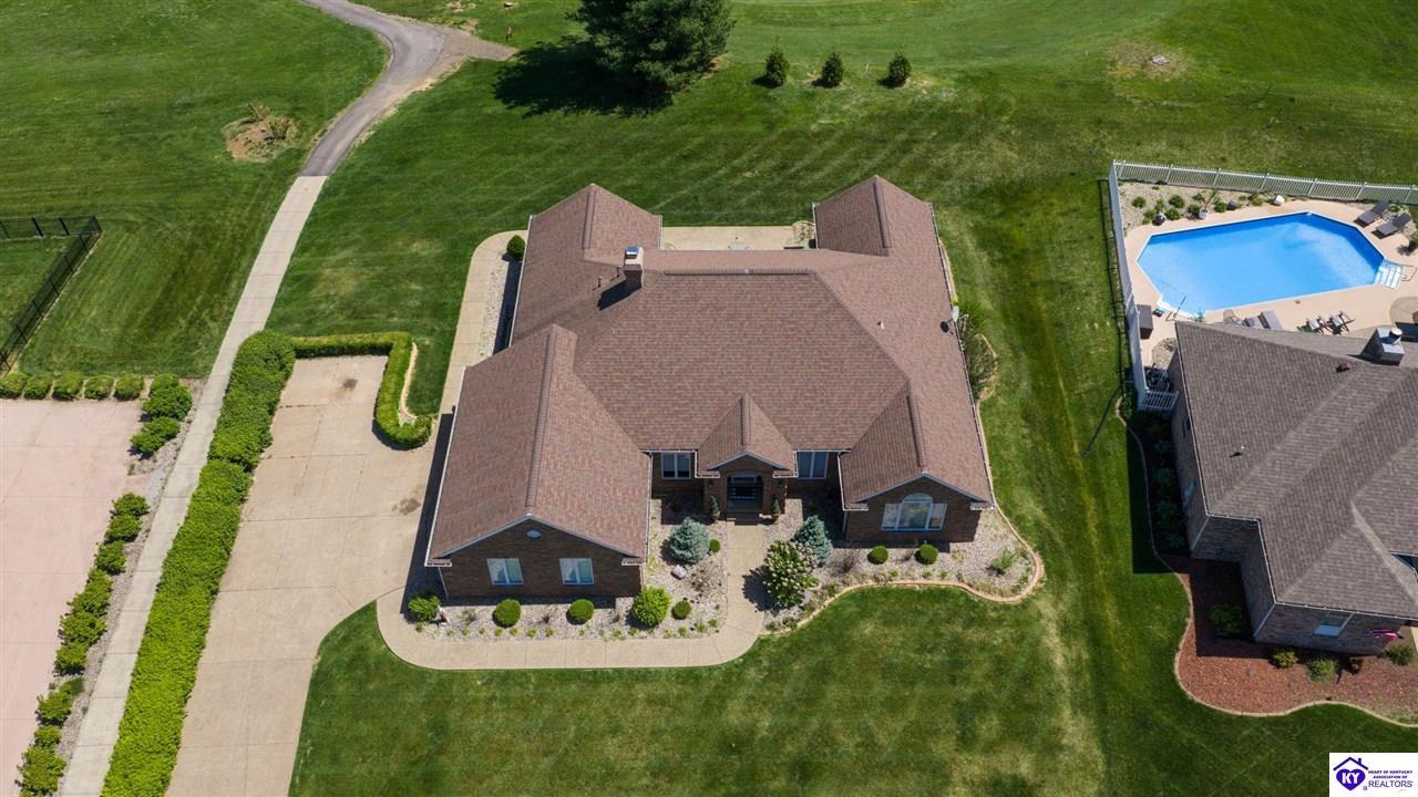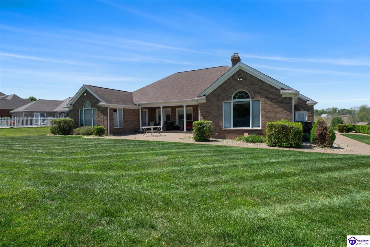 Realtor's notes: Nestled on the picturesque Hole 11 of the Lincoln Trail Golf Course, 557 St. Andrews Drive offers an unparalleled blend of luxury and leisure. Imagine waking each morning to serene golf-course views, stepping out your back door onto lush fairways, and enjoying a peaceful neighborhood that embodies refined living. Inside, the living room captivates with stately columns, rich hardwood floors, and a gas fireplace, while natural light pours in through expansive windows. The gourmet kitchen features custom cabinetry, granite countertops, a walk-in pantry, and a spacious island perfect for entertaining. A convenient mud room/laundry room is located just off the garage. This expansive home boasts three spacious bedrooms, plus two large bonus rooms easily transformed into fourth and fifth bedrooms. The master suite is a serene retreat with a spa-like bath, offering a daily escape. Below, the finished walk-up basement features a chic bar and expansive family entertainment space, full bathroom, with abundant storage throughout. Additional features include a water softener and new hot water heater. Finally, step onto your covered patio and savor the serene golf-course views—this is luxury, comfort, and elegance in one remarkable home.