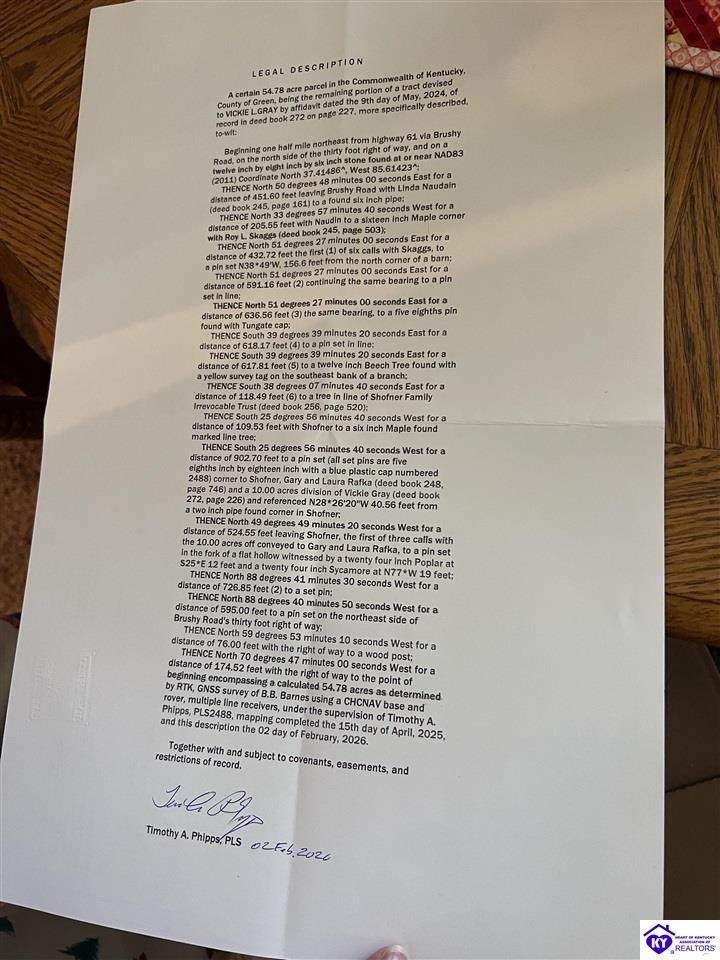 Directions: From Campbellsville, take KY-210 for 8.4 miles. Turn left onto Old Mac Rd (KY-569) for 2.2 miles. Continue on Coakley Rd (KY-569) 3.8 miles. Turn right onto Hodgenville Road (KY-61) for 4.7 miles. Turn right onto Brushy Road.