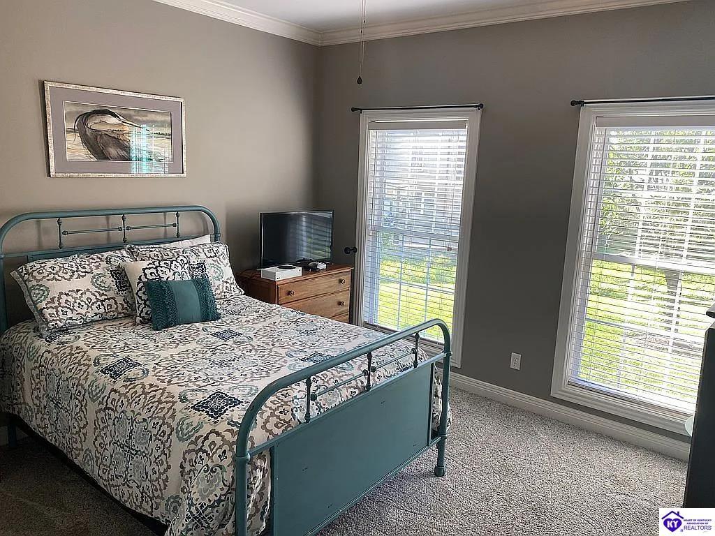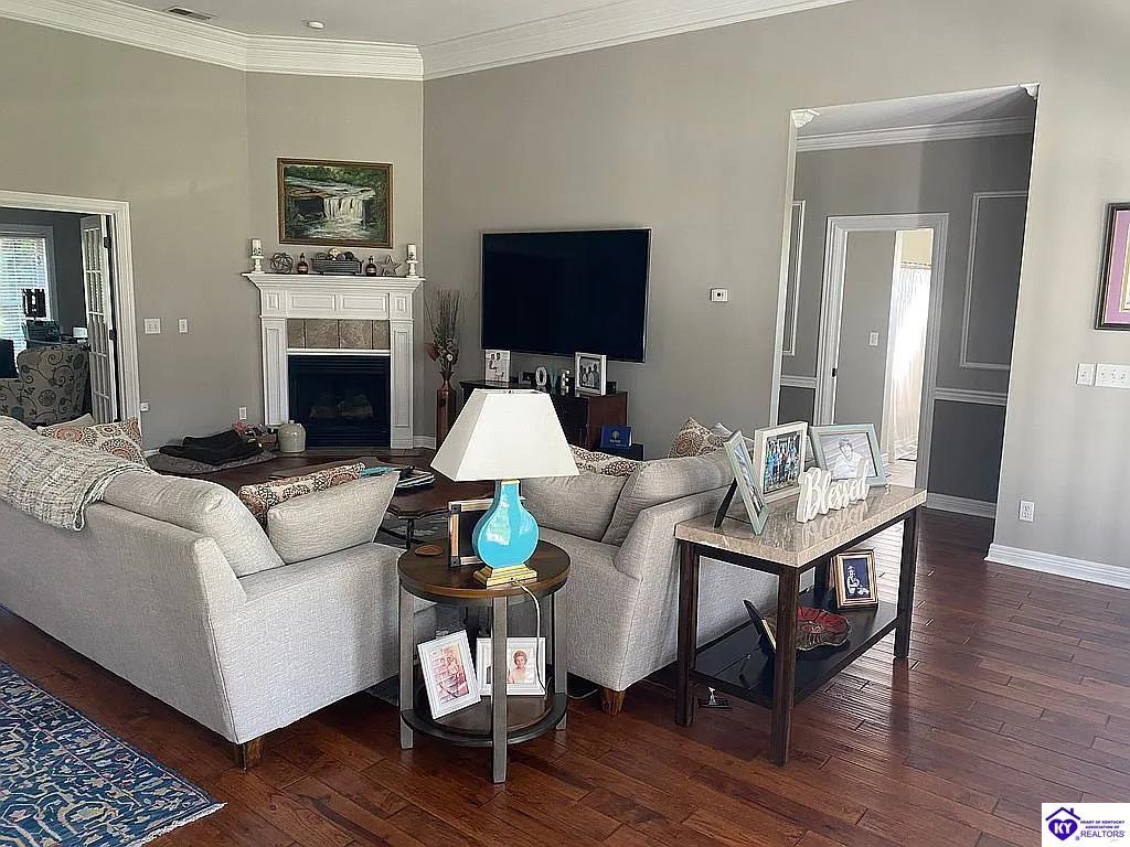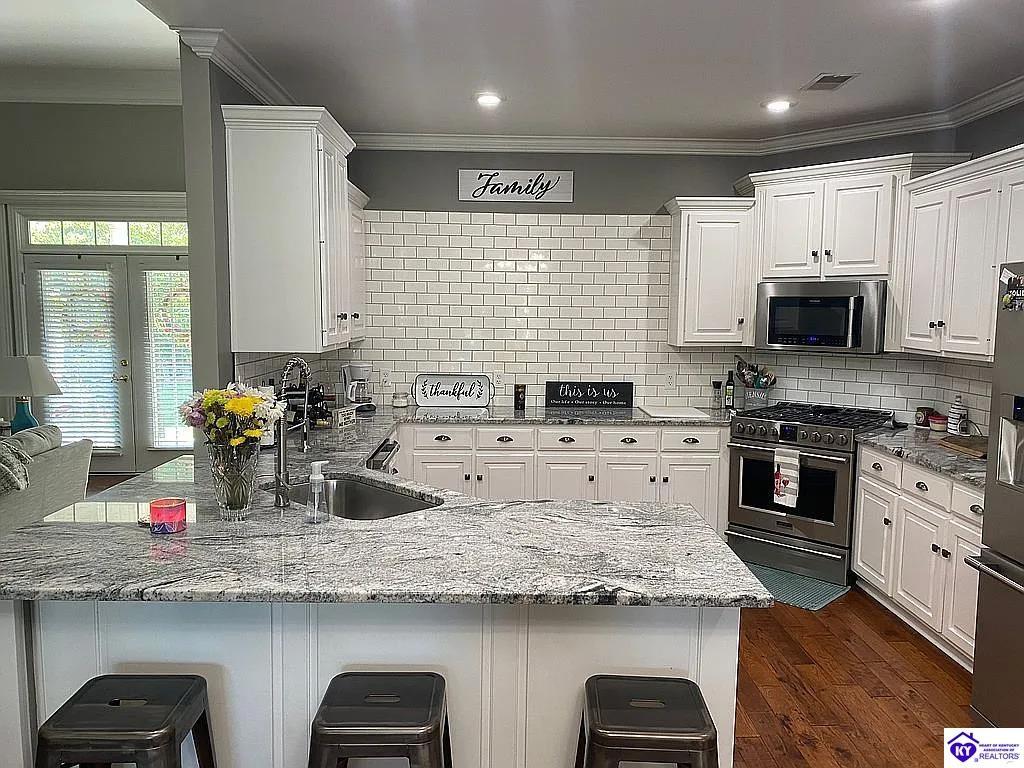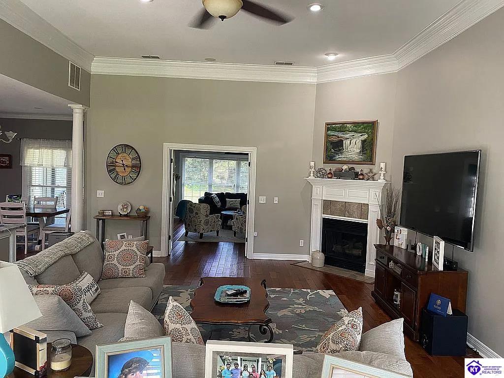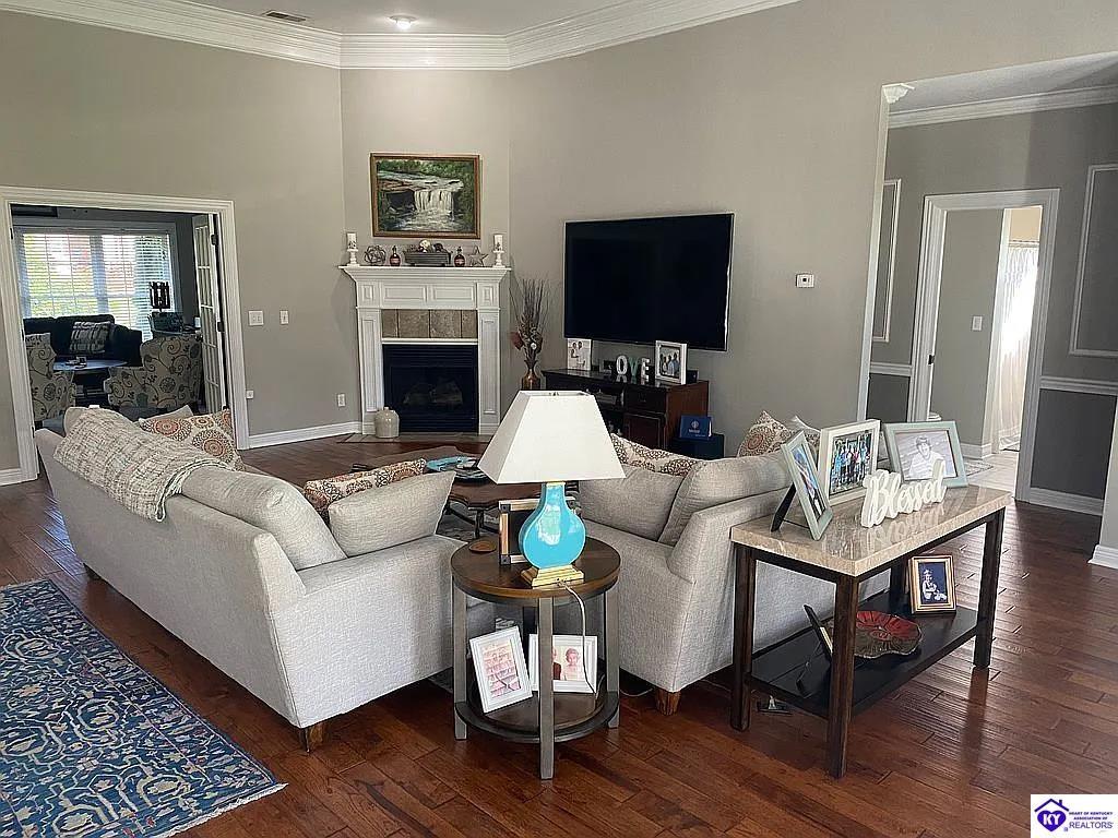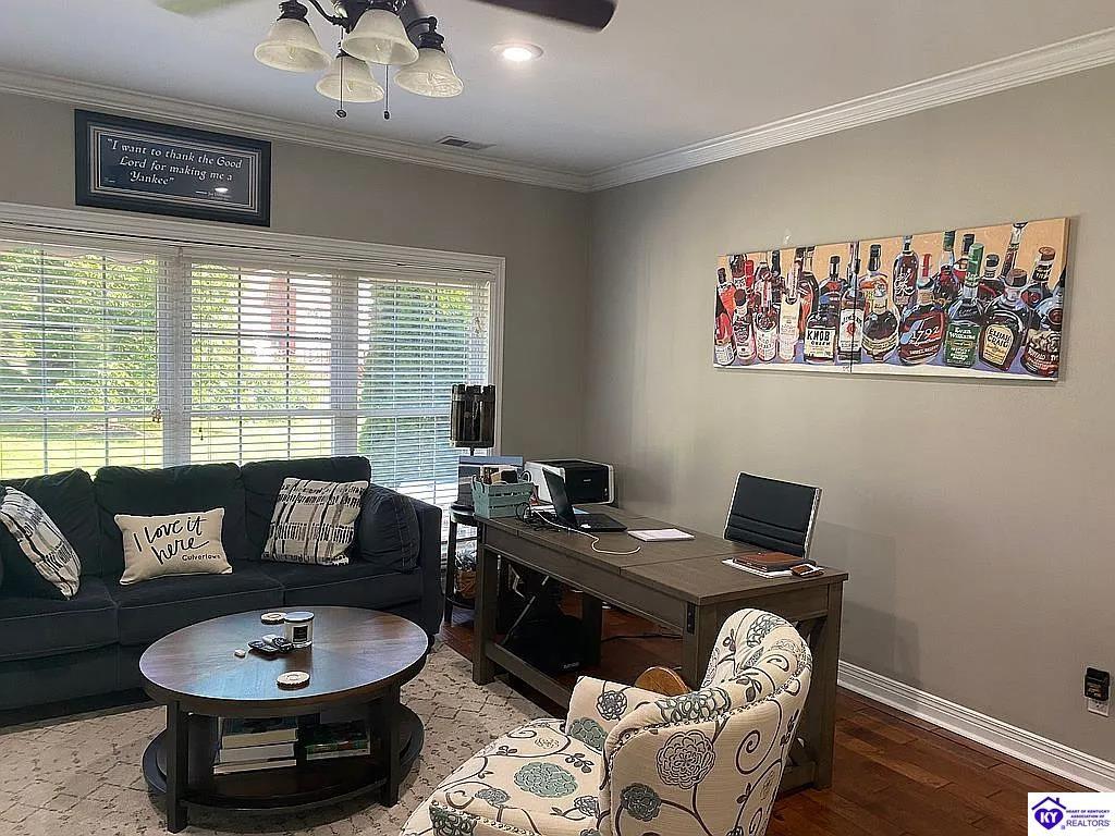 Realtor's notes: NEW HVAC and NEW BEDROOM CARPET. Discover the charm and sophistication of this exquisitely remodeled 2,466 sq ft residence, nestled in the heart of bourbon country's most sought-after neighborhood. This home offers four spacious bedrooms, with the potential for a fifth, thanks to a versatile office space. Revel in the luxury of 2.5 beautifully appointed bathrooms, complete with double vanities in the full baths, master bath complete with custom walk-in shower, and garden tub. The modern kitchen is a chef's dream, featuring stainless-steel appliances, custom cabinets, and stunning granite countertops. Enjoy the seamless blend of engineered hardwood, tile, and new carpet flooring throughout, while tall ceilings and elegant crown molding enhance the home's grandeur. Stay comfortable year-round with the new HVAC system and efficient tankless water heater. Relax inside by the cozy gas fireplace. Relax outside under the electric awning or under the mature shade trees surrounding the property. A comprehensive camera system ensures peace of mind, while the washer and dryer remain for your convenience. Experience refined living in this captivating home where every detail delights.