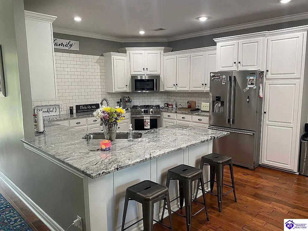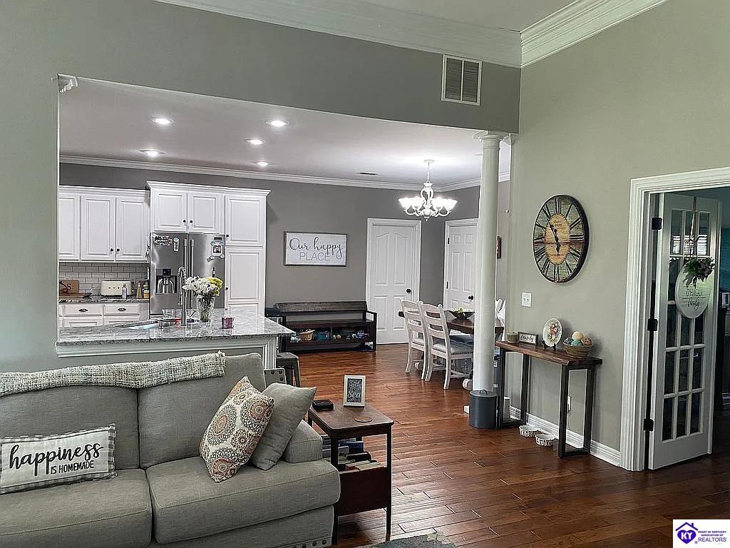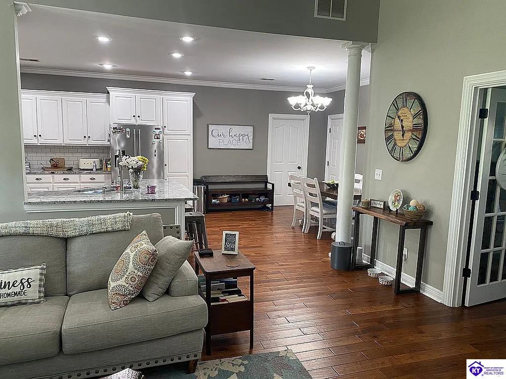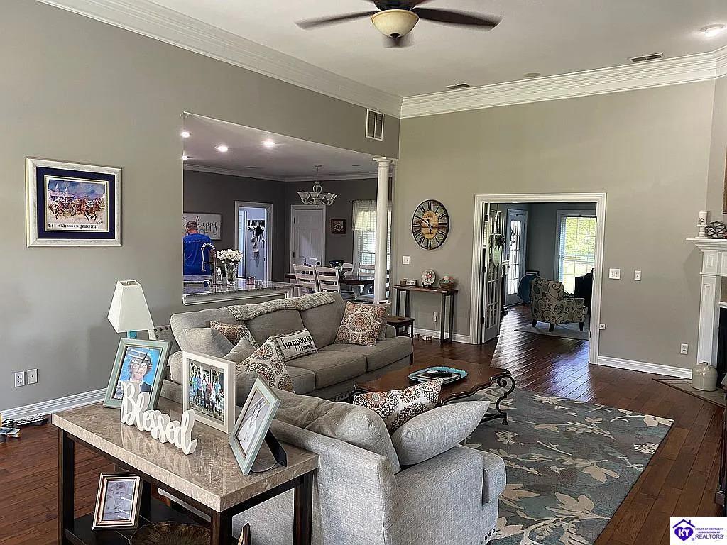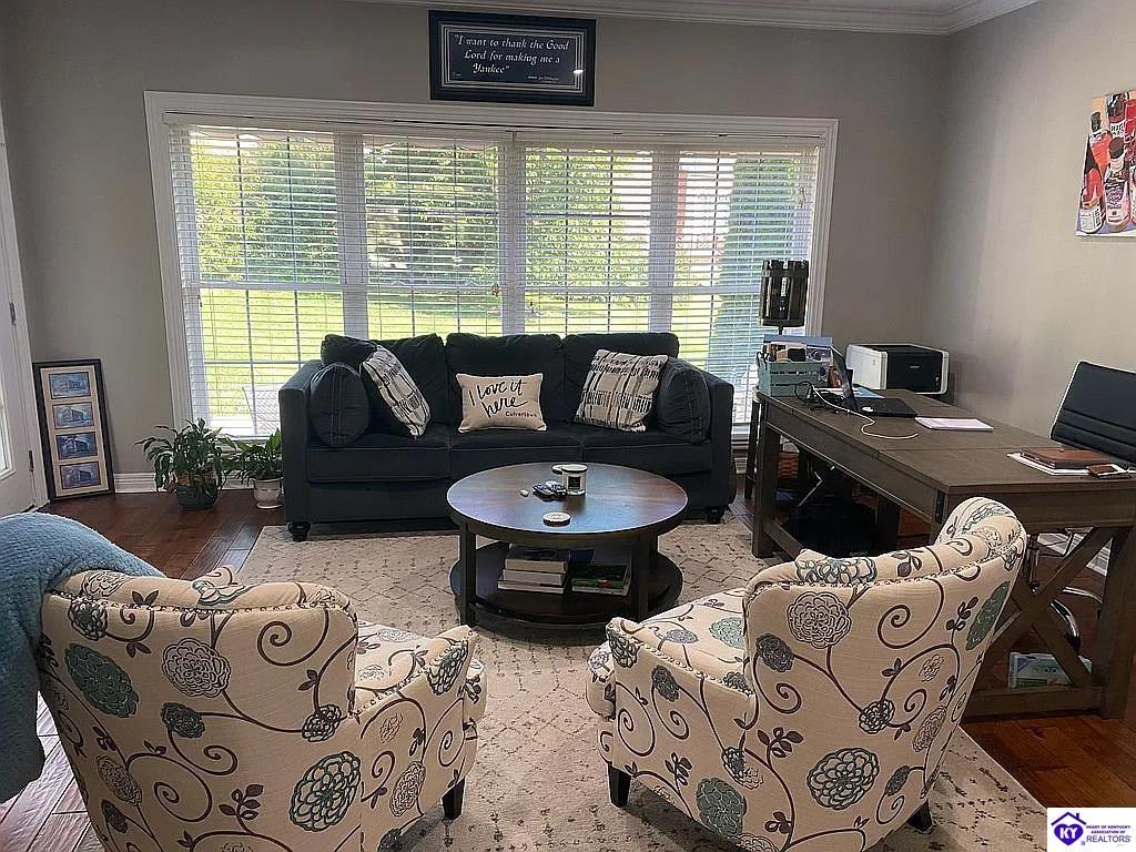 Realtor's notes: NEW HVAC and NEW BEDROOM CARPET. Discover the charm and sophistication of this exquisitely remodeled 2,466 sq ft residence, nestled in the heart of bourbon country's most sought-after neighborhood. This home offers four spacious bedrooms, with the potential for a fifth, thanks to a versatile office space. Revel in the luxury of 2.5 beautifully appointed bathrooms, complete with double vanities in the full baths, master bath complete with custom walk-in shower, and garden tub. The modern kitchen is a chef's dream, featuring stainless-steel appliances, custom cabinets, and stunning granite countertops. Enjoy the seamless blend of engineered hardwood, tile, and new carpet flooring throughout, while tall ceilings and elegant crown molding enhance the home's grandeur. Stay comfortable year-round with the new HVAC system and efficient tankless water heater. Relax inside by the cozy gas fireplace. Relax outside under the electric awning or under the mature shade trees surrounding the property. A comprehensive camera system ensures peace of mind, while the washer and dryer remain for your convenience. Experience refined living in this captivating home where every detail delights.