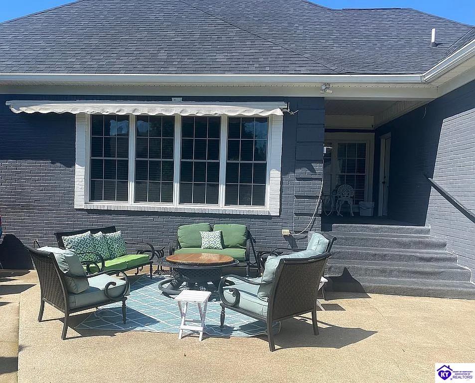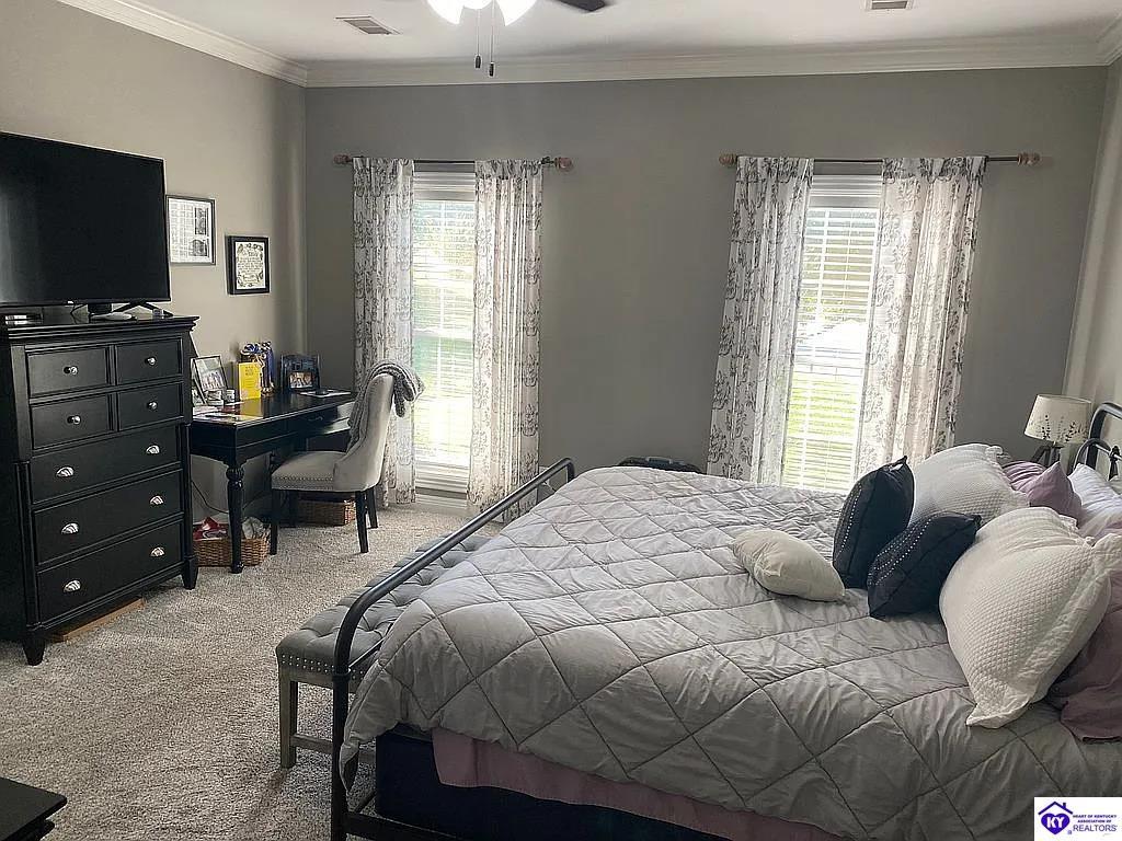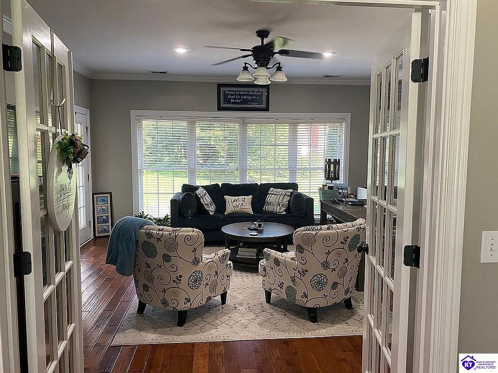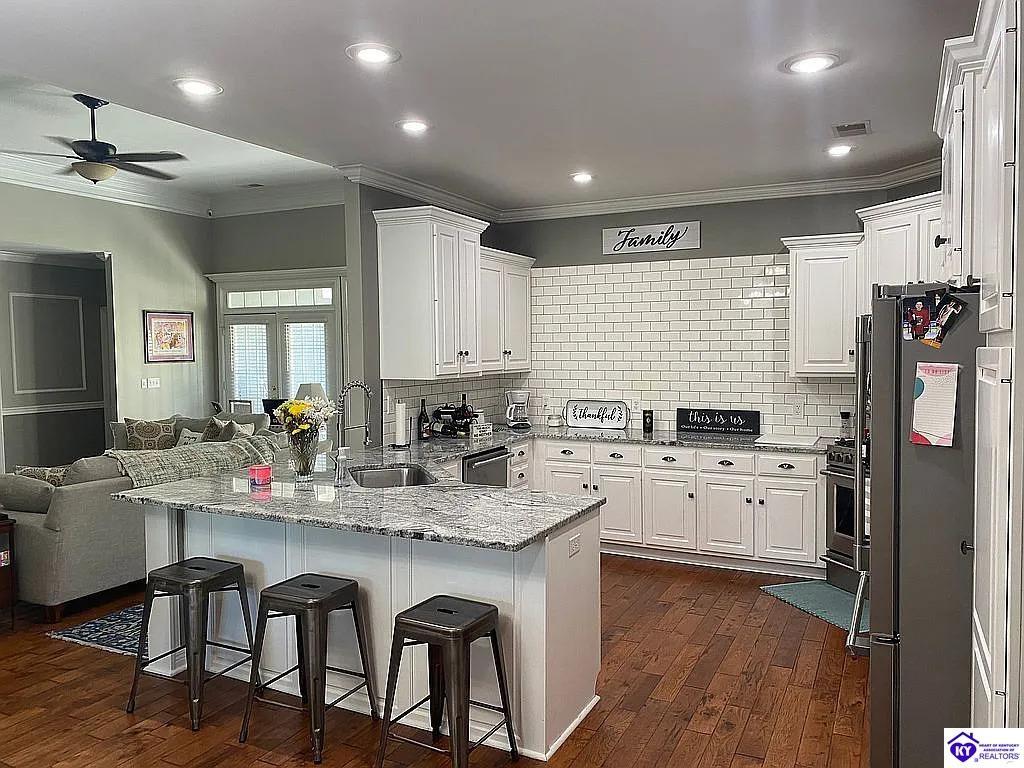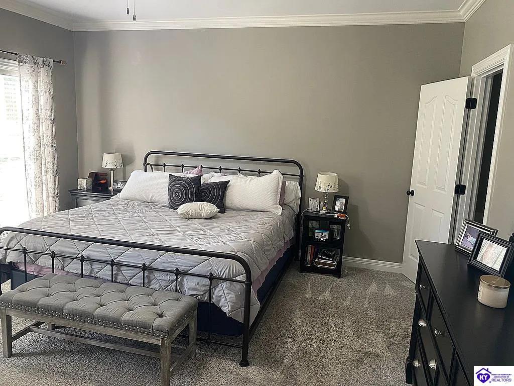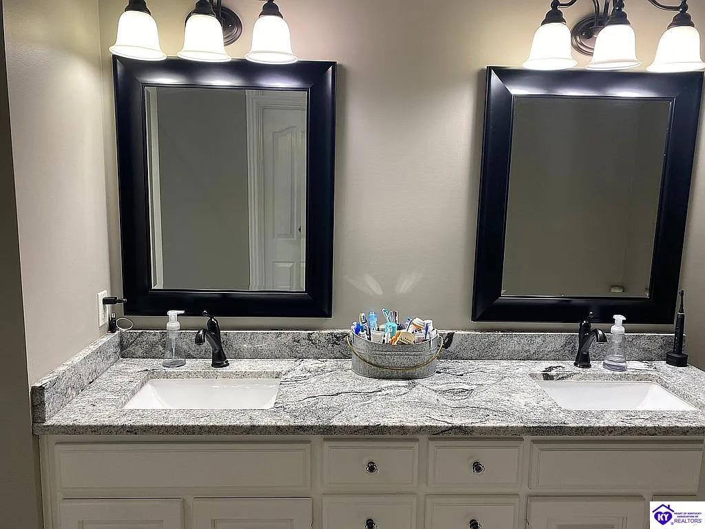 Realtor's notes: NEW HVAC and NEW BEDROOM CARPET. Discover the charm and sophistication of this exquisitely remodeled 2,466 sq ft residence, nestled in the heart of bourbon country's most sought-after neighborhood. This home offers four spacious bedrooms, with the potential for a fifth, thanks to a versatile office space. Revel in the luxury of 2.5 beautifully appointed bathrooms, complete with double vanities in the full baths, master bath complete with custom walk-in shower, and garden tub. The modern kitchen is a chef's dream, featuring stainless-steel appliances, custom cabinets, and stunning granite countertops. Enjoy the seamless blend of engineered hardwood, tile, and new carpet flooring throughout, while tall ceilings and elegant crown molding enhance the home's grandeur. Stay comfortable year-round with the new HVAC system and efficient tankless water heater. Relax inside by the cozy gas fireplace. Relax outside under the electric awning or under the mature shade trees surrounding the property. A comprehensive camera system ensures peace of mind, while the washer and dryer remain for your convenience. Experience refined living in this captivating home where every detail delights.